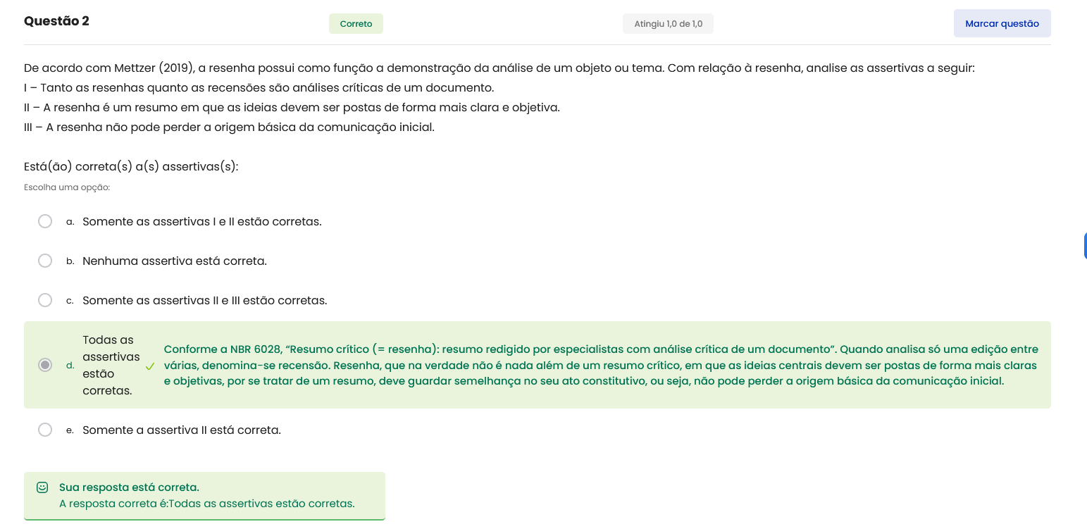 Questão 2 Correto Atingiu 1,0 de 1,0 Marcar questão De acordo com Mettzer (2019), a resenha possui como função a demonstração da análise de um objeto ou tema. Com relação à resenha, analise as assertivas a seguir: - Tanto as resenhas quanto as recensões são análises críticas de um documento. II - - A resenha é um resumo em que as devem ser postas de forma mais clara e objetiva. III - - A resenha não pode perder a origem básica da comunicação inicial. correta(s) a(s) assertivas(s): Escolha uma opção: a. Somente as assertivas e estão corretas. b. Nenhuma assertiva está correta. C. Somente as assertivas II e III estão corretas. Todas as Conforme a NBR 6028, "Resumo crítico (= resenha): resumo redigido por especialistas com análise crítica de um documento". Quando anglisa só uma edição entre assertivas d. várias, denomina-se recensão. Resenha, que na verdade não é nada glém de um resumo crítico, em que as ideias centrais devem ser postas de forma mais claras estão e objetivas, por se tratar de um resumo, deve guardar semelhança no seu ato constitutivo, ou seja, não pode perder a origem básica da comunicação inicial. corretas. Somente a assertiva II está correta. resposto está correta. A resposta correta é:Todas as assertivas estão