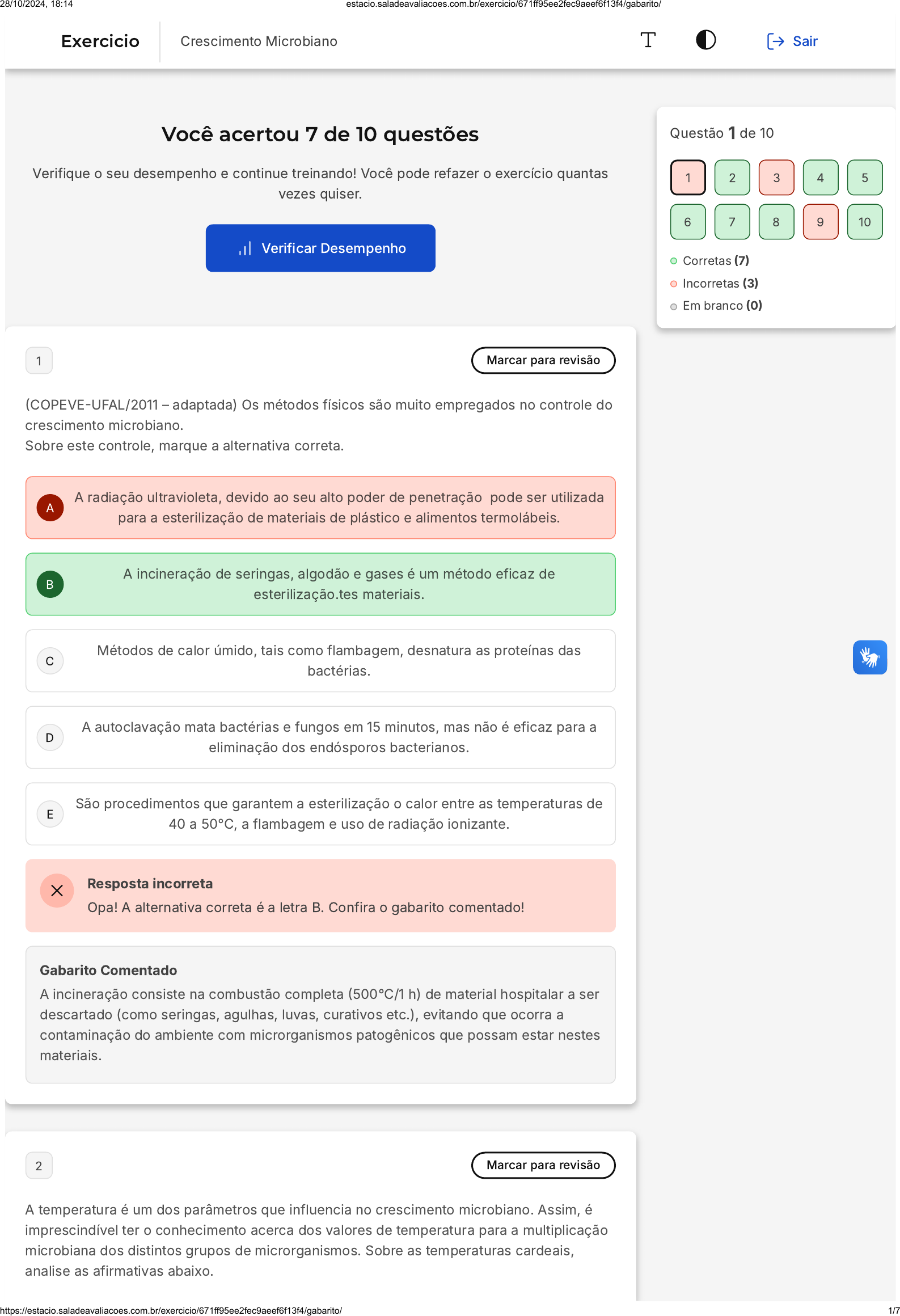 Você acertou 7 de 10 questões Verifique o seu desempenho e continue treinando! Você pode refazer o exercício quantas vezes quiser. Verificar Desempenho A B C D E 1 Marcar para revisão �COPEVE�UFAL/2011 – adaptada) Os métodos físicos são muito empregados no controle do crescimento microbiano. Sobre este controle, marque a alternativa correta. A radiação ultravioleta, devido ao seu alto poder de penetração pode ser utilizada para a esterilização de materiais de plástico e alimentos termolábeis. A incineração de seringas, algodão e gases é um método eficaz de esterilização.tes materiais. Métodos de calor úmido, tais como flambagem, desnatura as proteínas das bactérias. A autoclavação mata bactérias e fungos em 15 minutos, mas não é eficaz para a eliminação dos endósporos bacterianos. São procedimentos que garantem a esterilização o calor entre as temperaturas de 40 a 50°C, a flambagem e uso de radiação ionizante. Resposta incorreta Opa! A alternativa correta é a letra B. Confira o gabarito comentado! Gabarito Comentado A incineração consiste na combustão completa �500°C/1 h) de material hospitalar a ser descartado (como seringas, agulhas, luvas, curativos etc.), evitando que ocorra a contaminação do ambiente com microrganismos patogênicos que possam estar nestes materiais. 2 Marcar para revisão A temperatura é um dos parâmetros que influencia no crescimento microbiano. Assim, é imprescindível ter o conhecimento acerca dos valores de temperatura para a multiplicação microbiana dos distintos grupos de microrganismos. Sobre as temperaturas cardeais, analise as afirmativas abaixo. Questão 1 de 10 Corretas �7� Incorretas �3� Em branco �0� 1 2 3 4 5 6 7 8 9 10 Exercicio Crescimento Microbiano Sair 28/10/2024, 18:14 estacio.saladeavaliacoes.com.br/exercicio/671ff95ee2fec9aeef6f13f4/gabarito/ https://estacio.saladeavaliacoes.com.br/exercicio/671ff95ee2fec9aeef6f13f4/gabarito/ 1/7 A B C D E A B C I � A temperatura ótima de crescimento é a temperatura mais favorável ao crescimento dos microrganismos, nela as populações crescem e se desenvolvem mais rapidamente. II � As temperaturas ótimas são sempre as mesmas para todos os microrganismos. III � As grandes amplitudes de temperaturas não têm muita influência no crescimento microbiano. Marque a alternativa que apresenta a(s) afirmativa(s) correta(s). As afirmativas I, II e III estão corretas. Apenas as afirmativas I e III estão corretas. Apenas as afirmativas I e II estão corretas. Apenas as afirmativas II e III estão corretas. Apenas a afirmativa I está correta. Resposta correta Parabéns, você selecionou a alternativa correta. Confira o gabarito comentado! Gabarito Comentado As afirmativas II e III estão incorretas pois temperatura mínima de crescimento, temperatura ótima de crescimento e temperatura máxima de crescimento representa as temperaturas cardeais dos microrganismos, que podem ser muito diferentes entre as espécies; existem microrganismos com temperatura ótima de crescimento de 0°C e outros que têm temperatura ótima acima de 100°C, por exemplo. 3 Marcar para revisão �CESPE / CEBRASPE /2016 – adaptada) Os métodos de controle do crescimento microbiano visam inibir o crescimento, reduzir ou eliminar populações microbianas de determinado ambiente. Considerando os métodos de controle do crescimento microbiano, assinale a opção correta. O tratamento com formaldeído, um método de controle químico, é eficaz para eliminar o potencial tóxico de endotoxinas, mas não reduz a toxicidade de exotoxinas. A esterilização por autoclavagem e por filtração são metodologias eficientes para eliminar os riscos de toxinas em soluções injetáveis, como medicamentos endovenosos. Exotoxinas presentes em bactérias gram-positivas dos gêneros Bacillus e Clostridium são problemas em contaminações de alimentos enlatados porque não são inativadas nos processos de pasteurização. 28/10/2024, 18:14 estacio.saladeavaliacoes.com.br/exercicio/671ff95ee2fec9aeef6f13f4/gabarito/ https://estacio.saladeavaliacoes.com.br/exercicio/671ff95ee2fec9aeef6f13f4/gabarito/ 2/7 D E A B C D E Métodos de controle físicos, baseados em produtos químicos, podem lisar bactérias liberando endotoxinas, endotoxinas essas que, por serem resistentes ao calor, constituem risco potencial, mesmo em líquidos esterilizados por produtos químicos. A esterilização é a eliminação de todos os microrganismos de uma amostra, objeto ou superfície, exterminando qualquer tipo de vida. Resposta incorreta Opa! A alternativa correta é a letra E. Confira o gabarito comentado! Gabarito Comentado Esterilização - Refere-se à eliminação total dos microrganismos. Assim, um objeto ou uma solução estéril não apresenta nenhuma forma de vida. 4 Marcar para revisão O aumento do número de células de uma população de microrganismos corresponde ao crescimento microbiano. Em cultura, o crescimento microbiano envolve diferentes fases, como por exemplo: I. Fase estacionária: não ocorre aumento nem diminuição do número de células. II. Fase log: momento de divisão celular ativa e crescimento intenso. III. Fase de declínio: o número de células que morrem é maior que o número de células que se multiplicam. IV. Fase lag: as células estão se preparando para a divisão celular, aumentando em tamanho, mas não em número. Marque a alternativa que indica a ordem correta das fases da curva de crescimento microbiano. IV � II � I � III I � II � III � IV IV � III � I � II I � IV � II � III II � IV � III � IV Resposta correta Parabéns, você selecionou a alternativa correta. Confira o gabarito comentado! Gabarito Comentado A sequência correta das fases de crescimento microbiano é: IV � II � I � III. Isso significa que, inicialmente, na fase lag �IV�, as células se preparam para a divisão celular, aumentando em tamanho, mas não