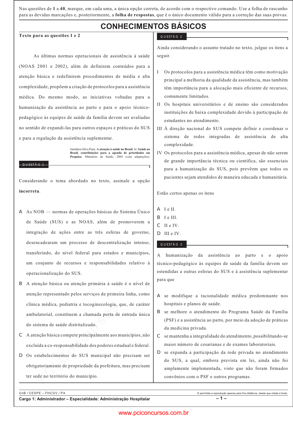 pcimarkpci MDAwMDowMDAwOjAwMDA6MDAwMDowMDAwOmZmZmY6YjM2YjpmZWEz:U3VuLCAxNyBOb3YgMjAyNCAwOTowMjowOCAtMDMwMA== www.pciconcursos.com.br UnB / CESPE – FHCGV / PA É permitida a reprodução apenas para fins didáticos, desde que citada a fonte. Cargo 1: Administrador – Especialidade: Administração Hospitalar – 1 – Nas questões de 1 a 40, marque, em cada uma, a única opção correta, de acordo com o respectivo comando. Use a folha de rascunho para as devidas marcações e, posteriormente, a folha de respostas, que é o único documento válido para a correção das suas provas. CONHECIMENTOS BÁSICOS Texto para as questões 1 e 2 As últimas normas operacionais de assistência à saúde (NOAS 2001 e 2002), além de definirem conteúdos para a atenção básica e redefinirem procedimentos de média e alta complexidade, propõem a criação de protocolos para a assistência médica. Do mesmo modo, as iniciativas voltadas para a humanização da assistência ao parto e para o apoio técnico- pedagógico às equipes de saúde da família devem ser avaliadas no sentido de expandi-las para outros espaços e práticas do SUS e para a regulação da assistência suplementar. Jairnilson Silva Paim. A atenção à saúde no Brasil. In: Saúde no Brasil, contribuições para a agenda de prioridades em Pesquisa. Ministério da Saúde, 2004 (com adaptações). QUESTÃO 1 Considerando o tema abordado no texto, assinale a opção incorreta. A As NOB — normas de operações básicas do Sistema Único de Saúde (SUS) e as NOAS, além de promoverem a integração de ações entre as três esferas de governo, desencadearam um processo de descentralização intenso, transferindo, do nível federal para estados e municípios, um conjunto de recursos e responsabilidades relativo à operacionalização do SUS. B A atenção básica ou atenção primária à saúde é o nível de atenção representado pelos serviços de primeira linha, como clínica médica, pediatria e tocoginecologia, que, de caráter ambulatorial, constituem a chamada porta de entrada única do sistema de saúde distritalizado. C A atenção básica compete principalmente aos municípios, não excluída a co-responsabilidade dos poderes estadual e federal. D Os estabelecimentos do SUS municipal não precisam ser obrigatoriamente de propriedade da prefeitura, mas precisam ter sede no território do município. QUESTÃO 2 Ainda considerando o assunto tratado no texto, julgue os itens a seguir. I Os protocolos para a assistência médica têm como motivação principal a melhoria da qualidade da assistência, mas também têm importância para a alocação mais eficiente de recursos, comumente limitados. II Os hospitais universitários e de ensino são considerados instituições de baixa complexidade devido à participação de estudantes no atendimento. III À direção nacional do SUS compete definir e coordenar o sistema de redes integradas de assistência de alta complexidade. IV Os protocolos para a assistência médica, apesar de não serem de grande importância técnica ou científica, são essenciais para a humanização do SUS, pois prevêem que todos os pacientes sejam atendidos de maneira educada e humanitária. Estão certos apenas os itens A I e II. B I e III. C II e IV. D III e IV. QUESTÃO 3 A humanização da assistência ao parto e o apoio técnico-pedagógico às equipes de saúde da família devem ser estendidas a outras esferas do SUS e à assistência suplementar para que A se modifique a racionalidade médica predominante nos hospitais e planos de saúde. B se melhore o atendimento do Programa Saúde da Família (PSF) e a assistência ao parto, por meio da adoção de práticas da medicina privada. C se mantenha a integralidade do atendimento, possibilitando-se maior número de cesarianas e de exames laboratoriais. D se expanda a participação da rede privada no atendimento do SUS, a qual, embora prevista em lei, ainda não foi amplamente implementada, visto que não foram firmados convênios com o PSF e outros programas. www.pciconcursos.com.br pcimarkpci MDAwMDowMDAwOjAwMDA6MDAwMDowMDAwOmZmZmY6YjM2YjpmZWEz:U3VuLCAxNyBOb3YgMjAyNCAwOTowMjowOCAtMDMwMA== www.pciconcursos.com.br UnB / CESPE – FHCGV / PA É permitida a reprodução apenas para fins didáticos, desde que citada a fonte. Cargo 1: Administrador – Especialidade: Administração Hospitalar – 2 – QUESTÃO 4 A respeito da situação atual da saúde no Brasil, assinale a opção incorreta. A O programa DST/AIDS do Ministério da Saúde, reconhecido internacionalmente, depende de acordos com laboratórios multinacionais para a obtenção de preços menores de alguns fármacos. B Apesar de se ter conseguido o controle de algumas doenças infectocontagiosas, houve a recorrência de outras, como a da tuberculose e a da cólera. C Em algumas regiões do país, ainda há problemas de subnutrição; em outras, no entanto, a obesidade vem-se tornando um problema de saúde pública. D Os remédios genéricos tornaram o país auto-suficiente na produção de medicamentos e vacinas necessários à atenção básica à saúde da população. QUESTÃO 5 Com a aprovação pelo Congresso Nacional da Lei de Biossegurança, observam-se reações opostas dos Ministérios da Saúde e do Meio Ambiente. Acerca da Lei de Biossegurança, julgue os seguintes itens. I A pesquisa com células-tronco, apesar do grande risco que representa para o meio ambiente, tem-se mostrado promissora com relação à recuperação de doenças consideradas incuráveis. II O fato de a lei tratar, simultaneamente, da pesquisa com células-tronco e da liberação do plantio de transgênicos aumentou o número de pessoas contrárias à aprovação da referida lei. III Apesar de já ocorrer, há muitos anos, em vários países, o plantio de transgênicos envolve riscos, ainda não completamente avaliados, à saúde e ao meio ambiente. Tais riscos, no entanto, são considerados pela maioria dos