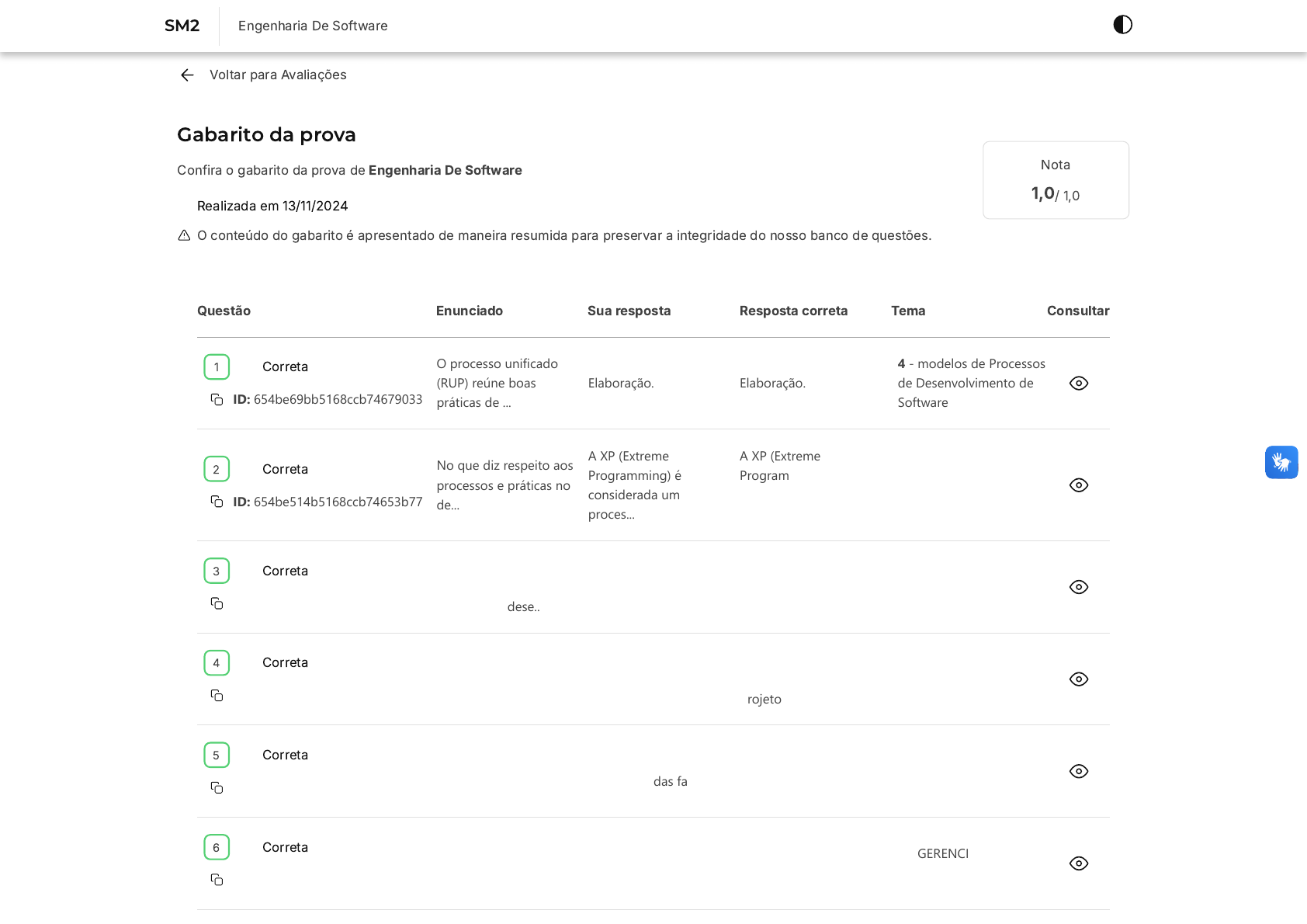 Voltar para Avaliações Gabarito da prova Confira o gabarito da prova de Engenharia De Software Realizada em 13/11/2024 Nota 1,0/ 1,0 O conteúdo do gabarito é apresentado de maneira resumida para preservar a integridade do nosso banco de questões. Questão Enunciado Sua resposta Resposta correta Tema Consultar Correta ID: 654be69bb5168ccb74679033 O processo unificado (RUP) reúne boas práticas de ... Elaboração. Elaboração. 4 - modelos de Processos de Desenvolvimento de Software Correta ID: 654be514b5168ccb74653b77 No que diz respeito aos processos e práticas no de... A XP (Extreme Programming) é considerada um proces... A XP (Extreme Programming) é considerada um proces... 4 - modelos de Processos de Desenvolvimento de Software Correta ID: 654be69bb5168ccb7467904b Considere que você trabalhe em uma empresa de dese... espiral. espiral. 4 - modelos de Processos de Desenvolvimento de Software Correta ID: 654be6c7b5168ccb7467c221 O guia PMBOK 4° edição tem uma área dedicada ao Ge... o GQP engloba o gerenciamento do projeto e o produ... o GQP engloba o gerenciamento do projeto e o produ... 5 - QUALIDADE DE SOFTWARE Correta ID: 654be6c7b5168ccb7467c233 Quanto à qualidade de software, assinale a alterna... Através da frequência e severidade das falhas. Através da frequência e severidade das falhas. 5 - QUALIDADE DE SOFTWARE Correta ID: 654be6c7b5168ccb7467c239 O conjunto de atividades destinadas a gerenciar as... configuração de software. configuração de software. 6 - GERENCIAMENTO DE CONFIGURAÇÕES 1 2 3 4 5 6 SM2 Engenharia De Software Feedback https://estacio.saladeavaliacoes.com.br/avaliacoes/ Correta ID: 658392550351156f1156abb3 Em um projeto que adota o Processo Unificado, o ge... Estabelecer a base arquitetural do sistema. Estabelecer a base arquitetural do sistema. 4 - modelos de Processos de Desenvolvimento de Software Correta ID: 6584e63a0351156f11595a7f Uma empresa de software decide implementar metodol... Scrum. Scrum. 5 - QUALIDADE DE SOFTWARE Correta ID: 6584e5960351156f11595784 Durante o desenvolvimento de um software, a equipe... ISO 9001. ISO 9001. 5 - QUALIDADE DE SOFTWARE Correta ID: 654be4efb5168ccb7464e61c Considere as seguintes afirmativas: I- Seu escopo... III, apenas. III, apenas. 6 - GERENCIAMENTO DE CONFIGURAÇÕES 7 8 9 10 Encontrou algum problema? Você pode copiar o ID da questão e abrir um requerimento. Na tela inicial do Campus Virtual �SIA�, acesse "Atendimento > Requerimento > Novo > Currículo/Aula/horário > Analisar ambiente de avaliação/exercícios"
