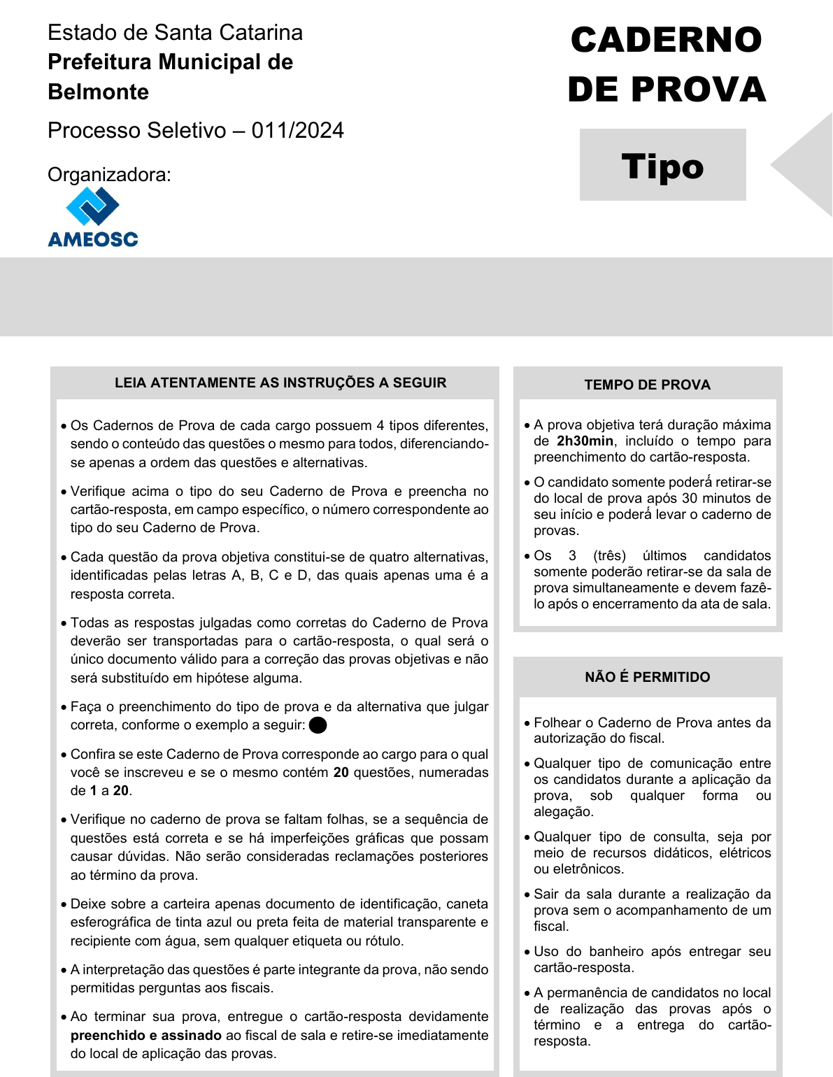 LEIA ATENTAMENTE AS INSTRUÇÕES A SEGUIR TEMPO DE PROVA • Os Cadernos de Prova de cada cargo possuem 4 tipos diferentes, sendo o conteúdo das questões o mesmo para todos, diferenciando- se apenas a ordem das questões e alternativas. • Verifique acima o tipo do seu Caderno de Prova e preencha no cartão-resposta, em campo específico, o número correspondente ao tipo do seu Caderno de Prova. • Cada questão da prova objetiva constitui-se de quatro alternativas, identificadas pelas letras A, B, C e D, das quais apenas uma é a resposta correta. • Todas as respostas julgadas como corretas do Caderno de Prova deverão ser transportadas para o cartão-resposta, o qual será o único documento válido para a correção das provas objetivas e não será substituído em hipótese alguma. • Faça o preenchimento do tipo de prova e da alternativa que julgar correta, conforme o exemplo a seguir: • Confira se este Caderno de Prova corresponde ao cargo para o qual você se inscreveu e se o mesmo contém 20 questões, numeradas de 1 a 20. • Verifique no caderno de prova se faltam folhas, se a sequência de questões está correta e se há imperfeições gráficas que possam causar dúvidas. Não serão consideradas reclamações posteriores ao término da prova. • Deixe sobre a carteira apenas documento de identificação, caneta esferográfica de tinta azul ou preta feita de material transparente e recipiente com água, sem qualquer etiqueta ou rótulo. • A interpretação das questões é parte integrante da prova, não sendo permitidas perguntas aos fiscais. • Ao terminar sua prova, entregue o cartão-resposta devidamente preenchido e assinado ao fiscal de sala e retire-se imediatamente do local de aplicação das provas. • A prova objetiva terá duração máxima de 2h30min, incluído o tempo para preenchimento do cartão-resposta. • O candidato somente poderá́ retirar-se do local de prova após 30 minutos de seu início e poderá́ levar o caderno de provas. • Os 3 (três) últimos candidatos somente poderão retirar-se da sala de prova simultaneamente e devem fazê- lo após o encerramento da ata de sala. NÃO É PERMITIDO • Folhear o Caderno de Prova antes da autorização do fiscal. • Qualquer tipo de comunicação entre os candidatos durante a aplicação da prova, sob qualquer forma ou alegação. • Qualquer tipo de consulta, seja por meio de recursos didáticos, elétricos ou eletrônicos. • Sair da sala durante a realização da prova sem o acompanhamento de um fiscal. • Uso do banheiro após entregar seu cartão-resposta. • A permanência de candidatos no local de realização das provas após o término e a entrega do cartão- resposta. CADERNO DE PROVA Tipo Estado de Santa Catarina Prefeitura Municipal de Belmonte Processo Seletivo – 011/2024 Organizadora: Operador de Equipamento Rodoviário (CNH categoria C) 1 Conhecimentos Específicos Questão 01 Em um ambiente de trabalho, a comunicação eficiente e o relacionamento interpessoal são essenciais para o bom desempenho das atividades. Qual das atitudes abaixo demonstra uma postura profissional adequada para promover uma comunicação clara e manter um tratamento respeitoso com colegas e superiores? (A) Resolver conflitos com colegas de maneira rápida e direta, sem envolver superiores, mesmo que isso gere desconforto no ambiente. (B) Sempre usar uma linguagem técnica e complexa nas reuniões, mesmo que alguns colegas tenham dificuldade em entender. (C) Demonstrar empatia e atenção ativa ao ouvir os colegas, mantendo uma postura respeitosa e evitando interrupções durante conversas. (D) Evitar perguntar dúvidas a colegas para não parecer inexperiente, buscando resolver todos os problemas por conta própria. Questão 02 De acordo com as regras de circulação e conduta para operadores de máquinas pesadas, qual das alternativas abaixo representa a atitude correta ao operar uma retroescavadeira em vias públicas? (A) A máquina pode ser utilizada em qualquer via pública, desde que o operador tenha habilitação categoria "B". (B) O operador deve usar cinto de segurança apenas em rodovias, sendo opcional em áreas urbanas. (C) É permitido conduzir a retroescavadeira em alta velocidade, desde que o operador tenha experiência. (D) O operador deve garantir que a carga transportada esteja devidamente fixada e a caçamba ou garfo esteja na posição mais baixa possível durante o transporte. Questão 03 Moyses estava deslocando numa via local do seu Município até que se deparou com uma placa de regulamentação de formato triangular com contorno vermelho e fundo branco. O nome da placa em questão é: (A) Cuidado. (B) Dê a preferência. (C) Pare. (D) Siga com cuidado. Questão 04 Assinale qual das máquinas abaixo é mais recomendada em serviços de pavimentação, mais especificamente na etapa de compactação da camada de massa asfáltica. (A) Rolo compactador. (B) Vibroacabadora. (C) Patrol. (D) Caminhão espargidor. Questão 05 Camila é operadora de retroescavadeira em vias públicas e renovou sua carteira D com 35 anos. Assim, pode-se afirmar que ela deverá renovar sua carteira com: (A) 38 anos. (B) 37 anos. (C) 40 anos. (D) 45 anos. Questão 06 Marquinhos precisará de uma máquina para auxiliar na descida de tubos de concreto armado para execução de uma galeria de águas pluviais. A máquina mais apropriada para esse serviço dentre as apresentadas abaixo é a: (A) Rolo compactador. (B) Escavadeira hidráulica. (C) Motoniveladora. (D) Extrusora. Questão 07 Lucas está trafegando em uma via arterial,ele não avistou nenhuma placa de trânsito indicando a velocidade máxima permitida, sendo assim, ele concluiu que a velocidade máxima nesta via é de: (A) 40 km/h. (B) 60 km/h. (C) 80 km/h. (D) 30 km/h. Questão 08 A manutenção preventiva de máquinas rodoviárias é fundamental para garantir o funcionamento adequado e prolongar a vida útil dos equipamentos. Durante a execu