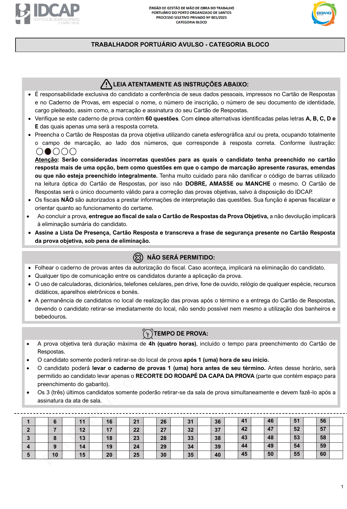 pcimarkpci MDAwMDowMDAwOjAwMDA6MDAwMDowMDAwOmZmZmY6Y2U1MTowMDky:V2VkLCAwNiBOb3YgMjAyNCAyMjoxMTowMyAtMDMwMA== www.pciconcursos.com.br LEIA ATENTAMENTE AS INSTRUÇÕES ABAIXO: • É responsabilidade exclusiva do candidato a conferência de seus dados pessoais, impressos no Cartão de Respostas e no Caderno de Provas, em especial o nome, o número de inscrição, o número de seu documento de identidade, cargo pleiteado, assim como, a marcação e assinatura do seu Cartão de Respostas. • Verifique se este caderno de prova contém 60 questões. Com cinco alternativas identificadas pelas letras A, B, C, D e E das quais apenas uma será a resposta correta. • Preencha o Cartão de Respostas da prova objetiva utilizando caneta esferográfica azul ou preta, ocupando totalmente o campo de marcação, ao lado dos números, que corresponde à resposta correta. Conforme ilustração: Atenção: Serão consideradas incorretas questões para as quais o candidato tenha preenchido no cartão resposta mais de uma opção, bem como questões em que o campo de marcação apresente rasuras, emendas ou que não esteja preenchido integralmente. Tenha muito cuidado para não danificar o código de barras utilizado na leitura óptica do Cartão de Respostas, por isso não DOBRE, AMASSE ou MANCHE o mesmo. O Cartão de Respostas será o único documento válido para a correção das provas objetivas, salvo à disposição do IDCAP. • Os fiscais NÃO são autorizados a prestar informações de interpretação das questões. Sua função é apenas fiscalizar e orientar quanto ao funcionamento do certame. • Ao concluir a prova, entregue ao fiscal de sala o Cartão de Respostas da Prova Objetiva, a não devolução implicará à eliminação sumária do candidato. • Assine a Lista De Presença, Cartão Resposta e transcreva a frase de segurança presente no Cartão Resposta da prova objetiva, sob pena de eliminação. NÃO SERÁ PERMITIDO: • Folhear o caderno de provas antes da autorização do fiscal. Caso aconteça, implicará na eliminação do candidato. • Qualquer tipo de comunicação entre os candidatos durante a aplicação da prova. • O uso de calculadoras, dicionários, telefones celulares, pen drive, fone de ouvido, relógio de qualquer espécie, recursos didáticos, aparelhos eletrônicos e bonés. • A permanência de candidatos no local de realização das provas após o término e a entrega do Cartão de Respostas, devendo o candidato retirar-se imediatamente do local, não sendo possível nem mesmo a utilização dos banheiros e bebedouros. TEMPO DE PROVA: • A prova objetiva terá duração máxima de 4h (quatro horas), incluído o tempo para preenchimento do Cartão de Respostas. • O candidato somente poderá́ retirar-se do local de prova após 1 (uma) hora de seu início. • O candidato poderá́ levar o caderno de provas 1 (uma) hora antes de seu término. Antes desse horário, será permitido ao candidato levar apenas o RECORTE DO RODAPÉ DA CAPA DA PROVA (parte que contém espaço para preenchimento do gabarito). • Os 3 (três) últimos candidatos somente poderão retirar-se da sala de prova simultaneamente e devem fazê-lo após a assinatura da ata de sala. 1 6 11 16 21 26 31 36 41 46 51 56 2 7 12 17 22 27 32 37 42 47 52 57 3 8 13 18 23 28 33 38 43 48 53 58 4 9 14 19 24 29 34 39 44 49 54 59 5 10 15 20 25 30 35 40 45 50 55 60 TRABALHADOR PORTUÁRIO AVULSO - CATEGORIA BLOCO 1 pcimarkpci MDAwMDowMDAwOjAwMDA6MDAwMDowMDAwOmZmZmY6Y2U1MTowMDky:V2VkLCAwNiBOb3YgMjAyNCAyMjoxMTowMyAtMDMwMA== www.pciconcursos.com.br RASCUNHO 2 pcimarkpci MDAwMDowMDAwOjAwMDA6MDAwMDowMDAwOmZmZmY6Y2U1MTowMDky:V2VkLCAwNiBOb3YgMjAyNCAyMjoxMTowMyAtMDMwMA== www.pciconcursos.com.br Língua Portuguesa O texto seguinte servirá de base para responder às questões de 1 a 6. Sustentabilidade portuária: uma análise da ecoeficiência alinhada ao desempenho operacional O transporte marítimo representa um dos pilares de sustentação da economia mundial, respondendo por cerca de 80% do comércio internacional. Em 2021, período pós pandemia, houve um aumento de 4,3% no comércio marítimo, resultando em um aumento total de atracações nos portos (UNCTAD, 2021). A consequência desse aumento nas operações marítimas e portuárias, registradas desde 2010, resultaram, além da modernização das embarcações, na necessidade de ampliação e adequação das instalações portuárias, com canais mais profundos, equipamentos mais ágeis, aumento da tecnologia, entre outros. Em que pese o fato desses recursos terem se tornado mais eficientes, em paralelo, ocorreu também um crescimento contínuo das emissões totais de gases de efeito estufa (GEE) decorrente do maior uso de embarcações, maior número de dragagens e aumento no consumo de energia (PUIG; WOOLDRIDGE; DARBRA, 2014;UNCTAD, 2021). Alguns estudos reconhecem que o desenvolvimento do setor portuário contribui para o crescimento econômico regional, por meio da geração de empregos diretos e indiretos (CALISKAN, 2022;VADAKKEPATT et al., 2021). No entanto, as operações portuárias podem gerar consequências adversas ao meio ambiente, impactando o ar, água e solo, afetando ambientes terrestres e marinhos (ARGYRIOU; DARAS; TSOUTSOS, 2022;FERRARIO et al., 2021) . Em complemento, King e Atkins (2017) descrevem que os resultados financeiros que outrora demonstravam sucesso na captação de investimentos, hoje sozinhos não são suficientes, pois as empresas precisam estar alinhadas aos princípios de desenvolvimento sustentável, para aumentar suas possibilidades em atrair novos investimentos. Assim, a consciência ambiental tem se tornado um diferencial competitivo para os diversos setores da economia, incluindo os portos. Desde o início do anos 1980, Wbatuba (2022) aponta para o crescimento gradativo daV. Questão 44 (Correta: D) A Lei nº 9.719/1998 fixou as normas e condições gerais de proteção ao trabalho portuário, bem como instituiu multas pe