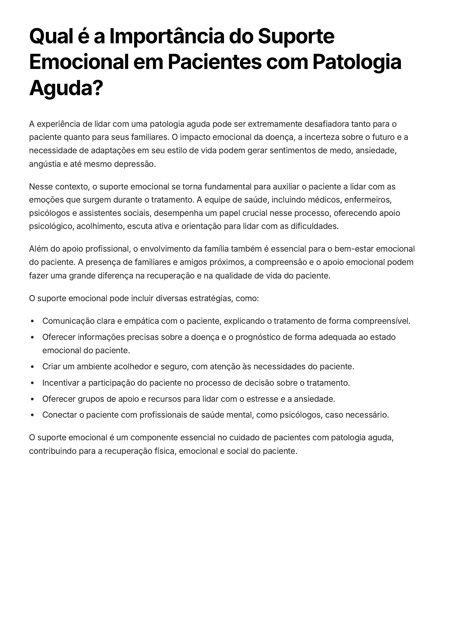 Qual é a Importância do Suporte Emocional em Pacientes com Patologia Aguda? A experiência de lidar com uma patologia aguda pode ser extremamente desafiadora tanto para o paciente quanto para seus familiares. O impacto emocional da doença, a incerteza sobre o futuro e a necessidade de adaptações em seu estilo de vida podem gerar sentimentos de medo, ansiedade, angústia e até mesmo depressão. Nesse contexto, o suporte emocional se torna fundamental para auxiliar o paciente a lidar com as emoções que surgem durante o tratamento. A equipe de saúde, incluindo médicos, enfermeiros, psicólogos e assistentes sociais, desempenha um papel crucial nesse processo, oferecendo apoio psicológico, acolhimento, escuta ativa e orientação para lidar com as dificuldades. Além do apoio profissional, o envolvimento da família também é essencial para o bem-estar emocional do paciente. A presença de familiares e amigos próximos, a compreensão e o apoio emocional podem fazer uma grande diferença na recuperação e na qualidade de vida do paciente. O suporte emocional pode incluir diversas estratégias, como: Comunicação clara e empática com o paciente, explicando o tratamento de forma compreensível. Oferecer informações precisas sobre a doença e o prognóstico de forma adequada ao estado emocional do paciente. Criar um ambiente acolhedor e seguro, com atenção às necessidades do paciente. Incentivar a participação do paciente no processo de decisão sobre o tratamento. Oferecer grupos de apoio e recursos para lidar com o estresse e a ansiedade. Conectar o paciente com profissionais de saúde mental, como psicólogos, caso necessário. O suporte emocional é um componente essencial no cuidado de pacientes com patologia aguda, contribuindo para a recuperação física, emocional e social do paciente. Como estabelecer uma comunicação efetiva com pacientes e familiares? A comunicação clara e empática é fundamental no cuidado de pacientes com patologia aguda. É essencial que a equipe de saúde estabeleça um diálogo aberto e transparente com o paciente e seus familiares, transmitindo informações sobre o estado de saúde, os procedimentos a serem realizados, os riscos e benefícios do tratamento, e as expectativas para a recuperação. A comunicação eficiente envolve a escuta ativa, a capacidade de explicar termos médicos de forma clara e concisa, o uso de linguagem adequada ao nível de compreensão do paciente e familiar, e a demonstração de respeito e empatia. É importante que a equipe de saúde demonstre que está realmente interessada no bem-estar do paciente e que está disposta a responder às suas dúvidas e preocupações. A comunicação com o paciente e a família deve ser contínua, com informações atualizadas sobre a evolução do quadro clínico. É importante que a equipe de saúde mantenha a família informada sobre os procedimentos realizados, os resultados dos exames, as possíveis complicações e as medidas de segurança que estão sendo tomadas. A comunicação efetiva é um fator crucial para o sucesso do tratamento e a recuperação do paciente. Uma comunicação clara e transparente ajuda a reduzir o estresse, aumenta a confiança na equipe de saúde, e promove a participação ativa do paciente e da família no processo de cuidado. Como a família pode participar nos cuidados do paciente? O envolvimento da família nos cuidados do paciente com patologia aguda é fundamental para a recuperação e bem-estar do indivíduo. A família pode fornecer suporte emocional, físico e prático, além de contribuir para a adesão ao tratamento e a prevenção de complicações. Suporte Emocional: A presença da família durante o período de internação proporciona conforto, segurança e esperança ao paciente. A família pode oferecer palavras de conforto, incentivo e carinho, o que é essencial para lidar com o estresse, a ansiedade e a dor. Ajuda Prática: A família pode auxiliar nas tarefas do dia a dia, como alimentação, higiene pessoal e mobilização do paciente. Isso libera a equipe médica para se concentrar nos aspectos clínicos do tratamento. Além disso, a família pode fornecer informações importantes sobre o histórico médico do paciente. Participação no Tratamento: A família pode ser envolvida no processo de decisão sobre o tratamento, compreendendo os riscos e benefícios de cada opção. O conhecimento e a participação da família no tratamento aumentam a adesão às medicações, aos cuidados domiciliares e à reabilitação. Comunicação Eficaz: A família é um importante elo de comunicação entre o paciente e a equipe de saúde. Ao manter um diálogo aberto e transparente, a família pode esclarecer dúvidas, fornecer informações e garantir que as necessidades do paciente sejam atendidas. A participação da família é essencial para o sucesso do tratamento de pacientes com patologia aguda, promovendo a recuperação rápida, a prevenção de complicações e a melhor qualidade de vida.