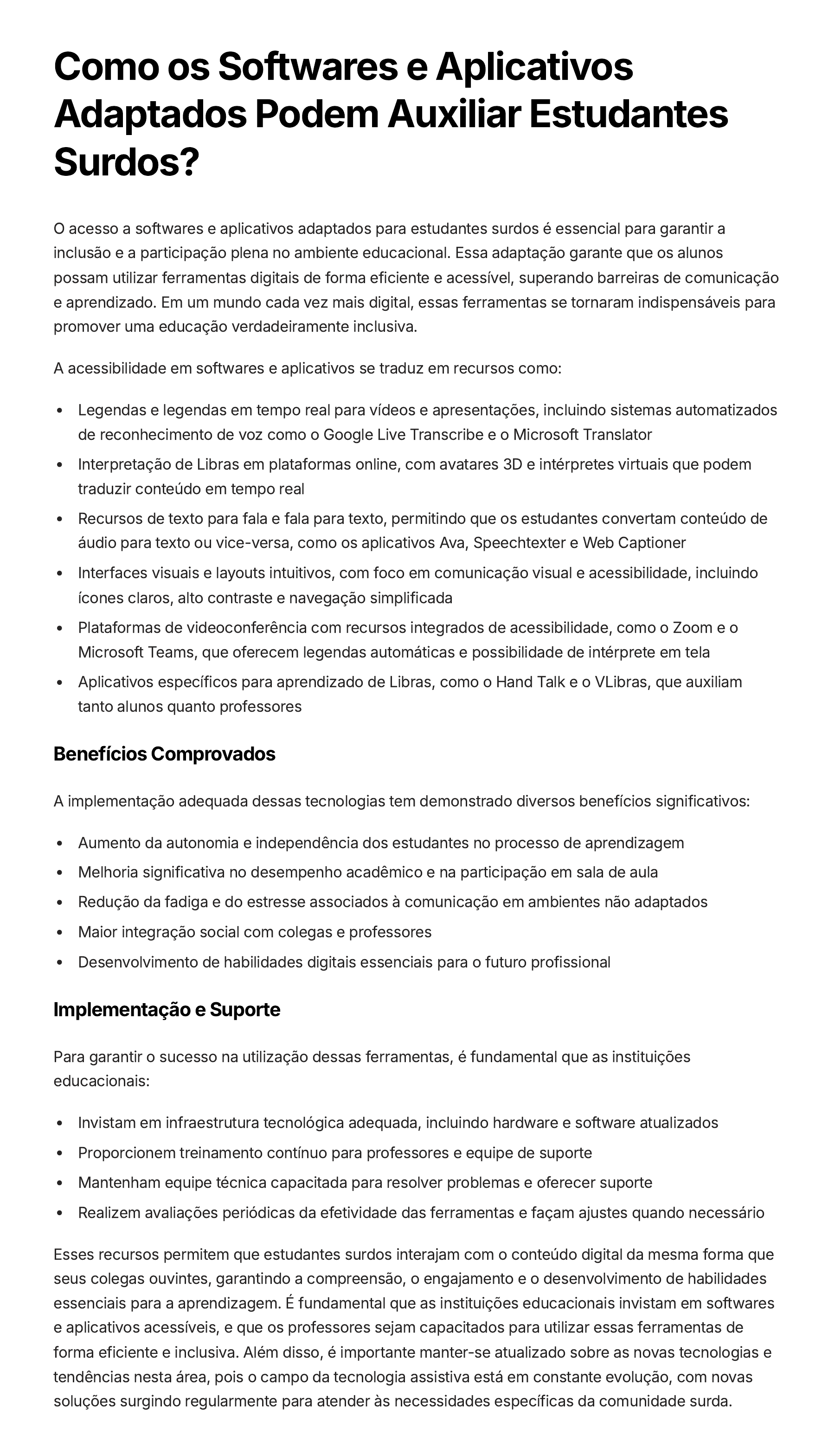 Como os Softwares e Aplicativos Adaptados Podem Auxiliar Estudantes Surdos? O acesso a softwares e aplicativos adaptados para estudantes surdos é essencial para garantir a inclusão e a participação plena no ambiente educacional. Essa adaptação garante que os alunos possam utilizar ferramentas digitais de forma eficiente e acessível, superando barreiras de comunicação e aprendizado. Em um mundo cada vez mais digital, essas ferramentas se tornaram indispensáveis para promover uma educação verdadeiramente inclusiva. A acessibilidade em softwares e aplicativos se traduz em recursos como: Legendas e legendas em tempo real para vídeos e apresentações, incluindo sistemas automatizados de reconhecimento de voz como o Google Live Transcribe e o Microsoft Translator Interpretação de Libras em plataformas online, com avatares 3D e intérpretes virtuais que podem traduzir conteúdo em tempo real Recursos de texto para fala e fala para texto, permitindo que os estudantes convertam conteúdo de áudio para texto ou vice-versa, como os aplicativos Ava, Speechtexter e Web Captioner Interfaces visuais e layouts intuitivos, com foco em comunicação visual e acessibilidade, incluindo ícones claros, alto contraste e navegação simplificada Plataformas de videoconferência com recursos integrados de acessibilidade, como o Zoom e o Microsoft Teams, que oferecem legendas automáticas e possibilidade de intérprete em tela Aplicativos específicos para aprendizado de Libras, como o Hand Talk e o VLibras, que auxiliam tanto alunos quanto professores Benefícios Comprovados A implementação adequada dessas tecnologias tem demonstrado diversos benefícios significativos: Aumento da autonomia e independência dos estudantes no processo de aprendizagem Melhoria significativa no desempenho acadêmico e na participação em sala de aula Redução da fadiga e do estresse associados à comunicação em ambientes não adaptados Maior integração social com colegas e professores Desenvolvimento de habilidades digitais essenciais para o futuro profissional Implementação e Suporte Para garantir o sucesso na utilização dessas ferramentas, é fundamental que as instituições educacionais: Invistam em infraestrutura tecnológica adequada, incluindo hardware e software atualizados Proporcionem treinamento contínuo para professores e equipe de suporte Mantenham equipe técnica capacitada para resolver problemas e oferecer suporte Realizem avaliações periódicas da efetividade das ferramentas e façam ajustes quando necessário Esses recursos permitem que estudantes surdos interajam com o conteúdo digital da mesma forma que seus colegas ouvintes, garantindo a compreensão, o engajamento e o desenvolvimento de habilidades essenciais para a aprendizagem. É fundamental que as instituições educacionais invistam em softwares e aplicativos acessíveis, e que os professores sejam capacitados para utilizar essas ferramentas de forma eficiente e inclusiva. Além disso, é importante manter-se atualizado sobre as novas tecnologias e tendências nesta área, pois o campo da tecnologia assistiva está em constante evolução, com novas soluções surgindo regularmente para atender às necessidades específicas da comunidade surda.