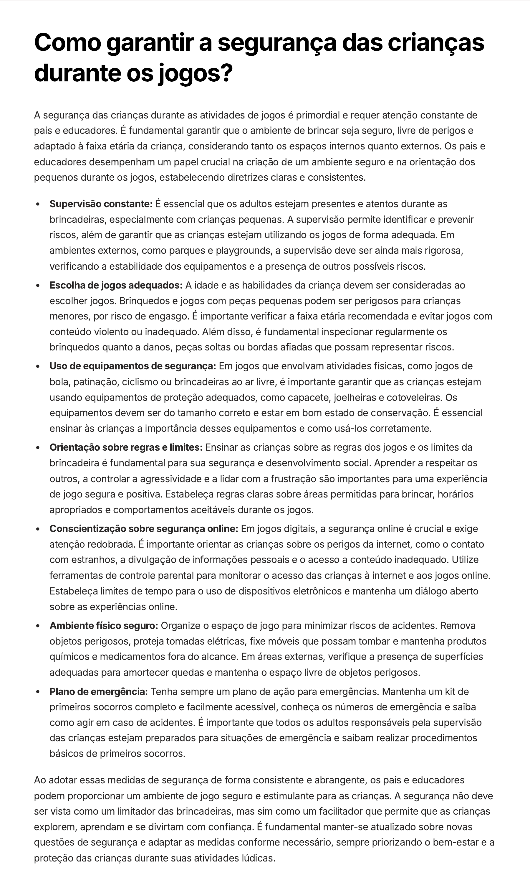 Como garantir a segurança das crianças durante os jogos? A segurança das crianças durante as atividades de jogos é primordial e requer atenção constante de pais e educadores. É fundamental garantir que o ambiente de brincar seja seguro, livre de perigos e adaptado à faixa etária da criança, considerando tanto os espaços internos quanto externos. Os pais e educadores desempenham um papel crucial na criação de um ambiente seguro e na orientação dos pequenos durante os jogos, estabelecendo diretrizes claras e consistentes. Supervisão constante: É essencial que os adultos estejam presentes e atentos durante as brincadeiras, especialmente com crianças pequenas. A supervisão permite identificar e prevenir riscos, além de garantir que as crianças estejam utilizando os jogos de forma adequada. Em ambientes externos, como parques e playgrounds, a supervisão deve ser ainda mais rigorosa, verificando a estabilidade dos equipamentos e a presença de outros possíveis riscos. Escolha de jogos adequados: A idade e as habilidades da criança devem ser consideradas ao escolher jogos. Brinquedos e jogos com peças pequenas podem ser perigosos para crianças menores, por risco de engasgo. É importante verificar a faixa etária recomendada e evitar jogos com conteúdo violento ou inadequado. Além disso, é fundamental inspecionar regularmente os brinquedos quanto a danos, peças soltas ou bordas afiadas que possam representar riscos. Uso de equipamentos de segurança: Em jogos que envolvam atividades físicas, como jogos de bola, patinação, ciclismo ou brincadeiras ao ar livre, é importante garantir que as crianças estejam usando equipamentos de proteção adequados, como capacete, joelheiras e cotoveleiras. Os equipamentos devem ser do tamanho correto e estar em bom estado de conservação. É essencial ensinar às crianças a importância desses equipamentos e como usá-los corretamente. Orientação sobre regras e limites: Ensinar as crianças sobre as regras dos jogos e os limites da brincadeira é fundamental para sua segurança e desenvolvimento social. Aprender a respeitar os outros, a controlar a agressividade e a lidar com a frustração são importantes para uma experiência de jogo segura e positiva. Estabeleça regras claras sobre áreas permitidas para brincar, horários apropriados e comportamentos aceitáveis durante os jogos. Conscientização sobre segurança online: Em jogos digitais, a segurança online é crucial e exige atenção redobrada. É importante orientar as crianças sobre os perigos da internet, como o contato com estranhos, a divulgação de informações pessoais e o acesso a conteúdo inadequado. Utilize ferramentas de controle parental para monitorar o acesso das crianças à internet e aos jogos online. Estabeleça limites de tempo para o uso de dispositivos eletrônicos e mantenha um diálogo aberto sobre as experiências online. Ambiente físico seguro: Organize o espaço de jogo para minimizar riscos de acidentes. Remova objetos perigosos, proteja tomadas elétricas, fixe móveis que possam tombar e mantenha produtos químicos e medicamentos fora do alcance. Em áreas externas, verifique a presença de superfícies adequadas para amortecer quedas e mantenha o espaço livre de objetos perigosos. Plano de emergência: Tenha sempre um plano de ação para emergências. Mantenha um kit de primeiros socorros completo e facilmente acessível, conheça os números de emergência e saiba como agir em caso de acidentes. É importante que todos os adultos responsáveis pela supervisão das crianças estejam preparados para situações de emergência e saibam realizar procedimentos básicos de primeiros socorros. Ao adotar essas medidas de segurança de forma consistente e abrangente, os pais e educadores podem proporcionar um ambiente de jogo seguro e estimulante para as crianças. A segurança não deve ser vista como um limitador das brincadeiras, mas sim como um facilitador que permite que as crianças explorem, aprendam e se divirtam com confiança. É fundamental manter-se atualizado sobre novas questões de segurança e adaptar as medidas conforme necessário, sempre priorizando o bem-estar e a proteção das crianças durante suas atividades lúdicas.