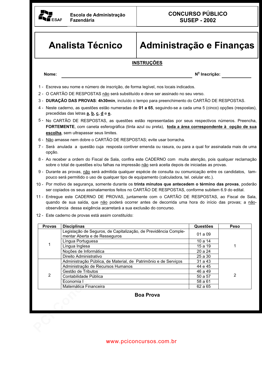pcimarkpci MDAwMDowMDAwOjAwMDA6MDAwMDowMDAwOmZmZmY6ZDEwZTo0NDc2:U2F0LCAzMCBOb3YgMjAyNCAwNToxNjo0NSAtMDMwMA== www.pciconcursos.com.br Escola de Administração Fazendária CONCURSO PÚBLICO SUSEP - 2002 Analista Técnico Administração e Finanças INSTRUÇÕES Nome: No Inscrição: 1 - Escreva seu nome e número de inscrição, de forma legível, nos locais indicados. 2 - O CARTÃO DE RESPOSTAS não será substituído e deve ser assinado no seu verso. 3 - DURAÇÃO DAS PROVAS: 4h30min, incluído o tempo para preenchimento do CARTÃO DE RESPOSTAS. 4 - Neste caderno, as questões estão numeradas de 01 a 65, seguindo-se a cada uma 5 (cinco) opções (respostas), precedidas das letras a, b, c, d e e. 5 - No CARTÃO DE RESPOSTAS, as questões estão representadas por seus respectivos números. Preencha, FORTEMENTE, com caneta esferográfica (tinta azul ou preta), toda a área correspondente à opção de sua escolha, sem ultrapassar seus limites. 6 - Não amasse nem dobre o CARTÃO DE RESPOSTAS; evite usar borracha. 7 - Será anulada a questão cuja resposta contiver emenda ou rasura, ou para a qual for assinalada mais de uma opção. 8 - Ao receber a ordem do Fiscal de Sala, confira este CADERNO com muita atenção, pois qualquer reclamação sobre o total de questões e/ou falhas na impressão não será aceita depois de iniciadas as provas. 9 - Durante as provas, não será admitida qualquer espécie de consulta ou comunicação entre os candidatos, tam- pouco será permitido o uso de qualquer tipo de equipamento (calculadora, tel. celular etc.). 10 - Por motivo de segurança, somente durante os trinta minutos que antecedem o término das provas, poderão ser copiados os seus assinalamentos feitos no CARTÃO DE RESPOSTAS, conforme subitem 6.9 do edital. 11 - Entregue este CADERNO DE PROVAS, juntamente com o CARTÃO DE RESPOSTAS, ao Fiscal de Sala, quando de sua saída, que não poderá ocorrer antes de decorrida uma hora do início das provas; a não- observância dessa exigência acarretará a sua exclusão do concurso. 12 - Este caderno de provas está assim constituído: Provas Disciplinas Questões Peso Legislação de Seguros, de Capitalização, de Previdência Comple- mentar Aberta e de Resseguros 01 a 09 Língua Portuguesa 10 a 14 Língua Inglesa 15 a 19 Noções de Informática 20 a 24 1 Direito Administrativo 25 a 30 1 Administração Pública, de Material, de Patrimônio e de Serviços 31 a 43 Administração de Recursos Humanos 44 e 45 Gestão de Tributos 46 a 49 Contabilidade Pública 50 a 57 Economia I 58 a 61 2 Matemática Financeira 62 a 65 2 Boa Prova wwww.pciconcursos.com.br pcimarkpci MDAwMDowMDAwOjAwMDA6MDAwMDowMDAwOmZmZmY6ZDEwZTo0NDc2:U2F0LCAzMCBOb3YgMjAyNCAwNToxNjo0NSAtMDMwMA== www.pciconcursos.com.br Analista Técnico - SUSEP - 2002 ADMINISTRAÇÃO E FINANÇAS - Provas 1 e 22 LEGISLAÇÃO DE SEGUROS, DE CAPITALIZAÇÃO, DE PREVIDÊNCIA COMPLEMENTAR ABERTA E DE RESSEGUROS 01- Nos planos de benefícios instituídos por entidades abertas, o direito à portabilidade a) corresponde ao resgate, pelo participante, de recursos das reservas técnicas, provisões e fundos que lhe sejam atribuíveis. b) não caracteriza resgate. c) autoriza o trânsito, pelos participantes, dos recursos financeiros que lhes correspondam. d) autoriza a transferência de recursos entre participantes. e) não compreende a transferência de recursos para entidades fechadas. 02- Desde que devidamente autorizadas, podem operar planos de benefícios de caráter previden- ciário no segmento aberto de previdência com- plementar as entidades: a) constituídas sob a forma de sociedades anô- nimas ou de sociedades por quotas de res- ponsabilidade limitada. b) destinadas a operar planos de benefícios de caráter previdenciário e/ou de assistência à saúde. c) sociedades seguradoras autorizadas a operar exclusivamente no ramo vida. d) sociedades seguradoras autorizadas a operar quaisquer ramos de seguros. e) fechadas acessíveis exclusivamente aos empregados de uma pessoa jurídica institui- dora ou patrocinadora. 03- A aplicação dos recursos correspondentes às reservas, às provisões e aos fundos das entida- des de previdência complementar deve ser feita conforme diretrizes estabelecidas pelo Conselho Monetário Nacional, que a) pode estabelecer aplicações compulsórias, nos casos de desequilíbrio dos planos. b) pode estabelecer aplicações compulsórias, nos casos de concentração excessiva de aplicações. c) pode definir limites mínimos de aplicação por segmento da economia, com vistas à diversi- ficação de riscos. d) pode definir limites mínimos de aplicação por espécie de ativos, com vistas à diversificação de riscos. e) não pode estabelecer aplicações compulsó- rias ou definir limites mínimos de aplicação. 04- No sistema da Constituição da República, o IRB – Brasil Resseguros S.A. – IRB-BRASIL Re a) não tem monopólio de resseguros. b) tem o monopólio dos resseguros contratados no Brasil e no exterior por sociedades brasi- leiras. c) tem o monopólio exclusivamente dos resse- guros contratados no Brasil por sociedades brasileiras. d) tem o monopólio dos resseguros contratados no Brasil por quaisquer sociedades, brasilei- ras ou estrangeiras. e) tem o monopólio dos cosseguros e ressegu- ros contratados no Brasil. 05- As autorizações para funcionamento dos estabe- lecimentos de seguro, resseguro, previdência e capitalização, outorgadas nos termos da lei com- plementar de que trata o art. 192 da Constituição da República, dependem de reputação ilibada e de comprovação de capacidade a) técnica e financeira, sendo transferíveis e negociáveis. b) técnica e econômica, não sendo transferíveis nem negociáveis. c) técnica e econômica, sendo transferíveis e negociáveis, sob condição. d) técnica e econômica, sendo transferíveis e negociáveis. e) econômica e financeira, sendo transferíveis e negociáveis. 06- Para que possam operar pl
