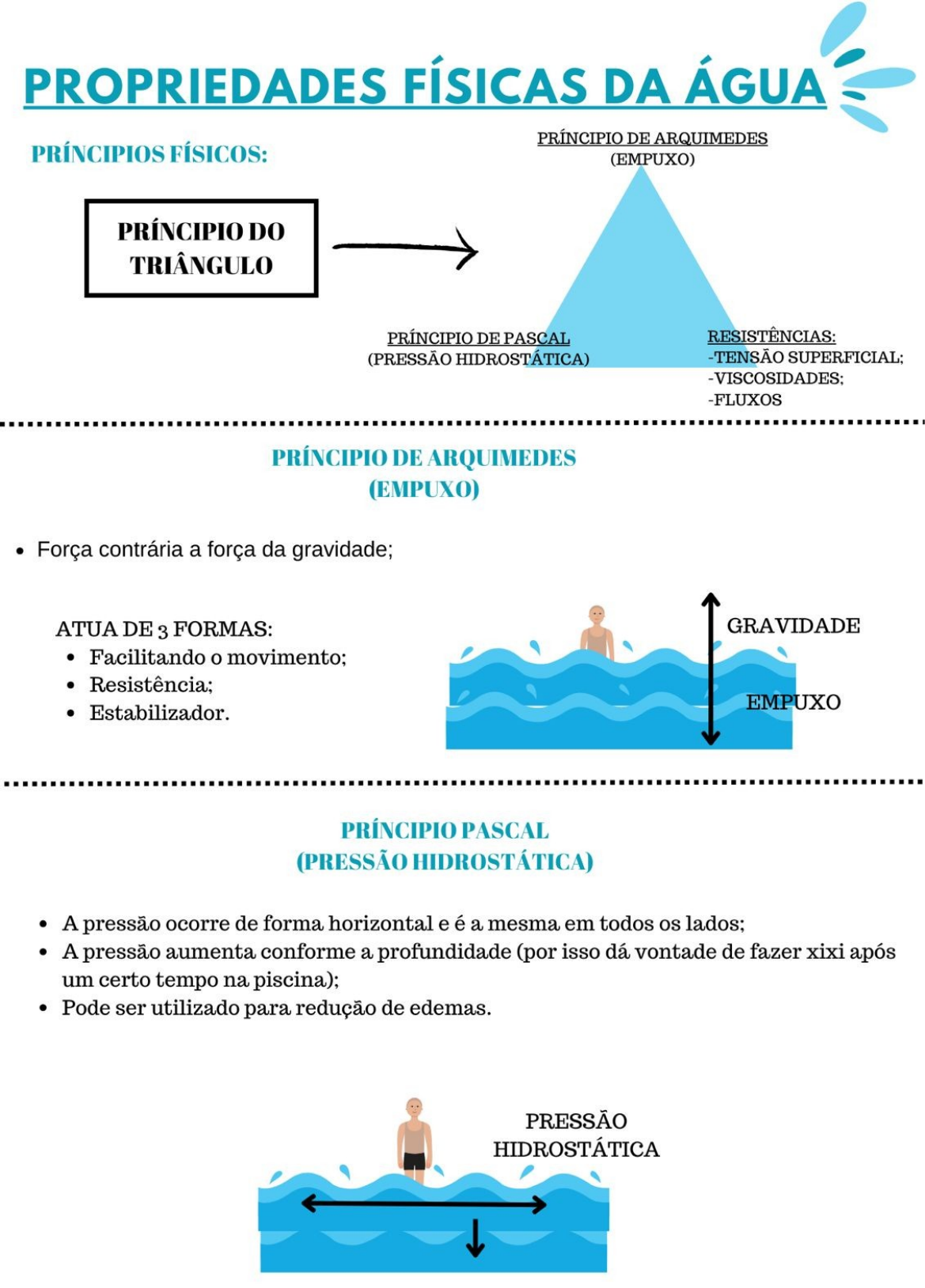 São os Fluxos que causam redemoinhos Efeitos fisiológicos no sistema cardiovascular · Aumento do retorno venoso · Volume cardíaco aumenta em torno de 27% · Pressão no átrio direto · Lei starling · Aumento do volume sistólica e diastólico · DC aumentado Diminui a quantidade de quantidade de contração · Diminuição da FC e PA · Os exercícios aquáticos têm sido utilizados para o tratamento e prevenção da hipertensão arterial, com os resultados do presente estudo verificou-se que esse tipo de exercícios promove a diminuição da pressão arterial sistólica e diastólica mesmo em mulheres hipertensas. · Os exercícios aquáticos aeróbicos, em piscina aquecida foram efetivos na redução da pressão arterial, além disso são descritos como uma alternativa segura e eficiente na redução dos níveis pressóricos associado ou não aos fármacos. Efeitos fisiológicos no sistema Musculoesquelético · Aumento do suprimento SG nos músculos · Aumento da oferta de oxigênio · Melhora a remoção de lactato de outros resíduos metabólicos · Otimização do metabolismo muscular Efeitos fisiológicos no sistema RenalAUMENTO DA DIURESE (VONTADE DE FAZER XIXI) · Aumento do suprimento SG · Aumento em 10% excreção de sódio · Diminuição da liberação hormônio antidiurético Efeitos fisiológicos no paciente · Diminuição da carga nas articulações · Relaxamento muscular · Estímulos sensoriais · Motivação ( condição psicológica) · Ativação do metabolismo muscular · Aumento do retorno venoso Efeitos fisiológicos da temperatura · Relaxamento · Redução à sensibilidade à dor · Redução de espasmos musculares · Melhora na ADM Temp. frias: exercício de maior intensidade Temp. altas: exercício de mobilidade, flexibilidade e relaxamento muscular. Efeitos fisiológicos no sistema respiratório · 50% a 60% aumento do fluxo sanguíneo na cavidade torácica. · 40% a 50% pressão hidrostática contra mm inspiratório ( diafragma) Conclusão da aula prática 03.11.2023 Conceito Halliwick “O Conceito Halliwick é uma abordagem para ensinar todas as pessoas, em particular as com deficiência física e/ou intelectual, a participar de atividades aquáticas moverem-se com independência na água e nadar” (Conceito Halliwick IHA, 2010). · Os “Nadadores” aprendem a controlar o equilíbrio na água, sem ajuda de flutuadores. Conseguido através do trabalho na relação um-para-um com apoio mínimo e ajustável do assistente. · Grupos possibilitam oportunidades comunicação e socialização. Para comunicação e socialização. · Jogos também são utilizados como um bom caminho ao aprendizado pela brincadeira e diversão. Pontos da Filosofia: · Ensinamos lentamente, em ritmo apropriado para o nadador. Encorajamos o progresso, mas não pressionamos. · A ênfase está na habilidade, não na deficiência. Está se concentrando no problema. Assim, não pode ver a solução. “ (Patch Adams) Programa de Exercício: · Aquecimento ou atividade introdutória (5 mim) · Atividades especificas (35 mim) · Momento livre (10 mim) · Jogos (10 mim) Estágios: · Ajuste mental · Restauração do equilíbrio · Inibição · Facilitação • Estágio 1 : Ajuste mental 1. Ajustamento mental (adaptação mental) 2. Desprendimento (desligamento) • trabalhar respiração (com bolinha), ganhar confiança do paciente. Estágio 2: restauração do equilíbrio 3. Controle de rotação transversal (vertical) 4. Controle da rotação sagital (de um lado para o outro ) 5. Controle da rotação longitudinal 6. Controle da rotação combinada (todos os movimentos juntos ) 7. Empuxo ( Ex.: buscar algo no fundo da piscina) Estágio 3: inibição 8. Equilíbrio estatístico/ quietude (boiar 9. Deslizamento turbulento (nadador, nadar de costas e fisio faz movimentos turbulentos trazendo-o em sua direção) Estagio: 4: Facilitação 10. Progresso simples e movimento básico BAD RAGAZ Método dos Anéis de BAD RAGAZ (NAB) DEFINIÇÃO · O método foi desenvolvido em Bad Ragaz, na Suíça. · É uma técnica de tratamento feito exclusivamente na horizontal, sendo utilizadas as propriedades da água para se criar um programa de resistência para execução dos padrões. HISTORICO 1952-Knupler-Refinou os conceitos de “exercícios ativos” Paciente na horizontal – flutuação (bóias – anéis) Conceitos de Neurofisiologia (Herman Kabat) Movimento ativo – paciente é o ponto fixo. 1957- Modificação dos exercicios de Knupler Diagonais – movimentos nos planos 1967-Fisioterapeutas Bridget Davis e Verena Laggatt – padrões de FNP Spas de Bad Ragaz, Suiça FNP + exercícios de Knupler “BAD RAGAZ RING METHOD” 1973-O método aperfeiçoado foi então publicado por Egger (McMillian) – “O Novo Método dos Anéis de Bad Ragaz”. DEFINIÇÃO: FACILITAÇÃO: tornar fácil, NEUROMUSCULAR: envolve nervos e músculos, PROPRIOCEPTIVA: estimulos aos receptores que enviam informações sobre movimento e posicionamento do corpo, Objetivo: Estimular a atividade funcional – MMSS, tronco e MMII Fortalecer e reeducar a musculatura Aumentar da ADM Melhorar o alinhamento e estabilidade do tronco Preparar os MMII para sustentação de peso CARACTERISTICAS DA TÉCNICA · Sinergias nos padrões de movimentos; · Exercício resistido dos grupos musculares agonistas e antagonistas; · Executar movimentos anatômicos, biomecánicos e fisiológicos das articulações e músculos em padrões funcionais, · Trabalha com resistência máxima. · Controle de ritmo de movimento; Princípio de irradiação (A musculatura contralateral mais fraca é estimulada pela facilitação de músculos fortes), Contatos proximais e distais (Aumento da resistência e velocidade); Controle do esforço do paciente durante toda a ADM (0 terapeuta avalia constantemente o paciente e altera o plano de tratamento) Trabalha com o paciente individualmente, Contatos manuais especificos, Comando verbal firme, cu
