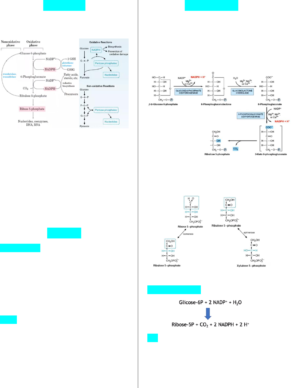 Via das Pentoses Visão Geral >> Cada tipo celular utiliza a glicose em demandas específicas mas todos realizam a via das pentoses >> Dividida em fase oxidativa e fase não oxidativa >> Se adapta a diferentes necessidades, uma parte da via pode acontecer independente do outra (não é sequencial) >> Pode atuar como by pass da via glicolítica pois produz intermediários >> Produz poder redutor (NADH) e Ribose-5-fosfato Produtos Ribose-5-Fosfato: >> Utilizado para: formação de DNA, RNA, coenzimas >> Células com alta taxa de divisão celular necessitam muito de ribose-5-fosfato (mucosa intestinal, medula, cancerígenas) NADPH: >> Utilizado para: biossínteses redutores, sistema antioxidante, sistema de desintoxicação, sistema imune >> Tipos celulares: Adipócitos e fígado (produção de lipídeos), mama (lactação), glândulas adrenais (produção de hormônios), hemácias (alto potencial oxidativo) Fase Oxidativa >> Consumo de 2 NADP+ e formação de 2 NADPH pelas enzimas desidrogenases >> Na reação catalisada pela 6-fosfogliconato desidrogenase ocorre descarboxilação, formando ribulose-5-fosfato (5 carbonos) >> Pela ação de uma isomerase, a ribulose-5-P é convertida em ribose-5-P. E pela epímerase forma xilulose-5-P Saldo da Fase Oxidativa: OBS: A Via das Pentoses utiliza NADPH pois há uma razão maior desse equivalente reduzido disponível, facilitando sua utilização nas vias biossintéticas e manutenção do potencial antioxidante. Vias que necessitam de NADH Fase Não Oxidativa >> A ribose-5-p e a xilulose-5-p, pela catálise da enzima transacetolase, formam sedoheptulose-7-p e gliceraldeído-3-p (intermediário da glicólise) >> Esses produtos formam frutose-6-p (intermediário da glicólise) e eritrose-4-p através da enzima transaldolase >> A eritrose-4-p pode se unir à xixlulose-5-p por ação da transcetolase e originar frutose-6-p e gliceraldeído- 3-p (intermediários glicolíticos) >> A frutose-6-p pode ser utilizada na via glicólitica ou retornar ao início da fase oxidativa da via das pentoses Necessidade Celular >> A combinação das etapas da via das pentoses depende da necessidade energética das células Célula que precisa de ribose-5-p e NADPH >> Utiliza a fase oxidativa e obtém ribose-5-p e NADPH Célula necessita mais de NADPH do que ribose-6-p >> Utiliza a fase oxidativa para obter NADPH e reconverte ribose-5-p em glicose-6-p, utilizada para síntese de mais NADPH Células que necessitam mais de ribose-5-p do que NADPH >> A alta concentração de NADPH inibe a entrada de glicose-6-p, então, a glicose segue a via glicolítica. >> A frutose-6-p e o gliceraldeído-3-p sintetizados podem formar ribose-5-p sem formação de NADPH >> Não existe ganho ou perda de carbono nesse processo Célula que necessita de NADPH e ATP mas não necessita de ribose-5-p >> Utilizam a fase oxidativa formando ribulose-5-p e a fase não oxidativa para formar intermediários glicolíticos que seguem a via glicolítica, formando de ATP Alterações na Via Deficiência de Tiamina pirofosfato (TPP): >> A tiamina pirofosfato é cofator da enzima transcetolase. >> Sua deficiência impacta no funcionamento da enzima, e, consequentemente, da via. Causas: >> A síndrome de wernicke-korsakov e o alcoolismo interferem na absorção intestinal da tiamina >> A mutação no gene da enzima transcetolase reduzem sua afinidade por TPP Consequências: >> Perda de memória, confusão mental, paralisia Deficiência de glicose-6p-desidrogenase: >> Causa mais comum da anemia hemolítica >> A gravidade dos sintomas depende da exposição ao dano oxidativo >> Quando as hemácias apresentam deficiência de glicose-6-p a anemia acontece, pois, a glicose é utilizada pela via das pentoses para formar NADPH e manter a glutationa reduzida, defendendo a célula do estresse oxidativo. Sistema Antioxidante Estresse oxidativo: >> Redução incompleta do O2 na fosforilação oxidativa formando moléculas altamente reativas (superóxido e peróxido) que reagem com biomoléculas causando danos e alterando suas características >> Espécies reativas são importantes pois atuam como sinalizadoras e participam do sistema imune, mas devem ter seus níveis controlados >> Esse controle é feito pelo Sistema Antioxidante >> O principal antioxidante não enzimático das células é a glutationa Glutationa: >> Recebe os elétrons pela enzima glutatina redutase e é convertida à sua forma oxidada após transferir seus elétrons às espécies reativas >> Também pode impedir o efeito das moléculas reativas diretamente quando está em sua forma reduzida >> A forma reduzida da glutationa depende da disponibilidade de NADPH Por: Fernanda Frangilo