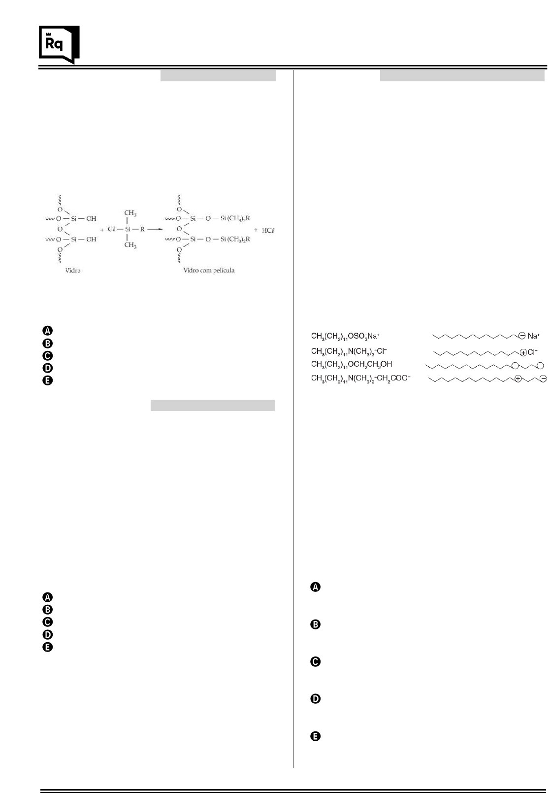 ENEM 2019 1000 QUESTÕES DE QUÍMICA – CADERNO ÚNICO | Página 231 QUESTÃO 717 [FUVEST] ----------------------------------- Para aumentar o grau de conforto do motorista e contribuir para a segurança em dias chuvosos, alguns materiais podem ser aplicados no para- brisa do veículo, formando uma película que repele a água. Nesse tratamento, ocorre uma transformação na superfície do vidro, a qual pode serrepresentada pela seguinte equação química não balanceada: Das alternativas apresentadas, a que representa o melhor material a ser aplicado ao vidro, de forma a evitar o acúmulo de água, é: ClSi(CH3)2OH ClSi(CH3)2O(CHOH)CH2NH2 ClSi(CH3)2O(CHOH)5CH3 ClSi(CH3)2OCH2(CH2)2CO2H ClSi(CH3)2OCH2(CH2)10CH3 QUESTÃO 718 [ENEM] -------------------------------------- A capacidade de limpeza e a eficiência de um sabão dependem de sua propriedade de formar micelas estáveis, que arrastam com facilidade as moléculas impregnadas no material a ser limpo. Tais micelas têm em sua estrutura partes capazes de interagir com substâncias polares, como a água, e partes que podem interagir com substâncias apolares, como as gorduras e os óleos. SANTOS, W. L P.; MÓL, G. S. (Coords.). Quimica e sociedade. São Paulo: Nova Geração, 2005 (adaptado). A substância capaz de formar as estruturas mencionadas é C18H36. C17H33COONa. CH3CH2COONa. CH3CH2CH2COOH. CH3CH2CH2CH2OCH2CH2CH2CH3. QUESTÃO 719 -------------------------------------------------- Sabões, detergentes sintéticos e xampus [...] Um sabão tem a fórmula geral RCOONa, em que R é usualmente uma cadeia carbônica contendo de 12 a 18 átomos de carbono. [...] Em geral, o sabão comum é um sal de sódio. Esses sais são solúveis em água (formando a micela). Ao contrário, os sais de Ca2+, Mg2+ ou Fe3+ são insolúveis em água. Dessa forma, um sabão não pode ser utilizado com eficiência num meio que contenha esses íons (água dura), uma vez que, nesse caso, os sais insolúveis precipitam e aderem ao tecido que está sendo lavado (ou à beira da pia, do tanque, da banheira etc.). [...] Os problemas relacionados ao uso dos sabões comuns em água dura (formação de sais insolúveis) levaram ao desenvolvimento de detergentes sintéticos. Como os sabões, os detergentes contêm uma parte orgânica com um grupo com carga na extremidade da cadeia. [...] Representação estrutural e esquemática de detergentes sintéticos Os xampus são materiais utilizados na limpeza dos cabelos e contêm em suas formulações um ou mais tipos de detergentes sintéticos (além de outras substâncias, tais como perfumes, conservantes, espessantes etc) que têm como função [...] remover a gordura do cabelo. [...] A. B. Barbosa; R. R. Silva. “Xampus”. Química nova na escola, nº2, 1995. Disponível em: . Acesso em: 28 maio 2018. Considerando as informações do texto, o comportamento dos sabões e detergentes é melhor definido por: As partículas de gorduras são removidas pela sua solubilização na parte polar das moléculas de sabão e detergente. Os sabões e detergentes são solúveis em água em função dos grupos carboxilatos e sulfonatos, que são apolares. As sujeiras apolares são removidas pela sua solubilização na parte dos grupos carboxilatos e sulfonatos. A remoção de pó de giz da mão é mais eficiente quando se utiliza um sabão em vez de um detergente. A parte apolar dos sabões e detergentes interage com a gordura, enquanto a extremidade polar interage com a água. 1000 QUESTÕES DE QUÍMICA PARA O ENEM 1000 QUESTÕES DE QUÍMICA – CADERNO ÚNICO | Página 232 QUESTÃO 720 -------------------------------------------------- As moscas podem transmitir doenças de duas maneiras: diretamente, depositando sua saliva ou suas fezes nas pessoas ou nos animais; e indiretamente, levando os micróbios nas asas, na tromba e, principalmente, nas patas. Para evitar a proliferação de doenças, pode ser utilizada uma bacia com água e sabão como armadilha para as moscas. O funcionamento dessa armadilha se deve ao fato de o sabão funcionar como agente tensoativo, reduzindo a tensão superficial da água. promover um aumento das forças coesivas entre as moléculas de água. ser um composto anfótero, permitindo uma mudança de acidez no meio. aumentar o número de ligações de hidrogênio entre as moléculas de água. atuar como agente emulsificante, permitindo a solubilização de compostos apolares. QUESTÃO 721 [ENEM] ------------------------------------------------------------------------------------------------------------------------ Pesquisadores avaliaram a qualidade da água potável distribuída em cidades brasileiras. Entre as várias substâncias encontradas, destacam-se as apresentadas no esquema. A presença dessas substâncias pode ser verificada por análises químicas, como uma reação ácido-base, mediante a adição de hidróxido de sódio. Disponível em: www.unicamp.br. Acesso em: 16 Nv. 2014 (Adaptado). Apesar de não ser perceptível visualmente, por causa das condições de diluição, essa análise apresentará resultado positivo para o(a) cafeína. atrazina. triclosan. benzo[a]pireno. dipirona sódica. ENEM 2019 1000 QUESTÕES DE QUÍMICA – CADERNO ÚNICO | Página 233 QUESTÃO 722 [ENEM] ------------------------------------------------------------------------------------------------------------------------ A cromatografia em papel é um método de separação que se baseia na migração diferencial dos componentes de uma mistura entre duas fases imiscíveis. Os componentes da amostra são separados entre a fase estacionária e a fase móvel em movimento no papel. A fase estacionária consiste de celulose praticamente pura, que pode absorver até 22% de água. É a água absorvida que funciona como fase estacionária líquida e que interage com a fase móvel, também líquida (partição líquido-líquido). Os componentes capazes de formar interações intermoleculares mais fortes com a fase estacion