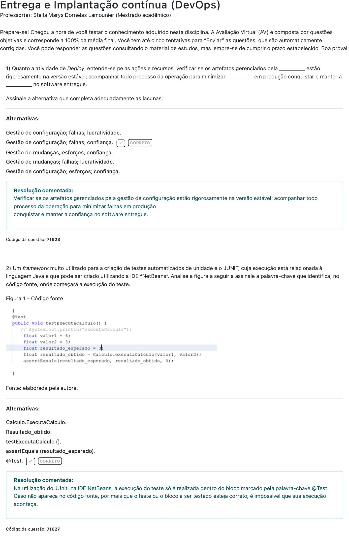 Entrega e Implantação contínua (DevOps) Professor(a): Stella Marys Dornelas Lamounier (Mestrado acadêmico) 1) 2) Prepare-se! Chegou a hora de você testar o conhecimento adquirido nesta disciplina. A Avaliação Virtual (AV) é composta por questões objetivas e corresponde a 100% da média final. Você tem até cinco tentativas para “Enviar” as questões, que são automaticamente corrigidas. Você pode responder as questões consultando o material de estudos, mas lembre-se de cumprir o prazo estabelecido. Boa prova! Quanto a atividade de Deploy, entende-se pelas ações e recursos: verificar se os artefatos gerenciados pela _________ estão rigorosamente na versão estável; acompanhar todo processo da operação para minimizar _________ em produção conquistar e manter a _________ no software entregue. Assinale a alternativa que completa adequadamente as lacunas: Alternativas: Gestão de configuração; falhas; lucratividade. Gestão de configuração; falhas; confiança. CORRETO Gestão de mudanças; esforços; confiança. Gestão de mudanças; falhas; lucratividade. Gestão de configuração; esforços; confiança. Código da questão: 71623 Um framework muito utilizado para a criação de testes automatizados de unidade é o JUNIT, cuja execução está relacionada à linguagem Java e que pode ser criado utilizando a IDE “NetBeans”. Analise a figura a seguir a assinale a palavra-chave que identifica, no código fonte, onde começará a execução do teste. Figura 1 – Código fonte Fonte: elaborada pela autora. Alternativas: Calculo.ExecutaCalculo. Resultado_obtido. testExecutaCalculo (). assertEquals (resultado_esperado). @Test. CORRETO Código da questão: 71627 Resolução comentada: Verificar se os artefatos gerenciados pela gestão de configuração estão rigorosamente na versão estável; acompanhar todo processo da operação para minimizar falhas em produção conquistar e manter a confiança no software entregue. Resolução comentada: Na utilização do JUnit, na IDE NetBeans, a execução do teste só é realizada dentro do bloco marcado pela palavra-chave @Test. Caso não apareça no código fonte, por mais que o teste ou o bloco a ser testado esteja correto, é impossível que sua execução aconteça. 3) 4) Sobre o Kanban, classifique cada afirmativa em V (verdadeiro) ou F (falso): ( ) A classificação e o rastreamento contínuos do trabalho ajudam os engenheiros a realizarem seus trabalhos com mais facilidade. ( ) Representação visual do trabalho que está por vir. ( ) Representação visual do trabalho em andamento, em vários estágios. ( ) Senso de prioridade é de fácil identificação visual. ( ) Não é permitido apresentar a estimativa da tarefa. Assinale a alternativa que contenha a sequência correta de V e F: Alternativas: V – F – F – V – F. F – V – F – V – V. F – V – F – F – F. V – F – V – V – F. V – V – V – V – F. CORRETO Código da questão: 71624 Sobre o DevOps e sua dependência de código limpo, analise as afirmativas a seguir e assinale-as com V (verdadeiro) ou F (falso): ( ) Técnica para documentar o Design Patterns. ( ) Frameworks de melhoria de código. ( ) Refatoração na prática. ( ) Conhecer técnicas de refatoração. ( ) Considerar as premissas de codificação, conforme PMBoK. Assinale a alternativa que contenha a sequência correta de V e F: Alternativas: F – V – V – V – F. CORRETO V – V – F – V – F. V – V – F – V – F. V – F – V – V – V. F – V – V – F – V. Resolução comentada: ( V ) A classificação e o rastreamento contínuos do trabalho ajudam os engenheiros a realizarem seus trabalhos com mais facilidade. ( V ) Representação visual do trabalho que está por vir. ( V ) Representação visual do trabalho em andamento em vários estágios. ( V ) Senso de prioridade é de fácil identificação visual. ( F ) Não é permitido apresentar a estimativa da tarefa:, incorreta, pois pode apresentar Resolução comentada: A segunda, terceira e quarta afirmativas são verdadeiras. Veja a forma correta das afirmativas falsas: Primeira – não é considerado por Muniz (2020), a documentação de Design Patterns. Quinta – o código limpo não tem relação direta com o PMBoK. 5) 6) 7) Código da questão: 71614 Uma empresa do ramo de tecnologia, especificamente em prestação de serviços da saúde, está em fase de elaboração do plano de negócios, mas necessita implementar software que será a base para o fluxo de trabalho. Assim, estão escolhendo o DevOps para suprir esse desejo. Analise as afirmações que são características do DevOps. I. As expertises da qualidade, da segurança e de operadores são fundamentais quando se almeja uma entrega cada vez mais adequada aos objetivos e às necessidades operacionais da organização. II. O aprendizado organizacional se dá por treinamentos eventuais. III. A execução das atividades da integração é focada em zero desperdício de recursos, pois o retrabalho é um dos maiores prejuízos. IV. Entregar a funcionalidade do software é importante, mas o código-fonte deve ser submetido ao processo de refatoração para se manter preparado para sofrer modificação no futuro. São verdadeiras: Alternativas: III e IV, apenas. II e IV, apenas. I e III, apenas. I e II, apenas. I, III e IV, apenas. CORRETO Código da questão: 71618 Técnicas de testes de software devem englobar tanto a parte externa de um sistema quanto a parte interna (código fonte). Existem basicamente dois modelos de testes disponíveis hoje, os _________, que são executados por profissionais da área que verificam as funcionalidades dos sistemas e _________, que realizam as verificações de forma rápida, automática e dinâmica. Existe também uma ferramenta muito popular em testes de software que permite a gravação de scripts e ações do usuário, seu objetivo principal é a correção de erros por blocos, trata-se da fe