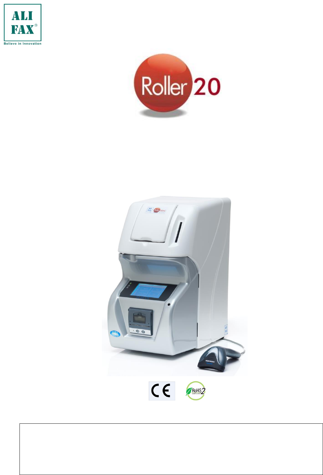 Rev.1.0 – 2019.03.01 MANUAL DEL USUARIO Válido para código referencia: SI R20-PN Para todas las Versiones de Software 5.00X Fotometría Capilar Cuantitativa para la medición de la Velocidad de Sedimentación Globular (VES) En Dispositivo Médico Diagnóstico en Vitro para uso profesional Copyright Alifax S.r.l. Este manual contiene información reservada ALIFAX. Se reservan todos los derechos. La distribuciòn y divulgaciòn de este documento o partes de ello, incluyendo pero no limitado a la copia, la reproducción y la transmisión en cualquier forma o por cualquier medio, como electrónico, mecánico, fotocopiado, registrado, o de otra manera, directo o indirectamente, es prohibido sin la autorización previa escrita de Alifax S.r.l. La marca Roller20 es propiedad de Alifax S.r.l. El software de la familia ROLLER 20 se entrega sólo con derechos restringidos y limitados basados en reglamentos italianos. MANUAL DEL USUARIO ROLLER 20-PN Rev.1.0 – 2019.03.01 MANUAL DEL USUARIO ESR_UM_SIR20-PN_ROLLER20PN_SW5-00A_1-0_ES INDEX CONVENCIONES TIPOGRÁFICAS .......................................................................................................................................... 1 AVISOS Y NOTAS ......................................................................................................................................................... 1 SÍMBOLOS DE ADVERTENCIA UTILIZADOS .............................................................................................................. 1 OTROS SÍMBOLOS ....................................................................................................................................................... 2 PRESENTACIÓN ROLLER ....................................................................................................................................................... 3 VISUALIZACIÓN INTERNA ROLLER PN ................................................................................................................................. 3 VISUALIZACIÓN PARTE POSTERIOR ROLLER y SOSTITUCION FUSIBLES ...................................................................... 5 EXTRACCIÓN CUBIERTA DE PLÁSTICO DEL INSTRUMENTO ............................................................................................ 6 FICHA TECNICA ....................................................................................................................................................................... 7 LIMITES DEL METODO .......................................................................................................................................................... 14 2.0 - ADVERTENCIAS PARA UN USO CORRECTO DEL INSTRUMENTO .......................................................................... 15 SEGURIDAD GENERAL.............................................................................................................................................. 15 SEGURIDAD OPERATIVA .......................................................................................................................................... 16 SEGURIDAD MECÁNICA ............................................................................................................................................ 17 SEGURIDAD ELÉCTRICA ........................................................................................................................................... 18 SEGURIDAD BIOLÓGICA ........................................................................................................................................... 20 Roller 20PN ETIQUETAS DE SEGURIDAD ................................................................................................................ 21 3.0 – DESEMBALAJE E INSTALACIÓN ................................................................................................................................. 21 4.0 – ARRANQUE DEL INSTRUMENTO ................................................................................................................................ 21 DESCRIPCIÓN DEL INSTRUMENTO y arranque .................................................................................................................. 21 5.0 – SUSTITUCIÓN/VACIADO DEL DEPÓSITO DE RESIDUOS ......................................................................................... 22 6.0 – CONTROL DEL NIVEL DEL DEPÓSITO DE LAVADO .................................................................................................. 22 7.0 – AUMENTO DISPONIBILIDAD TEST USANDO LA TARJETA INTELIGENTE ............................................................... 22 7.1 – ERRORES TARJETA INTELIGENTE ................................................................................................................. 25 7.2 – SUSTITUCIÓN - CARGA ROLLO DE PAPEL .................................................................................................... 26 8.0 – ENCENDIDO .................................................................................................................................................................. 27 9.0 – DESCRIPCIÓN MENÚ ................................................................................................................................................... 28 9.1 – MENÚ PRINCIPAL ......................................................................................................................................................... 28 9.1.1 – MENÚ MEDICIÓN ....................................................................................................................................................... 28 9.1.1.1 – IDENTIFICACIÓN PACIENTE MEDIANTE Lector Código de Barras Externo ......................................................... 29 9.1.1.2 – INTRODUCCIÓN MANUAL DE LA ID DEL PACIENTE .....................................................................