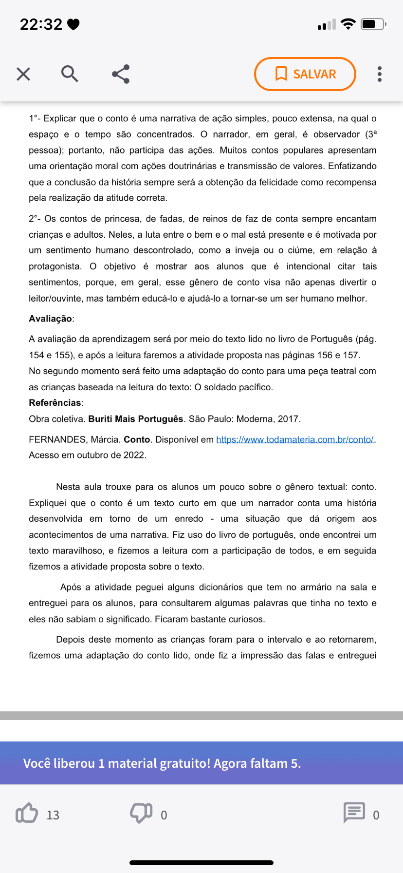 22:32 X SALVAR - Explicar que o conto é uma narrativa de ação simples, pouco extensa, na qual o espaço e o tempo são concentrados. o narrador, em geral, é observador pessoa); portanto, não participa das ações. Muitos contos populares apresentam uma orientação moral com ações doutrinárias e transmissão de valores. Enfatizando que a conclusão da história sempre será a obtenção da felicidade como recompensa pela realização da atitude correta. 2°- Os contos de princesa, de fadas, de reinos de faz de conta sempre encantam crianças e adultos. Neles, a luta entre o bem e o mal está presente e é motivada por um sentimento humano descontrolado, como a inveja ou o ciúme, em relação à protagonista. objetivo é mostrar aos alunos que é intencional citar tais sentimentos, porque, em geral, esse gênero de conto visa não apenas divertir o leitor/ouvinte, mas também educá-lo e ajudá-lo a tornar-se um ser humano melhor. Avaliação: A avaliação da aprendizagem será por meio do texto lido no livro de Português (pág. 154 e 155), e após a leitura faremos a atividade proposta nas páginas 156 e 157. No segundo momento será feito uma adaptação do conto para uma peça teatral com as crianças baseada na leitura do texto: soldado pacífico. Referências: Obra coletiva. Buriti Mais Português. São Paulo: Moderna, 2017. FERNANDES, Márcia. Conto. Disponível em Acesso em outubro de 2022. Nesta aula trouxe para os alunos um pouco sobre o gênero textual: conto. Expliquei que conto é um texto curto em que um narrador conta uma história desenvolvida em torno de um enredo - uma situação que dá origem aos acontecimentos de uma narrativa. Fiz uso do livro de português, onde encontrei um texto maravilhoso, e fizemos a leitura com a participação de todos, e em seguida fizemos a atividade proposta sobre o texto. Após a atividade peguei alguns dicionários que tem no armário na sala e entreguei para os alunos, para consultarem algumas palavras que tinha no texto e eles não sabiam o significado. Ficaram bastante curiosos. Depois deste momento as crianças foram para o intervalo e ao retornarem, fizemos uma adaptação do conto lido, onde fiz a impressão das falas e entreguei Você liberou 1 material gratuito! Agora faltam 5. 13 0 0