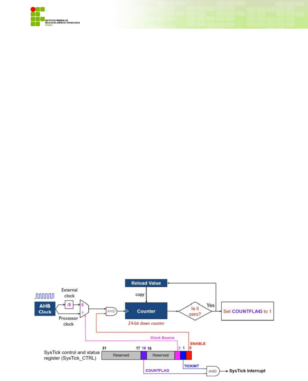 Exercício avaliativo 3 Instituição: Instituto Federal de Educação, Ciência e Tecnologia - Paraíba (IFPB). Disciplina: Microprocessadores e microcontroladores . Professor: Fagner de Araujo Pereira. Aluno (a): ________________________________________________________________________________________ Exercício avaliativo 3 (Peso 100 pontos) - Reposição 1. Um conversor AD (Analógico Digital) tem faixa de tensão de entrada de -1,65V a +1,65V e possui uma resolução de 50,35 𝜇V. Quantos bits possui esse conversor? 2. Deseja-se digitalizar o sinal v(t)=5sen(10t), t > 0, para que o erro de quantização da conversão analógico/digital não seja maior que 1 mV. Qual o número mínimo de bits necessários para digitalizar uma amostra do sinal v(t)? 3. Um sensor de temperatura pode medir uma faixa de 0 200 °C usando toda a escala de um conversor AD de 8 bits de resolução. Qual a variação de temperatura mínima necessária para produzir uma mudança nos 2 bits menos significativos do conversor? 4. Considere que um osciloscópio de baixo custo é construído com um conversor A/D que tem uma resolução de 8 bits, um range de entrada de 0 a 5V e opera sob uma taxa de amostragem de 20 mil amostras por segundo. Considere que no instante t=0 o conversor iniciou um ciclo de conversão ao mesmo tempo em que foi aplicado em sua entrada um sinal senoidal, cuja amplitude em volts é expressa por S(t)=2,5+2,5sen(2πft). Se a frequência do sinal senoidal (f) é de 6 kHz, qual a ordem da amostra que faz com que a saída do conversor apresente o valor 0b00000000 pela primeira vez? 5. O diagrama de blocos da figura abaixo mostra a operação completa do contador SysTick do microcontrolador STM32F407. A operação do SysTick é configurada pelo registrador de controle SysTick_CTRL. Quando setados, o bit 0 habilita a contagem e o bit 1 habilita a requisição de interrupções. O bit 2 seleciona a fonte de clock do contador e o bit 16 é setado automaticamente pelo hardware quando o contador muda de 1 para 0, podendo gerar uma requisição de interrupção se o bit 1 estiver setado. Considerando que a frequência de clock do barramento AHB é 168 MHz e que o valor escrito no registrador SysTick_CTRL é 0b111, qual o valor deve ser escrito no registrador Reload Value para que a frequência de requisições de interrupções do SysTick seja de 10 kHz?