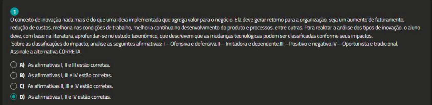1 conceito de inovação nada mais é do que uma ideia implementada que agrega valor para o negócio. Ela deve gerar retorno para a organização, seja um aumento de faturamento, redução de custos, melhoria nas condições de trabalho, melhoria contínua no desenvolvimento do produto e processos, entre outras. Para realizar a análise dos tipos de inovação, o aluno deve, com base na literatura, aprofundar-se no estudo taxonômico, que descrevem que as mudanças tecnológicas podem ser classificadas conforme seus impactos. Sobre as classificações do impacto, analise as seguintes afirmativas: I - Ofensiva e defensiva.II - Imitadora e dependente.III Positivo e negativo.IV - Oportunista e tradicional. Assinale a alternativa CORRETA A) As afirmativas I, e III estão corretas. B) As afirmativas I, III e IV estão corretas. As afirmativas II, III e IV estão corretas. D) As afirmativas I, II e IV estão corretas.