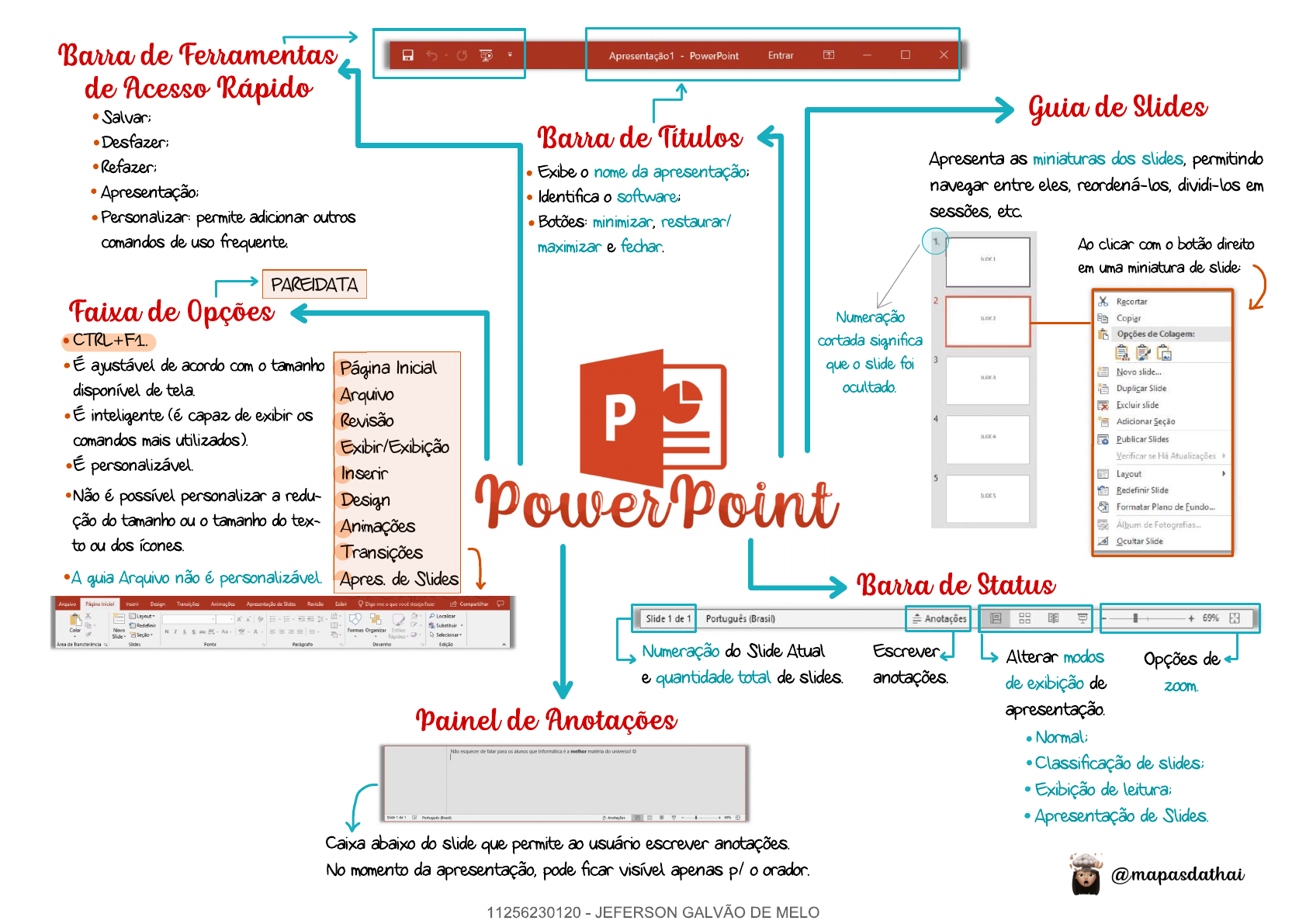 Barra de Ferramentas - PowerPoint Entrar de Acesso Salvar Guia de Slides Barra de Titulos Apresenta as miniaturas dos slides, permitindo Exibe nome da Apresentação Identifica navegar entre dividi-los em permite adicionar outros etc minimizar, restaurar/ comandos de uso frequente maximizar e Ao clicar com botão direito em uma miniatura de slide PAREIDATA 2 Recortar Faixa de Opções Numeração Copiar CTRL+F1. cortada significa Opções de Colagem: É ajustável de acordo com tamanho Página Inicial que slide foi 3 Novo slide.. disponível de tela Arquivo Duplicar Slide É inteligente (é capaz de exibir P Excluir slide Revisão 4 Adicionar Seção comandos mais utilizados). Slides Exibir/Exibição Verificar se Atualizações personalizável. Inserin 5 Layout Não é possível personalizar a redu- PowerPoint Redefinir Slide Design Formatar Plano de Fundo.. ção do tamanho ou tamanho do tex- Animações Album de to ou dos Ocultar Slide Transições A guia Arquivo não é personalizável. Apres de Slides Barra de Status Arquivo Inicial Transições Animações Revisão Exibi Compartilhar Layout Localizar Slide de 1 Português (Brasil) Anotações 69% N Formas Organizar de Transferência Fonte Desenho Edição Numeração do Slide Atual Escrever Alterar modos Opções de e quantidade total de slides. anotações. de exibição de Painel de Anotações apresentação. Normal; Não esquecer de falar para os alunos que melhor matéria do Classificação de Exibição de leitura; Apresentação de Slides Caixa abaixo do slide que permite ao usuário escrever No momento da apresentação, pode ficar visível apenas pl orador. @mapasdathai 11256230120 JEFERSON GALVÃO DE MELOArea de transferência Slides Alterar layout Acesso aos @mapasdathai do slide Temas do Office Colar Layout Recortar Restabelecer as Redefinir Colar Novo configurações Fonte Slide Seção padrão Área de Transferência Slides Calibri (Corpo) Pincel de 12 TAMANHO DA FONTE Formatação Adicionar um slide Organizar AUMENTAR 0 TAMANHO DA FONTE à apresentação slides em seções DIMINUIR 0 TAMANHO DA FONTE Paragrafo Ctrl + M Limpar toda a formatação; Aa MAIÚSCULAS e minúsculas; Marcadores N Numeração Negrito I Itálico recuo Guia S Sublinhado Aumentar recuo Página Inicial S entre linhas Sombra no Texto AV Alinhar à esquerda Espaçamento entre caracteres à direita PowerPoint abc Tachado Centralizar Cor do realce do texto Justificar Cor da fonte Adicionar ou remover colunas Direção do Texto Com uma cor sólida, Desenho Alinhar Texto gradiente, imagem ou textura. Converter em SmartArt - Preenchimento da Forma - Insere formas Contorno da Forma Organizar Estilos Efeitos de Forma Rápidos Cor, largura e estilo de Edição Desenho linhas de Localizar (texto ou outro conteúdo no documento). Localizar - Organiza objetos, Altera a aparência da ab Substituir Substituir (pesquise texto que você quer mudar alterando sua ordem, Aplica um efeito visual à forma, como forma ou do estilo de Selecionar - e por sombra, brilho, reflexo ou rotação 3D. posição e rotação. linha selecionado. Selecionar (texto ou objetos no documento). 11256230120 JEFERSON GALVÃO DE MELOVisualização Intervalo Especificar a duração Escolha um som para tocar durante a Reproduzir a transição deste slide da transição do slide anterior para este Visualizar Som: [Sem Avançar Slide Duração: 02,00 Ao Clicar com o Mouse Visualização Guia Aplicar a Todos Após: Intervalo Transições Aplicar as configurações de Irá aguardar um clique transição, efeitos e intervalo do de mouse para slide atual a toda a apresentação. para próximo slide Transição para Seguirá para próximo este Slide slide após um determinado tempo. Nenhuma Transformar Esmaecer Empurrão Apagar Dividir Revelar Recortar Barras Forma Opções de Efeito para este Slide Sutil Nenhuma Transformar Esmaecer Escolher um efeito especial de Empurrão Dividir Revelar Recortar transição entre este slide e o Barras Forma Cobrir Piscar Empolgante slide anterior. Queda Cortina Cortinas Vento Fratura Compressão Ondulação Avião Origami Xadrez Persianas Ondulação Colmeia Brilho Vortex Rasqar Alternar Inverter Galeria Cubo ? Alterar para uma variação de Portas Caixa Pente Zoom Aleatório Conteúdo transição selecionada. Roda Gigante Girar Janela Órbita Voar Através @mapasdathai 11256230120 JEFERSON GALVÃO DE MELO@mapasdathai Animação Visualização Nenhuma Aparecer Esmaecer Surgir Flutuar para... Dividir Apagar Forma Opções de Reproduzir a animação Efeito Visualizar Animação do slide selecionado. Selecione uma animação a Aplicar um efeito de animação ao objeto Visualização ser aplicada aos objetos selecionado. selecionados no slide Ao clicar; Intervalo Guia A animação permite focalizar em pontos importantes, Ao mesmo tempo que a animação anterior; ou controlar Auxo de informações e aumentar Após a animação anterior. interesse de um espectador na Iniciar: Ao Clicar Reordenar Animação Animações Automat : Mover Antes Configurar a animação Atraso: Depois atual para ser executada Intervalo PowerPoint Animação Objetos de um mesmo slide mais cedo ou mais Transição Movimento de um slide pl outro. Executar a animação após um determinado tempo. Efeitos pl que Nenhuma Animação objetos surjam no slide * * * * * Esmaece Flutua Enfase * * * Escolha um efeito de animação Cor do Pincel Efeitos chamar adicionar aos objetos selecionados. Permite ver e editar a linha do a atenção pl um ponto * Painel de Animação tempo das animações neste slide específico do 00 Linhas Loops * Efeitos Mais Disparar Adicionar Mais Definin uma condição inicial efeitos pl que Animação Pincel de Animação especial pl uma animação. objetos sejam excluídos do Animação Avançada slide Aplica efeito a outros objetos na apresentação. Caminho da Efeitos que permitem mover um 11256230120 JEFERSON GALVÃO DE MELOInicia a apresentação em tela inteira pl que v