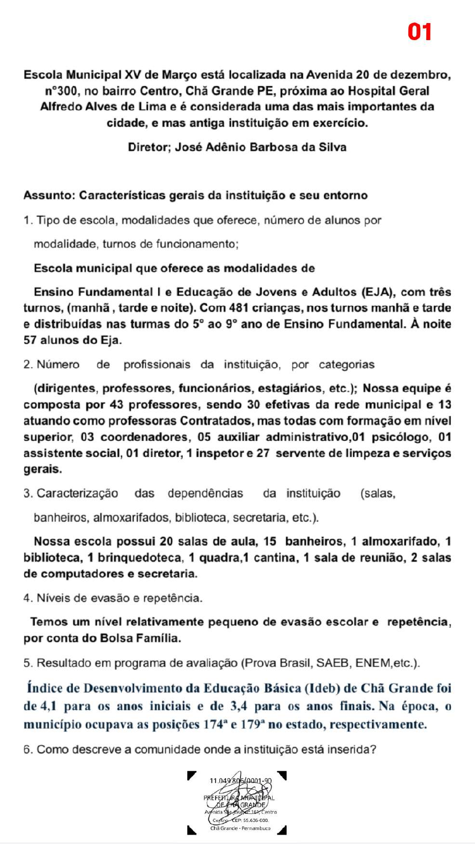 01 Escola Municipal XV de Março está localizada na Avenida 20 de dezembro, n°300, no bairro Centro, Grande PE, próxima ao Hospital Geral Alfredo Alves de Lima e é considerada uma das mais importantes da cidade, e mas antiga instituição em exercício. Diretor; José Adênio Barbosa da Silva Assunto: Características gerais da instituição e seu entorno 1. Tipo de escola, modalidades que oferece, número de alunos por modalidade, turnos de funcionamento; Escola municipal que oferece as modalidades de Ensino Fundamental e Educação de Jovens e Adultos (EJA), com três turnos, tarde e noite). Com 481 crianças, nos turnos manhã e tarde e distribuídas nas turmas do 5° ao 9° ano de Ensino Fundamental. À noite 57 alunos do Eja. 2. Número de profissionais da instituição, por categorias (dirigentes, professores, funcionários, estagiários, etc.); Nossa equipe é composta por 43 professores, sendo 30 efetivas da rede municipal e 13 atuando como professoras Contratados, mas todas com formação em nível superior, 03 coordenadores, 05 auxiliar administrativo,01 psicólogo, 01 assistente social, 01 diretor, 1 inspetor e 27 servente de limpeza e serviços gerais. 3. Caracterização das dependências da instituição (salas, banheiros, almoxarifados, biblioteca, secretaria, etc.). Nossa escola possui 20 salas de aula, 15 banheiros, 1 almoxarifado, 1 biblioteca, 1 brinquedoteca, 1 quadra,1 cantina, 1 sala de reunião, 2 salas de computadores e secretaria. 4. Níveis de evasão e repetência. Temos um nível relativamente pequeno de evasão escolar e repetência, por conta do Bolsa Família. 5. Resultado em programa de avaliação (Prova Brasil, SAEB, ENEM,etc.). Índice de Desenvolvimento da Educação Básica (Ideb) de Chã Grande foi de 4,1 para os anos iniciais e de 3,4 para os anos finais. Na época, o município ocupava as posições e no estado, respectivamente. 6. Como descreve a comunidade onde a instituição está inserida? MUNICIPAL GRANDE Avenida Centro CEP Grande Pernambuco02 A comunidade escolar tem uma participação ativa, onde a maioria dos pais e responsáveis participam das reuniões, discussões, atividades comemorativas promovidas pela escola, bem como, opinam e dão sugestões para a resolução de problemas e melhoria do ensino,fortalecendo vínculo com a escola. 6. A escola possui conselhos de pais, alunos, colegiado etc. Durante o ano letivo, nossa escola promove conselho de classe e reuniões pedagógicas com os professores e promove reuniões bimestrais com pais ou responsáveis dos alunos. Assunto: Rotinas de funcionamento da escola 1. Entrada, saída, intervalo, movimentação de educandos e educadores e pais ou outras pessoas. A Escola Municipal 15 de Março funciona de segunda a sexta, das 7h00 ao meio-dia, das 13h30 às 17h00 e das 18h30 às 22h00, com intervalos em todos os horários e oferecendo alimentação de qualidade para todos alunos. 2. No Trabalho pedagógico, quem define os conteúdos curriculares? São os professores e a equipe pedagógica. 3. Quais os recursos que o professor tem à sua disposição? Os professores utilizam plataformas da Editora do livro adotado, jogos didáticos, filmes didáticos, cartazes, músicas e etc. 4. Quais os critérios / instrumentos de avaliação? São feitos dois tipos: Verificações (testes) e avaliações (provas) que são somados e obtém a média final. 5. Quais os outros projetos e programas na escola? Projetos que promovem socialização entre a comunidade escolar, valores familiares e Avenida Grande Pernambuco03 7. Existe proposta de formação em serviço para os professores e demais educadores da Escola? Algumas propostas para a formação continuada de professores são: Incentivar a formação em tecnologia e ensino híbrido Oferecer apoio e tempo para estudos Organizar grupos e reuniões de estudo Indicar cursos e materiais Promover palestras e workshops Favorecer feedbacks constantes Desenvolver competências socioemocionais Focar em outras profissões dentro da escola, como coordenador, supervisor e diretor 8. Quanto a missão da escola, os objetivos a serem alcançados e elencados no PPP, sobre eles, quais são? Transmitir valores, como seres pensantes, críticos e independentes. Promover uma educação de qualidade para todos os alunos, levando-os a construir sua história com responsabilidade, dignidade e autonomia, contribuindo para uma sociedade mais justa, fraterna e feliz. Fortalecer a participação da Comunidade Escolar . Gerir com transparência e moralidade pública os recursos pedagógicos, administrativos e financeiros destinados a Unidade escolar. Estruturar laços de comunicação e convívio entre escola e família. Promover Avaliação institucional. Assunto: Quanto a Gestão Escolar 1. Forma de escolha dos dirigentes: Não há eleição. o diretor é nomeado pelo gestor municipal. Os demais são escolhidos pela direção e pelo secretário de Educação. 2. Participação da comunidade escolar/institucional (normas, práticas, periodicidade de reuniões, fiscalização, outros); São feitas reuniões bimestrais e projetos abertos à comunidade. 11.049.805/0001-90 PREFEITURA MUNICIPAL GRANDE Avenida Centro Centro CEP: 55.636-000. Grande Pernambuco04 A participação da comunidade escolar nas normas, práticas, periodicidade de reuniões, fiscalização e outros aspectos da gestão da escola é importante para a democracia e a qualidade do ensino- aprendizagem. A participação da comunidade escolar pode ser feita de diversas formas, como: Organização de eventos, reuniões, dias da família na escola, assembleias, entre outros Instituição do Conselho Escolar, que contribui para a autonomia da escola, fortalece o vínculo com a comunidade e favorece o controle social Discussão e traçado de novos caminhos, integrando-se a todas as ações propostas pela escola. 3. Caracterização do conselho escolar (composição, atribuição, funcionamento, rotinas, etc.) Nossa escola fu