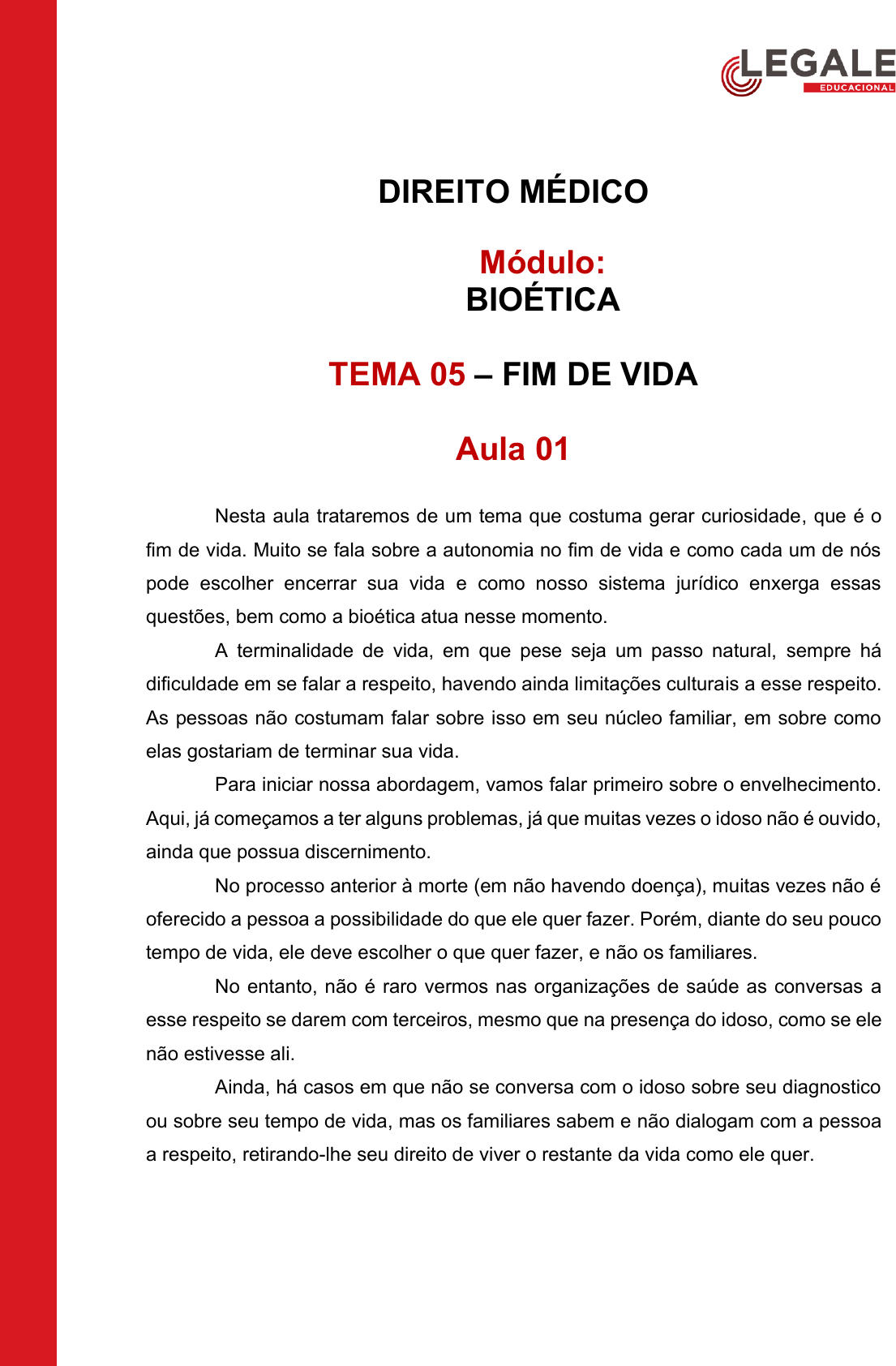 DIREITO MÉDICO Módulo: BIOÉTICA TEMA 05 – FIM DE VIDA Aula 01 Nesta aula trataremos de um tema que costuma gerar curiosidade, que é o fim de vida. Muito se fala sobre a autonomia no fim de vida e como cada um de nós pode escolher encerrar sua vida e como nosso sistema jurídico enxerga essas questões, bem como a bioética atua nesse momento. A terminalidade de vida, em que pese seja um passo natural, sempre há dificuldade em se falar a respeito, havendo ainda limitações culturais a esse respeito. As pessoas não costumam falar sobre isso em seu núcleo familiar, em sobre como elas gostariam de terminar sua vida. Para iniciar nossa abordagem, vamos falar primeiro sobre o envelhecimento. Aqui, já começamos a ter alguns problemas, já que muitas vezes o idoso não é ouvido, ainda que possua discernimento. No processo anterior à morte (em não havendo doença), muitas vezes não é oferecido a pessoa a possibilidade do que ele quer fazer. Porém, diante do seu pouco tempo de vida, ele deve escolher o que quer fazer, e não os familiares. No entanto, não é raro vermos nas organizações de saúde as conversas a esse respeito se darem com terceiros, mesmo que na presença do idoso, como se ele não estivesse ali. Ainda, há casos em que não se conversa com o idoso sobre seu diagnostico ou sobre seu tempo de vida, mas os familiares sabem e não dialogam com a pessoa a respeito, retirando-lhe seu direito de viver o restante da vida como ele quer. Andrielly Von Stein Andrade - 10131182943 Nesses casos, há a sensação de que o idoso está sendo preservado. Mas na verdade está sendo retirado seu direito de escolher como terminar a vida, o que deve ser evitado. Assim, trazê-lo ao centro da decisão e ouvi-lo é fundamental. Lembrando que estamos falando de pessoas que possuem discernimento. Para os casos em que não há, coloca-se os representantes para tomar as decisões. Assim, temos alguns pontos para observar quando se trata do envelhecimento: i) evitar doenças e incapacidade, ii) engajar-se ativamente na vida, iii) manter funcionalidade física e cognitiva e iv) o paciente deve eleger suas prioridades ❖ Questões intrínsecas: autonomia do idoso e finitude humana – “conspiração do silêncio” (todos sabem da situação, mas ninguém fala a respeito). Passada a questão do envelhecimento e falando sobre terminalidade de vida, temos alguns aspectos da morte com e sem dignidade. Embora o assunto seja muito íntimo e pessoal, relacionado as crenças pessoais e questões religiosas do indivíduo, a abordagem do tema será baseado na ciência e nos estudos realizados acerca da terminalidade, o que não quer dizer que são aspectos absolutos: ▪ Morte com dignidade o Apropriação do processo de morte pelo sujeito o Organização do fim da vida o Término dos assuntos inacabados o Despedidas o Testamento e testemunhas Quem trabalha junto a pacientes terminais narra que os pacientes que sabem da morte próxima têm muito mais preocupações em decidir suas questões burocráticas, como quem ficará seus filhos, se os pais estão bem, se o cenário deixado será favorável aos familiares, do que com sua morte propriamente dita. Andrielly Von Stein Andrade - 10131182943 ❖ Morte Digna: ▪ Término da vida com respeito a crenças e valores ▪ Sem dor ▪ Na presença da família, se o caso, já que alguns núcleos familiares não têm um bom relacionamento ▪ Ambiente aconchegante ▪ Rituais de despedida ❖ Morte indigna ▪ Prolongada ▪ Com dor e sintomas incapacitantes sem cuidado ▪ Solitária ▪ Companhia de tubos e monitores Geralmente, o paciente que fica na UTI para morrer passa por um processo dolorido, solitário e angustiante. O que se busca cada vez mais é criar um ambiente que a pessoa se sinta minimamente acolhida, facilitando a passagem. Por isso é que existe a prática da desospitalização, quando possível, embora também não seja uma situação fácil, já que o processo acaba sendo dolorido para todos. Aula 02 Já falamos sobre morte digna e indigna. Abrindo um pouco o tema da morte digna, durante muito tempo se fala sobre a dignidade humana e nossos conceitos de vida, de modo que isso acaba gerando debates: será que buscamos a vida a qualquer custo, ou estamos pensando mesmo em vida digna? A vida humana prevista no Código de Ética Médica de 88 vem hoje com a saúde do ser humano e qualidade de vida. É isso que deve se buscar. Andrielly Von Stein Andrade - 10131182943 Ademais, de acordo com a Organização Mundial da Saúde (OMS), qualidade de vida é “a percepção do indivíduo da sua inserção na vida, no contexto da cultura e sistemas de valores nos quais ele vive e em relação aos seus objetivos, expectativas, padrões e preocupações”. ❖ Princípios constitucionais aplicáveis: ▪ Dignidade da pessoa humana e proibição da tortura ▪ Art. 5º, inciso III, CF/88 – ninguém será submetido a tortura nem a tratamento desumano degradante Veja que não falamos da vida pela vida, mas sim a vida e morte dignas. O debate é sempre muito caloroso e peculiar, além ser um dos temas chaves da bioética. Assim, um dos pontos importantes é acerca da distanásia, que é o prolongamento do processo de morte através de tratamentos. Será que ela traz mesmo qualidade de vida? Há críticas sobre o procedimento, nas quais se entende que a distanásia, além de não melhorar a qualidade de vida, também pode ser considerada uma tortura. Assim, cabe a reflexão: é justo fazer com que o paciente passe horas ou dias sem qualidade vida, apenas para mantê-lo vivo? ❖ Ortotanásia ▪ Resolução nº 1.805/2006 do Conselho Federal de Medicina (CFM): Na fase terminal de enfermidades graves e incuráveis é permitido ao médico limitar ou suspender procedimentos e tratamentos que prolonguem a vida do doente, garantindo-lhe os cuidados necessários para aliviar os sintomas que levam ao sofrimento, na perspectiva de uma assistência geral, 