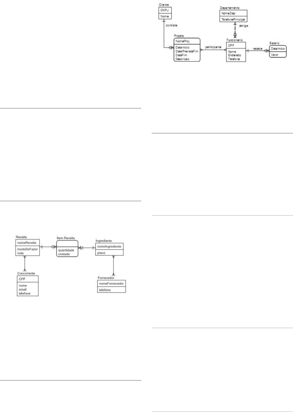128 Æ MODELO ENTIDADE-RELACIONAMENTO (MER) 7. (CESGRANRIO – 2010) O modelo de Entidades e Relaciona- mentos (ER) é bastante utilizado na modelagem conceitual de bancos de dados. Além de utilizar entidades e seus relaciona- mentos para descrição dos dados, o modelo ER inclui também alguns atributos que descrevem as características de cada entidade. Já um relacionamento também pode ter atributos a) se as cardinalidades máximas forem 1xN, independente- mente das cardinalidades mínimas. b) se as cardinalidades máximas forem NxN, independente- mente das cardinalidades mínimas. c) se as cardinalidades mínimas do relacionamento forem maiores que zero, independentemente das cardinalidades máximas. d) somente se estiver participando de uma entidade associativa. e) independentemente das cardinalidades do relacionamento. 8. (CESGRANRIO – 2013) No modelo de entidades e relaciona- mentos (ER), a cardinalidade é uma das principais caracterís- ticas de um relacionamento. Uma das várias cardinalidades possíveis para os relacionamentos exige a criação de uma tabe- la adicional no modelo relacional. Qual é essa cardinalidade? a) N:M b) N:1 c) 1:N d) 1:1 e) 0:1 9. (CESGRANRIO – 2012) O modelo de entidades e relaciona- mentos a seguir representa uma base de dados a ser criada para um concurso de receitas Considerando que todos os atributos são atômicos, sua trans- formação para uma base de dados relacional, na terceira forma normal, sem utilizar atributos chaves substitutos, utilizando-se as melhores práticas de projeto, resultará, respectivamente, em quantas tabelas e em quantos atributos ? a) 5 e 15 b) 6 e 17 c) 6 e 21 d) 7 e 17 e) 7 e 19 10. (CESGRANRIO – 2012) Leve em conta a figura do diagrama a seguir, usando a notação da Engenharia de Informação e seguindo as regras do Modelo de Entidades e Relacionamentos. A partir do diagrama, conclui-se que a) dois funcionários não podem receber um salário de um mesmo valor. b) dois funcionários não podem receber salários com a mes- ma data início. c) um funcionário pode ser abrigado por dois departamentos. d) um funcionário pode ser participante de dois projetos. e) um projeto pode ser contratado por dois clientes. 11. (CESGRANRIO – 2012) Uma entidade associativa do modelo de entidades e relacionamentos é um(a) a) atributo redefinido e tratado como se fosse também uma entidade b) dado associado a cada ocorrência de um relacionamento c) dado associado a cada ocorrência de uma entidade d) relacionamento redefinido e tratado como se fosse tam- bém uma entidade e) atribuição de propriedades genéricas a uma entidade associada 12. (CESGRANRIO – 2012) Considere as afirmações abaixo sobre modelo de entidades e relacionamentos. I - Um tipo entidade fraca não tem atributos chave próprios, devendo possuir, pelo menos, um relacionamento identificador. II - Os atributos de tipos relacionamento 1:1 ou N:M podem ser migrados para um dos tipos entidade participantes. III - O grau de um tipo relacionamento é o número de entidades que participam desse relacionamento. Está correto APENAS o que se afirma em a) I b) II c) I e II d) I e III e) II e III 13. (CESGRANRIO – 2011) A estrutura lógica de um banco de dados pode ser expressa graficamente por um diagrama E-R (diagrama Entidade-Relacionamento). Nesse diagrama, o componente que representa um conjunto de relacionamentos é o(a) a) retângulo b) losango c) quadrado d) elipse e) linha