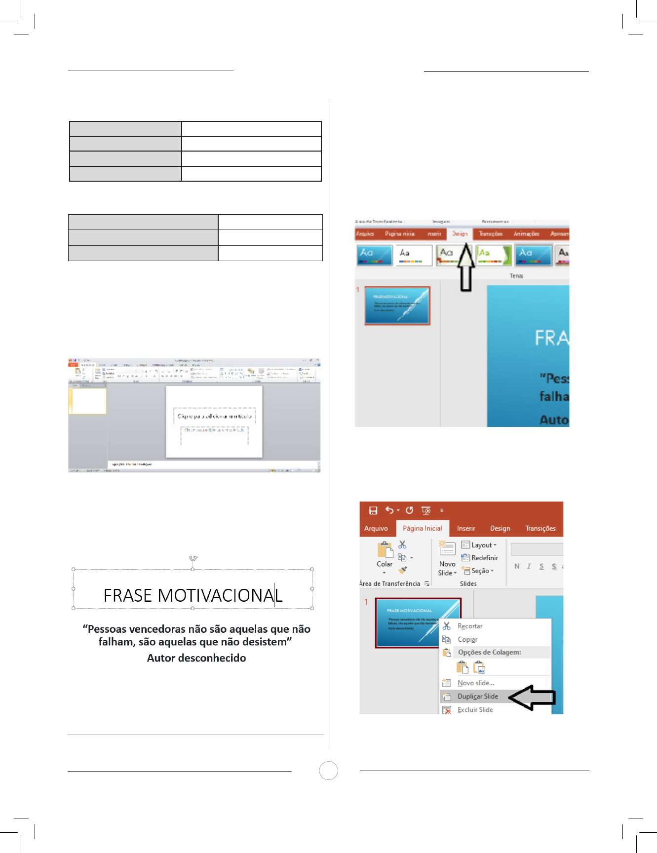 NOÇÕES DE INFORMÁTICA 121 • Fórmulas básicas ADIÇÃO =SOMA(célulaX;célulaY) SUBTRAÇÃO =(célulaX-célulaY) MULTIPLICAÇÃO =(célulaX*célulaY) DIVISÃO =(célulaX/célulaY) • Fórmulas de comum interesse MÉDIA (em um intervalo de células) =MEDIA(célula X:célulaY) MÁXIMA (em um intervalo de células) =MAX(célula X:célulaY) MÍNIMA (em um intervalo de células) =MIN(célula X:célulaY) PowerPoint O PowerPoint é um editor que permite a criação de apresenta- ções personalizadas para os mais diversos fins. Existem uma série de recursos avançados para a formatação das apresentações, aqui veremos os princípios para a utilização do aplicativo. • Área de Trabalho do PowerPoint Nesta tela já podemos aproveitar a área interna para escre- ver conteúdos, redimensionar, mover as áreas delimitadas ou até mesmo excluí-las. No exemplo a seguir, perceba que já movemos as caixas, colocando um título na superior e um texto na caixa inferior, também alinhamos cada caixa para ajustá-las melhor. Perceba que a formatação dos textos é padronizada. O mesmo tipo de padrão é encontrado para utilizarmos entre o PowerPoint, o Word e o Excel, o que faz deles programas bastante parecidos, no que diz respeito à formatação básica de textos. Confira no tópico referente ao Word, itens de formatação básica de texto como: alinhamentos, ti- pos e tamanhos de letras, guias de marcadores e recursos gerais. Especificamente sobre o PowerPoint, um recurso amplamente utilizado a guia Design. Nela podemos escolher temas que mudam a aparência básica de nossos slides, melhorando a experiência no trabalho com o programa. Com o primeiro slide pronto basta duplicá-lo, obtendo vários no mesmo formato. Assim liberamos uma série de miniaturas, pe- las quais podemos navegador, alternando entre áreas de trabalho. A edição em cada uma delas, é feita da mesma maneira, como já apresentado anteriormente. NOÇÕES DE INFORMÁTICA 122 Percebemos agora que temos uma apresentação com quatro slides padronizados, bastando agora editá-lo com os textos que se fizerem necessários. Além de copiar podemos mover cada slide de uma posição para outra utilizando o mouse. As Transições são recursos de apresentação bastante utilizados no PowerPoint. Servem para criar breves animações automáticas para passagem entre elementos das apresentações. Tendo passado pelos aspectos básicos da criação de uma apre- sentação, e tendo a nossa pronta, podemos apresentá-la bastando clicar no ícone correspondente no canto inferior direito. Um último recurso para chamarmos atenção é a possibilidade de acrescentar efeitos sonoros e interativos às apresentações, le- vando a experiência dos usuários a outro nível. Office 2013 A grande novidade do Office 2013 foi o recurso para explorar a navegação sensível ao toque (TouchScreen), que está disponível nas versões 32 e 64. Em equipamentos com telas sensíveis ao toque (TouchScreen) pode-se explorar este recurso, mas em equipamen- tos com telas simples funciona normalmente. O Office 2013 conta com uma grande integração com a nuvem, desta forma documentos, configurações pessoais e aplicativos po- dem ser gravados no Skydrive, permitindo acesso através de smart- fones diversos. • Atualizações no Word – O visual foi totalmente aprimorado para permitir usuários trabalhar com o toque na tela (TouchScreen); – As imagens podem ser editadas dentro do documento; – O modo leitura foi aprimorado de modo que textos extensos agora ficam disponíveis em colunas, em caso de pausa na leitura; – Pode-se iniciar do mesmo ponto parado anteriormente; – Podemos visualizar vídeos dentro do documento, bem como editar PDF(s). • Atualizações no Excel – Além de ter uma navegação simplificada, um novo conjunto de gráficos e tabelas dinâmicas estão disponíveis, dando ao usuário melhores formas de apresentar dados. – Também está totalmente integrado à nuvem Microsoft. • Atualizações no PowerPoint – O visual teve melhorias significativas, o PowerPoint do Offi- ce2013 tem um grande número de templates para uso de criação de apresentações profissionais; – O recurso de uso de múltiplos monitores foi aprimorado; – Um recurso de zoom de slide foi incorporado, permitindo o destaque de uma determinada área durante a apresentação; – No modo apresentador é possível visualizar o próximo slide antecipadamente; – Estão disponíveis também o recurso de edição colaborativa de apresentações. Office 2016 O Office 2016 foi um sistema concebido para trabalhar junta- mente com o Windows 10. A grande novidade foi o recurso que permite que várias pessoas trabalhem simultaneamente em um mesmo projeto. Além disso, tivemos a integração com outras fer- ramentas, tais como Skype. O pacote Office 2016 também roda em smartfones de forma geral. • Atualizações no Word – No Word 2016 vários usuários podem trabalhar ao mesmo tempo, a edição colaborativa já está presente em outros produtos, mas no Word agora é real, de modo que é possível até acompanhar quando outro usuário está digitando; – Integração à nuvem da Microsoft, onde se pode acessar os documentos em tablets e smartfones; – É possível interagir diretamente com o Bing (mecanismo de pesquisa da Microsoft, semelhante ao Google), para utilizar a pes- quisa inteligente; – É possível escrever equações como o mouse, caneta de to- que, ou com o dedo em dispositivos touchscreen, facilitando assim a digitação de equações. • Atualizações no Excel – O Excel do Office 2016 manteve as funcionalidades dos ante- riores, mas agora com uma maior integração com dispositivos mó- veis, além de ter aumentado o número de gráficos e melhorado a questão do compartilhamento dos arquivos. • Atualizações no PowerPoint – O PowerPoint 2016 manteve as funcionalidades dos ante- riores, agora com uma maior integração com dispos