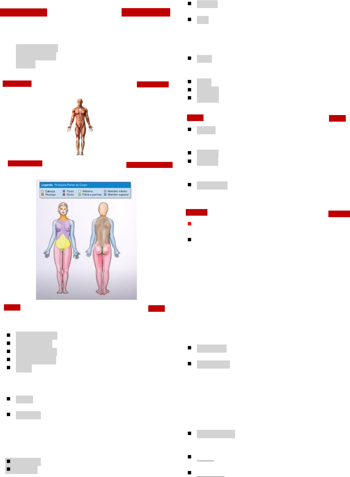 Stephanie Carolina Odontologia 1 periodo Anatomia Vistas do corpo ① Anterior / ventral: de frente ② Posterior / dorsal: de costas ③ Laterais: direita e esquerda Posição anatômica Partes do corpo Termos de comparação / relação Superior / cranial: mais próximo a cabeça Inferior / caudal: mais próximo aos pés Anterior / ventral: de frente Posterior / dorsal: de costas Medial: mais próximo ao plano mediano do corpo (linha que divide o corpo em 2 metades iguais, lado direito e esquerdo, a linha representa o plano mediano, quando a estrutura fica mais próxima ao plano mediano a estrutura é medial Lateral: estrutura longe do plano mediano ▪ O polegar é lateral do dedo mínimo Superficial: O quanto a estrutura está mais longe ou próxima da superfície do corpo ▪ Pele é superficial em relação aos músculos esqueléticos, e os ossos são profundos em relação aos músculos esqueléticos, os músculos são considerados intermediário Intermédio Profundo Proximal: O quanto a estrutura está próxima a origem do membro ou ao tronco Distal: Estrutura mais longe a origem do membro ou tronco ▪ O membro superior tem sua origem na articulação do ombro, o cotovelo é proximal em relação ao punho, por estar mais perto ao tronco do que o punho (que é distal em relação ao cotovelo) Dorso: superfície superior ou posterior de qualquer parte que se saliente anteriormente do corpo ▪ Dorso da língua, do nariz, do pé e costas das mãos Planta: face interior do pé ou da mão Protusão: mov. anterior como na protusão da mandíbula Retrusão: mov. Posterior como na retrusão da mandíbula Termos de lateralidade Bilateral: Quando a estrutura é par e está localizada em ambos os lados do corpo ▪ Rins Unilateral: estrutura localizada em apenas um lado do corpo Ipsilateral: do mesmo lado ▪ Mão direita é ipsilateral ao pé direito, ambos estão do mesmo lado do corpo, o direito Contralateral: do lado contrario ▪ Mão direita é contralateral a mão esquerda Variações anatômicas Estrutura fora do padrão mais frequente sem prejuízo funcional (conserva a sua função) Diferenças morfológicas externas ou internas, entre elementos que compõe um grupo ou no mesmo indivíduo onde se comparam 2 lados, sem prejuízo funcional para o indivíduo. ▪ Associadas ao: ➢ Tamanho da estrutura ➢ Gênero biológico (órgãos encontrados em mulheres que não são encontrados em homens) ➢ Idade (anatomia dos bebes – número de ossos maior - x anatomia dos adultos) ➢ Número: quantidade daquela estrutura encontrada no corpo (ossos, número de veias etc) ➢ Forma do órgão ➢ Fixação (inserções musculares) Normalidade: padrão que mais se repete e ocorre na maioria dos casos Anormalidade: estrutura pouco frequente e com prejuízo funcional (não conserva a sua função); alteração da forma ou posição do órgão que causa prejuízo na função mas é compatível com a vida. ▪ Polidactilia: pessoa que nasce com maior quantidade de dedos que o normal ▪ Caso de fissura labiopalatal – lábio leparino-) ▪ Compromete a função, mas não é algo severo, nem algo que impossibilita a vida Monstruosidade: estrutura com anomalia grave e incompatível com a vida ▪ Anencefalia: criança nasce sem o encéfalo Biótipo: resultado das características herdadas e adquiridas por influencia do meio em que vivem Longilíneos: aspecto magro, alto, pescoço longo Stephanie Carolina Odontologia 1 periodo Brevelíneos: em geral baixos, pescoço curto Médio líneos: características intermediárias em relação aos 2 tipos Planos anatômicos Cortes imaginários que atravessam o nosso corpo, ajudam a descrever o corpo humano tridimensionalmente e a descrever os cortes anatômicos Ajudam a descrever os movimentos do corpo humano Cortes anatômicos: corte sagital mediano, corte transversal e corte coronal (plano sagital mediano e demais planos sagitais) Plano vertical, que corta o corpo em duas partes iguais, lado direito e lado esquerdo ▪ Os demais planos que passam paralelo ao plano sagital mediano são os sagitais (plano frontal ou coronal) Plano vertical que atravessa o corpo dividindo ele em parte anterior e posterior (9plano transversos ou axiais) Planos horizontais que dividem o corpo em parte superior e inferior (eixos) Linhas imaginarias ao redor das quais acontecem os movimentos do corpo Os movimentos acontecem dentro dos planos e ao redor dos eixos Eixo látero-lateral ou transversal: atravessam o corpo lateralmente de um lado para o outro, e atravessa o plano sagital, movimento de flexão e extensão (articulação do cotovelo) Eixo ântero-posterior ou sagital: atravessa o corpo de frente para trás, o plano frontal (movimento de abdução – levantar e descer os braços – e adução) Eixo longitudinal, céfalo-podálico ou crânio-caudal: atravessam o corpo de forma longitudinal, de cima para baixo, acontecem os movimentos de rotação – cabeça-, atravessa o plano transverso) Abreviações A – artéria Aa – artérias M – musculo Mm - músculos N – nervo Nn – nervos R – ramo Rr - ramos V - veia Vv - veias Lig - ligamento Ligg – ligamentos Planos de construção do corpo Antimeria: o corpo é constituído por 2 metades aparentemente simétricas Metameria: o corpo é constituído atrvés de peças sobrepostas no sentido longitudinal (coluna vertebral) Paquimeria: segmento axial é dividido em 2 tubos (anterior e posterior) ▪ Paquimero visceral / ventral: espinal, torácica, abdominal e pélvica ▪ Paquimero neural / dorsal: nasal, boca, craniana e timpânica