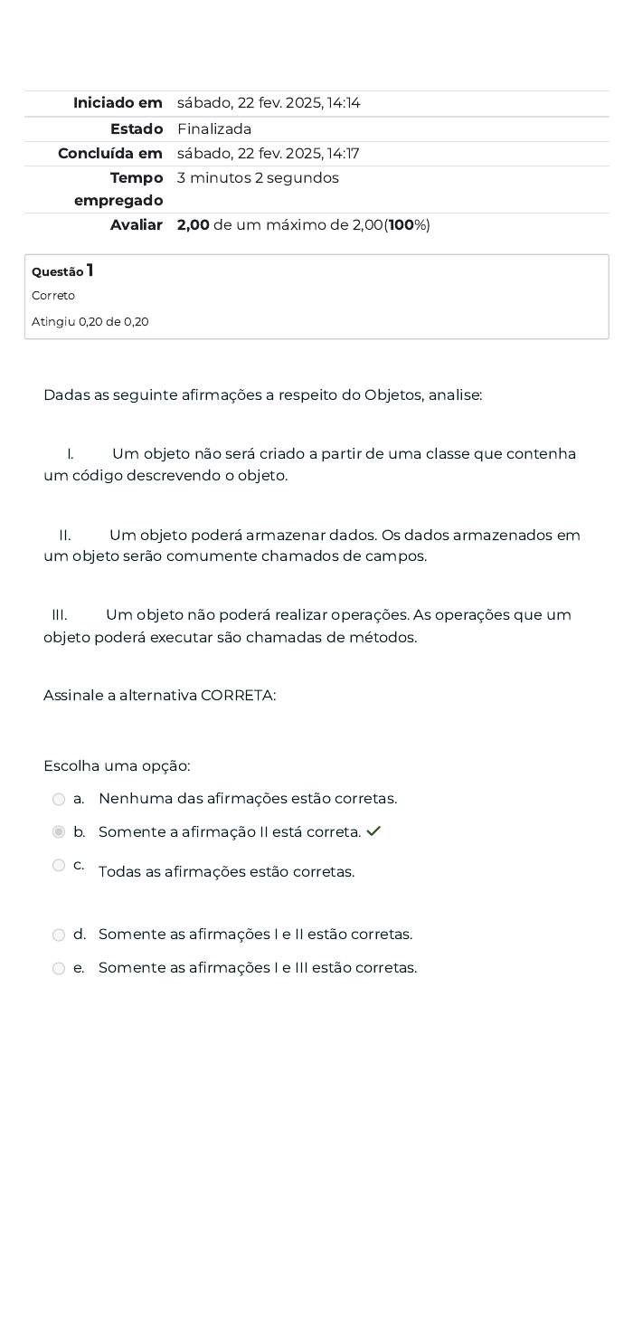 Iniciado em sábado, 22 fev. 2025, 14:14 Estado Finalizada Concluída em sábado, 22 fev. 2025, 14:17 Tempo empregado 3 minutos 2 segundos Avaliar 2,00 de um máximo de 2,00(100%) Questão 1 Correto Atingiu 0,20 de 0,20 Dadas as seguinte afirmações a respeito do Objetos, analise: I. Um objeto não será criado a partir de uma classe que contenha um código descrevendo o objeto. II. Um objeto poderá armazenar dados. Os dados armazenados em um objeto serão comumente chamados de campos. III. Um objeto não poderá realizar operações. As operações que um objeto poderá executar são chamadas de métodos. Assinale a alternativa CORRETA: Escolha uma opção: a. Nenhuma das afirmações estão corretas. b. Somente a afirmação II está correta. ✓ c. Todas as afirmações estão corretas. d. Somente as afirmações I e II estão corretas. e. Somente as afirmações I e III estão corretas. Questão 2 Correto Atingiu 0,20 de 0,20 Em relação às afirmações sobre o Encapsulamento de Propriedades e seus conceitos, podemos afirmar: I. O encapsulamento é um mecanismo de programação que vincula o código e os dados que ele tratará, e isso manterá os dois seguros contra a interferência e a má utilização externa. II. Em uma linguagem orientada a objetos, o código e os dados poderão ser vinculados de tal forma que uma caixa preta autônoma seja criada. Dentro da caixa, estarão todo o código e os dados necessários. III. No encapsulamento, o código ou os dados privados poderão ser acessados por uma parte do programa que exista fora do objeto. Assinale a alternativa CORRETA: Escolha uma opção: a. Somente as afirmações I e III estão corretas. b. Somente as afirmações I e II estão corretas. ✓ c. Somente a afirmação III está correta. d. Todas as afirmações estão corretas. e. Nenhuma das afirmações estão corretas. Questão 3 Correto Atingiu 0,20 de 0,20 Em relação às afirmações a seguir, a respeito da Captura e Tratamento das Exceções, poderemos considerar: I. O nome "exceção" sugere que o problema ocorrerá com pouca frequência. II. Uma instrução normalmente executará corretamente, então o problema representará a "exceção à regra". III. O tratamento de exceção ajudará a criar programas tolerantes a falhas que poderão resolver ou tratar exceções. Considere a alternativa CORRETA. Escolha uma opção: a. Todas as afirmações estão corretas. ✓ b. Somente as afirmações I e III estão corretas. c. Nenhuma das afirmações estão corretas. d. Somente as afirmações I e II estão corretas. e. Somente a afirmação III está correta. Questão 4 Correto Atingiu 0,20 de 0,20 Analise as seguintes afirmações: I. A maioria das plataformas não poderão exibir todos os caracteres Unicode, atualmente definido. Como resultado, os programas Java poderão ser gravados com sequências de escape Unicode especiais. II. O código-fonte Java poderá ser escrito usando a codificação de caracteres Unicode e armazenado em seu formato completo de 16 bits ou com valores de caracteres Unicode codificados em ASCII. III. Um objeto poderá armazenar dados. Os dados armazenados em um objeto serão comumente chamados de campos. Um objeto poderá realizar operações. As operações que um objeto poderá executar são chamadas de métodos. Assinale a alternativa CORRETA: Escolha uma opção: a. Somente a afirmação III está correta. b. Todas as afirmações estão corretas. ✓ c. Nenhuma das afirmações estão corretas. d. Somente a afirmação II está correta. e. Somente a afirmação I está correta. Questão 5 Correto Atingiu 0,20 de 0,20 Dada as afirmações sobre os Modificadores de Acesso de Classes e Membros, analise: I. Os modificadores de acesso são padrões de visibilidade de acessos às classes, atributos e métodos. II. O bom uso dos modificadores de acesso será importante para definir uma implementação coerente com as especificações de projeto, determinando como serão os acessos às classes, métodos e/ou variáveis. III. Os modificadores de acesso serão definidos sempre em palavras minúsculas, tais como public, private, protected, default, static, final, native, synchronized, volatile. Assinale a alternativa CORRETA: Escolha uma opção: a. Nenhuma das afirmações estão corretas. b. Somente as afirmações I e II estão corretas. c. Somente as afirmações I e III estão corretas. d. Todas as afirmações estão corretas ✓ e. Somente a afirmação III está correta. Questão 6 Correto Atingiu 0,20 de 0,20 Em relação aos Construtores, assinale V VERDADEIRO ou F FALSO, para as seguintes afirmações: ( ) Na linguagem Java se um construtor for definido, será assumido um construtor default da própria linguagem. ( ) O construtor deverá possuir sempre o mesmo nome de sua classe e será sintaticamente semelhante a um método, quando for declarado. ( ) O construtor padrão não permitirá que clientes da classe inicializem a data/hora com valores não zero específico. ( ) Os campos de uma classe private só poderão ser manipulados pelos seus métodos. ( ) Métodos set() também são comumente chamados métodos modificadores, porque eles geralmente modificam os valores das variáveis de instância. Os métodos get() também são comumente chamados de métodos de acesso ou métodos de consulta. Escolha uma opção: a. F, V, V, V,F. b. V, V, F, V, F. c. V, F, V, F, F. d. F, V, V, V, V. ✓ e. V, F, F, V, V. Questão 7 Correto Atingiu 0,20 de 0,20 Assinale V VERDADEIRO ou F FALSO, para as seguintes afirmações: ( ) Cada objeto possuirá um conjunto de métodos que poderão ser chamados, fazendo com que o objeto execute uma operação. ( ) Quando o programa precisar de um objeto para fazer algo, ele chama o método apropriado. ( ) Os modificadores de acesso não são padrões de visibilidade de acessos às classes, atributos e métodos. ( ) Os modificadores são palavras-chaves reservadas pela linguagem Java, que não poderão ser usada