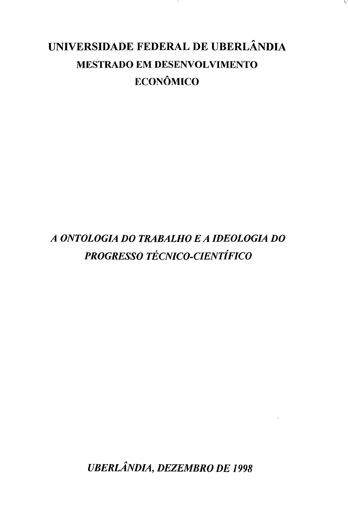 UNIVERSIDADE FEDERAL DE UBERLÂNDIA MESTRADO EM DESENVOLVIMENTO ECONÔMICO A ONTOLOGIA DO TRABALHO E A IDEOLOGIA DO PROGRESSO TÉCNICO-CIENTÍFICO UBERLÂNDIA, DEZEMBRO DE 19982 UNIVERSIDADE FEDERAL DE UBERLÂNDIA MESTRADO EM DESENVOLVIMENTO ECONÔMICO A ONTOLOGIA DO TRABALHO EA IDEOLOGIA DO PROGRESSO DIRBI/UFU 1000187174 FÁBIO CÉSAR DA FONSECA Dissertação de Mestrado apresentada ao Mestrado em Desenvolvimento Econômico da Universidade Federal de Uberlândia sob a orientação do Prof. Dr. Carlos Águedo Nagel Paiva.3 AGRADECIMENTOS À professora Gláucia Campregher - pessoa fundamental no trabalho de orientação desta dissertação -, pelas longas e admiráveis discussões em torno do trabalho, Ao meu orientador, Carlos Paiva, pela grande capacidade intelectual e humana com que me dirigiu críticas duras e incisivas. Aos meus pais, Álvaro e Conceição, pela paciência e compreensão. Aos meus irmãos, João, Paulo e Gladstone, pelas trilhas que vamos tentando fazer em busca de uma sociedade mais justa. À minha filha, que tinha cinco meses quando comecei o curso de mestrado, e, hoje, com três anos, me dá sinais de que valeu a pena a minha ausência. À minha esposa, Dulcinéa, pela confiança e dedicação e porque, juntos, aprendemos que também o amor só perdura se tivermos dispostos a aprender, a esperar e sobretudo a agir.4 SUMÁRIO PÁGINA INTRODUÇÃO 05 CAPÍTULO I - SIGNIFICADO E PERTINÊNCIA DA ONTOLOGIA DO TRABALHO 11 1 - Questões preliminares sobre o conceito de trabalho 12 2 - Hegel e o sentido positivo do trabalho 20 3 - Marx e a dialética do trabalho no capitalismo 23 CAPÍTULO II - CONSIDERAÇÕES SOBRE TÉCNICA E TECNOLOGIA 29 1 - - Schumpeter e a relação do desenvolvimento tecnológico com o capital 32 2 - Conceito de técnica e de tecnologia 47 3 - Três perspectivas históricas sobre técnica e tecnologia: sistemas técnicos, revoluções tecnológicas e extensão do corpo humano 50 4 - A anterioridade do trabalho em relação à técnica e à tecnologia 57 CAPÍTULO III - ONTOLOGIA DO TRABALHO E IDEOLOGIA DO PROGRESSO TÉCNICO-CIENTÍFICO 64 1 - Negação do trabalho e dinâmica capitalista recente 65 2 - Negação do trabalho e ideologia dominante 76 3 - A ideologia do progresso e a a inversão da anterioridade do trabalho 85 BIBLIOGRAFIA 965 INTRODUÇÃO À primeira vista, nossa temática pode soar como mais um estudo na linha filosófica, ou que vai no sentido de uma interdisciplinaridade. Nossa intenção não foi seguir por nenhum desses caminhos, embora seja de grande importância a análise econômica da realidade que leva em consideração outras disciplinas como a filosofia, a sociologia, a história, a antropologia, etc. Neste sentido, nosso objetivo não é o de nos aprofundarmos no tema da ontologia, mas o de contribuir um pouco mais para o papel de relevância que deveria ter a Ontologia do Trabalho na Economia Política. Assim sendo, gostaríamos de destacar desde já o que entendemos por ontologia. Ontologia significa ir às raízes, buscar o sentido e o fundamento da realidade humana no mundo. Este fundamento é colocado em "estruturas estruturantes" distintas conforme a representação que se faz desta realidade. Se se parte de uma perspectiva idealista, a ontologia se caracterizará por uma preocupação metafísica, transcendental, isto é, estará colocando como fundamento último da realidade o Por outro lado, se se parte de uma perspectiva materialista, a ontologia buscará um fundamento concreto da realidade, como "o trabalho". A ontologia do trabalho, portanto, coloca "o trabalho" como anterior às organizações sócio-políticas, culturais e econômicas da humanidade. E como base, fundamento, da própria história. Trata-se então de uma ontologia que não é apenas o ponto de partida, mas referência crítica e conceitual com a qual estamos a todo instante delimitando e construindo o nosso objeto de estudo. Procuramos reconhecer "o trabalho" como ponto de partida para a compreensão do processo econômico como tendo uma historicidade estrutural, pois "o trabalho" não é outra coisa que a universalização, via abstração, das relações sociais que os homens estabelecem entre si, fundamentalmente para provê-los da materialidade que lhes garante a vida. Neste sentido, partimos de uma prioridade conceitual que não se traduz numa mera especulação teórica, mas numa articulação de categorias construídas a partir das distintas realidades concretas que dão base e estruturam conceito de trabalho.6 Se esse conceito aparece assim como uma expressão genérica, que pode deixar transparecer uma ação descontextualizada historicamente, isto se dá porque no capitalismo "o trabalho" atingiu um grau extremamente alto de abstração; tornou-se uma "abstração real", como diria Marx. O importante, e o necessário da pesquisa científica, é, contudo, especificar as formas em que o trabalho vem se concretizando, conforme o seu momento histórico determinado. Uma das dificuldades que enfrentamos neste estudo foi a demonstração da centralidade do trabalho não apenas no processo produtivo, mas do trabalho como categoria que antecede ao desenvolvimento das forças produtivas, da técnica e da ciência; como categoria que antecede e explica as formas dos homens se articularem social e culturalmente e, portanto, como categoria que funda a história. As dificuldades se justificam porque se o trabalho, na dimensão em que o estamos considerando, foi ganhando aos poucos as determinações que o tornaram conceito, hoje a organização capitalista da produção, que levou às últimas consequências esse processo de abstração do trabalho, não mais colabora no sentido da positivação dessa abstração, quando, por exemplo, não reconhece o trabalho como fonte de toda riqueza. Pelo contrário, a atual organização capitalista da produção nega o trabalho como fundamento, ao colocá-lo como redundante para a produção de riqueza. Em r