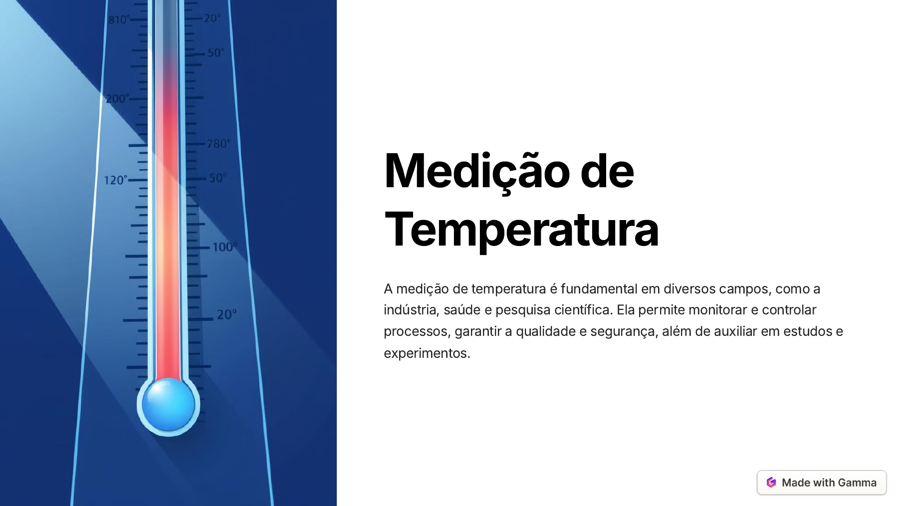 Medição de Temperatura A medição de temperatura é fundamental em diversos campos, como a indústria, saúde e pesquisa científica. Ela permite monitorar e controlar processos, garantir a qualidade e segurança, além de auxiliar em estudos e experimentos. https://gamma.app/?utm_source=made-with-gamma Conceito Temperatura é uma medida do grau de agitação térmica das moléculas de um corpo. Quanto maior a agitação, maior a temperatura. A temperatura é uma grandeza escalar, representada em graus Celsius (°C), Fahrenheit (°F) ou Kelvin (K). Agitação Molecular As moléculas dos corpos estão em constante movimento, vibrando e se deslocando. Energia Cinética O movimento das moléculas é relacionado à energia cinética, que aumenta com a temperatura. Equilíbrio Térmico Corpos em contato tendem a trocar calor até atingirem a mesma temperatura. https://gamma.app/?utm_source=made-with-gamma Temperatura e Calor Temperatura e calor são conceitos distintos, embora relacionados. Temperatura é uma medida da agitação térmica, enquanto calor é a energia térmica transferida entre corpos em temperaturas diferentes. 1 Calor É a energia térmica transferida entre corpos em diferentes temperaturas. 2 Energia Térmica É o somatório das energias cinéticas dos seus átomos e, além de depender da temperatura, depende também da massa e do tipo de substância. 3 Temperatura Medida do grau de agitação térmica das moléculas. https://gamma.app/?utm_source=made-with-gamma Temperatura e Calor Temperatura e calor são conceitos distintos, embora relacionados. 1 Condução O calor flui de uma região de alta temperatura para outra de temperatura mais baixa, dentro de um meio sólido, líquido ou gasoso ou entre meios diferentes em contato físico direto. 2 Convecção Transporte de energia pela ação combinada da condução de calor, armazenamento de energia e movimento da mistura. 3 Irradiação O calor flui de um corpo de alta temperatura para um de baixa, quando os mesmos estão separados no espaço, ainda que exista um vácuo entre eles. https://gamma.app/?utm_source=made-with-gamma Termometria É a área da ciência que estuda os métodos e instrumentos utilizados para medir a temperatura. 1 Pirometria É um método de medição de altas temperaturas, onde pode- se ser observado os efeitos da radiação térmica. 2 Criometria É o método de medição de baixas temperaturas, aquela próximas do zero absoluto. https://gamma.app/?utm_source=made-with-gamma Escalas de Temperatura Existem diversas escalas de temperatura, sendo as mais comuns Celsius (°C), Fahrenheit (°F) e Kelvin (K). Cada escala possui um ponto de referência e uma escala de graduação específica. Escala Ponto de Congelamento da Água Ponto de Ebulição da Água Celsius (°C) 0 °C 100 °C Fahrenheit (°F) 32 °F 212 °F Kelvin (K) 273,15 K 373,15 K https://gamma.app/?utm_source=made-with-gamma Propriedades termométricas 1 Dilatação termica 2 Variação da Resistencia elétrica 3 Força eletromotriz termoelétrica 4 Emissão de radiação eletromagnética https://gamma.app/?utm_source=made-with-gamma Efeitos Termoelétricos Efeitos termoelétricos ocorrem quando uma corrente elétrica é gerada devido a uma diferença de temperatura entre dois materiais diferentes. Esse princípio é utilizado em termopares para medir a temperatura. Efeito Seebeck Gerar uma diferença de potencial (FEM) entre dois pontos de um circuito, quando as junções desses pontos se encontram a temperaturas diferentes. Efeito Peltier A absorção ou liberação de calor quando uma corrente elétrica flui através da junção de dois condutores diferentes. https://gamma.app/?utm_source=made-with-gamma Leis Termoelétricas As leis termoelétricas descrevem o comportamento dos termopares e como a FEM varia em função da temperatura. 1 Lei do Circuito Homogêneo A força eletromotriz gerada depende apenas da diferença de temperatura entre a junção de medição e a de referência. https://gamma.app/?utm_source=made-with-gamma Leis Termoelétricas As leis termoelétricas descrevem o comportamento dos termopares e como a FEM varia em função da temperatura. 1 Lei dos Materiais Intermediários A soma algébrica das forças eletromotrizes (FEM) térmicas em um circuito que contém diferentes metais é igual a zero quando todo o circuito está à mesma temperatura. https://gamma.app/?utm_source=made-with-gamma Leis Termoelétricas As leis termoelétricas descrevem o comportamento dos termopares e como a FEM varia em função da temperatura. 1 Lei das Temperaturas Intermediárias Essa lei revela uma característica adicional da força eletromotriz termoelétrica em relação à diferença de temperatura entre suas extremidades. https://gamma.app/?utm_source=made-with-gamma Instrumentos de Medição de Temperatura 1 Transdutores 2 Termômetros 3 Termopares 4 Termorresistências 5 Sensores de temperatura por radiação https://gamma.app/?utm_source=made-with-gamma Transdutores Um transdutor recebe a informação da grandeza que se deseja medir e converte essa informação em um sinal elétrico proporcional a ela. https://gamma.app/?utm_source=made-with-gamma Termômetros de Dilatação Características Os termômetros de expansão são termômetros que se baseiam no coeficiente de dilatação térmica dos materiais. Funcionamento Funcionam com base na lei da expansão volumétrica do líquido em resposta à variação de temperatura, dentro de um recipiente fechado. Leitura A medida em que a temperatura aumenta ou diminui, o gás se expande ou se contrai, movendo o indicador para fornecer uma leitura precisa. https://gamma.app/?utm_source=made-with-gamma Termômetros Bimetálicos Características Os termômetros de expansão são termômetros que se baseiam no coeficiente de dilatação linear dos metais com a temperatura. Funcionamento É formado por duas lâminas de metais diferentes, com coeficientes de dilatação distintos. Quando a t