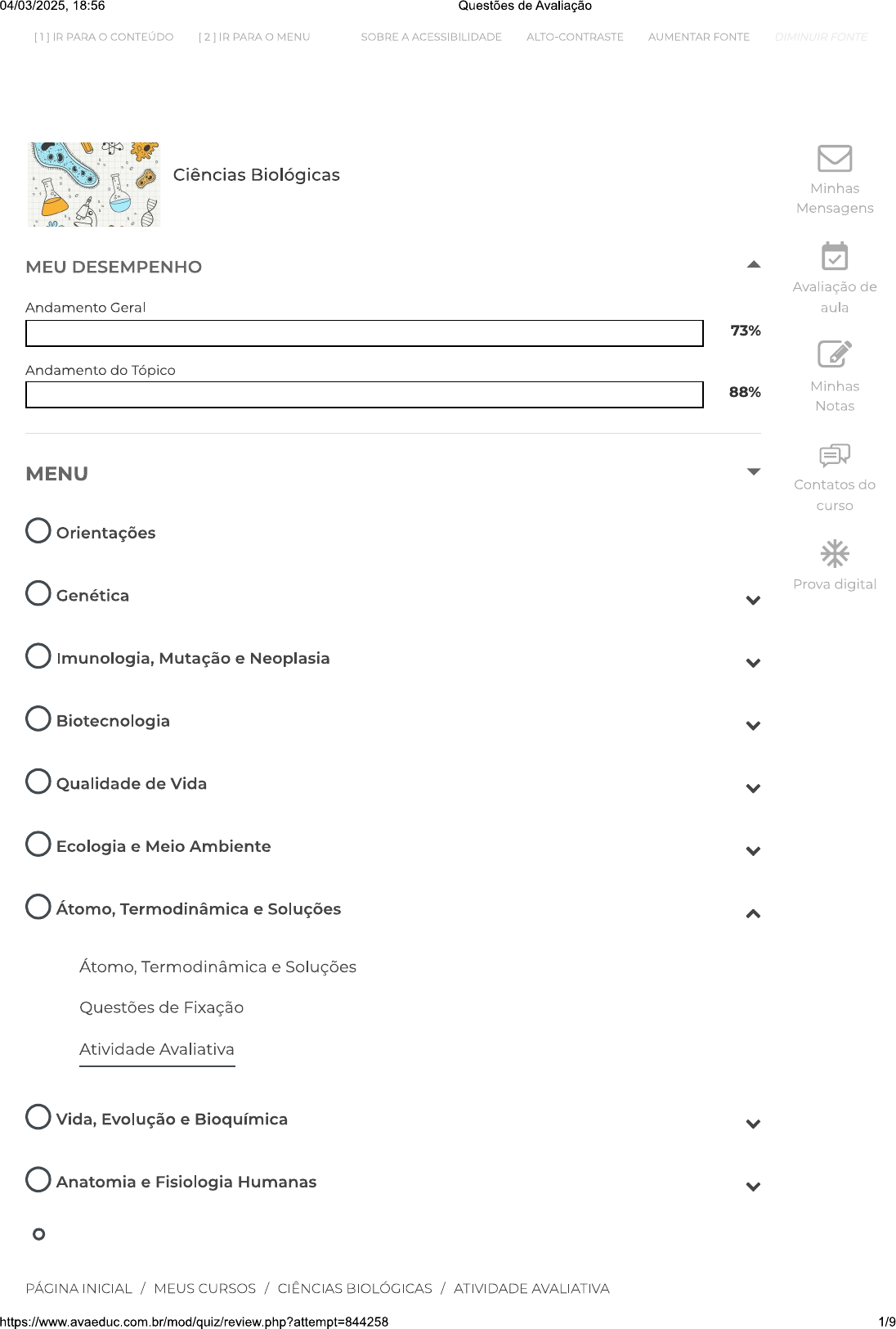 04/03/2025, 18:56 Questões de Avaliação [1] IR PARA CONTEÚDO [2] IR PARA O MENU SOBRE A ACESSIBILIDADE ALTO-CONTRASTE AUMENTAR FONTE DIMINUIR FONTE Ciências Biológicas Minhas Mensagens MEU DESEMPENHO Avaliação de Andamento Geral aula 73% Andamento do Tópico 88% Minhas Notas MENU Contatos do curso Orientações Prova digital Genética Imunologia, Mutação e Neoplasia Biotecnologia Qualidade de Vida Ecologia e Meio Ambiente Átomo, Termodinâmica e Soluções Átomo, e Soluções Questões de Fixação Atividade Avaliativa Vida, Evolução e Bioquímica Anatomia e Fisiologia Humanas PÁGINA INICIAL / MEUS CURSOS / CIÊNCIAS BIOLÓGICAS / ATIVIDADE AVALIATIVA https://www.avaeduc.com.br/mod/quiz/review.php?attempt=844258 1/904/03/2025, 18:56 Questões de Avaliação [1] IR PARA CONTEÚDO [2] IR PARA O MENU SOBRE A ACESSIBILIDADE ALTO-CONTRASTE AUMENTAR FONTE DIMINUIR FONTE Questões de Avaliação Iniciado em terça, 4 mar 2025, 18:32 Estado Finalizada Concluída em terça, 4 mar 2025, 18:55 Tempo 23 minutos 39 segundos empregado Avaliar 9,00 de um máximo de 10,00(90%) Questão 1 Correto Atingiu 1,00 de 1,00 J.J. Thomson determinou, em 1897, a relação carga/massa do elétron através da experiência com tubo de raios catódicos. Sua descoberta rendeu um prêmio Nobel e rompeu com a concepção de Dalton, de que átomo era uma esfera Marque a alternativa que aponta uma contribuição de Thomson ao modelo atômico: Escolha uma: a. Os elétrons giram em órbitas de energia bem definida. b. Os elétrons giram na eletrosfera. C. Sua descoberta mostrou a existência de partículas subatômicas. d. A relação carga/massa permitiu descobrir a massa do nêutron. e. Comprovação da Lei de Conservação de Massas. 2/904/03/2025, 18:56 Questões de Avaliação [1] IR PARA CONTEÚDO [2] IR PARA O MENU SOBRE A ACESSIBILIDADE ALTO-CONTRASTE AUMENTAR FONTE DIMINUIR FONTE Correto Atingiu 1,00 de 1,00 No ano de 2016 foram batizados quatro novos elementos químicos produzidos em laboratório. Seus nomes são Nohônio, Tenessino, Oganessônio e Moscóvio. Esse último faz referência a Moscou, a capital da Rússia. Tendo 173 nêutrons, sendo elemento 115 da tabela periódica, Moscóvio pode ser representado apenas por: Escolha uma: a. 115Mc288 b. C. d. e. 3/904/03/2025, 18:56 Questões de Avaliação [1] IR PARA CONTEÚDO [2] IR PARA MENU SOBRE A ACESSIBILIDADE ALTO-CONTRASTE AUMENTAR FONTE DIMINUIR FONTE Incorreto Atingiu 0,00 de 1,00 A água, também chamada de solvente universal, pode ser utilizada para dissolver uma grande variedade de solutos e formar que chamamos de solução aquosa. A ideia de que a água é um solvente universal vem do fato de que ela é capaz de dissolver solutos sólidos, líquidos e gasosos. Uma solução líquida, como a aquosa, pode se encontrar em três situações: saturada, insaturada e supersaturada. Em relação a uma solução aquosa supersaturada, pode-se dizer que: Escolha uma: a. A água recebeu uma quantidade de soluto maior do que ela é capaz de dissolver na temperatura em que ela se encontra e há formação de corpo de fundo. b. A água recebeu uma quantidade de soluto maior do que ela é capaz de dissolver em condições normais e não há formação de corpo de fundo, sem que ocorra alguma perturbação do sistema. C. A água recebeu uma quantidade de soluto menor do que ela é capaz de dissolver na temperatura em que ela se encontra. d. A água se encontra numa temperatura elevada e dissolve todo soluto que recebe. e. A água recebeu a quantidade exata de soluto que ela é capaz de dissolver na temperatura em que ela se encontra. https://www.avaeduc.com.br/mod/quiz/review.php?attempt=844258 4/904/03/2025, 18:56 Questões de Avaliação [1] IR PARA CONTEÚDO [2] IR PARA O MENU SOBRE A ACESSIBILIDADE ALTO-CONTRASTE AUMENTAR FONTE DIMINUIR FONTE Correto Atingiu 1,00 de 1,00 A solubilidade de um soluto tem relação direta com a temperatura sobre a qual a solução se encontra e com a concentração de solvente presente. Tendo isso em vista, um soluto X tem a 20°C seu coeficiente de solubilidade igual a 12g/100g de água, ou seja, 100g de água a 20°C são capazes de dissolver 12g deste soluto. Se uma solução é preparada com 20g do soluto X completamente dissolvidos em 100g de água a 60°C e, logo em seguida é resfriada a 20°C: Escolha uma: a. não é possível prever que vai ocorrer. b. todo soluto passa a formar corpo de fundo; C. 12g do soluto se depositam no fundo do recipiente; d. 8g do soluto se depositam no fundo do recipiente; e. todo soluto continuará dissolvido na solução; Questão 5 Correto Atingiu 1,00 de 1,00 Certa bebida foi alvo de críticas por conter mercúrio, que é um metal pesado, em sua composição. Estas críticas fizeram muita gente crer que a bebida fosse prejudicial a saúde. Porém a comunidade científica rebateu as críticas com argumento de que a quantidade deste metal presente era muito pequena para fazer mal a saúde. Se um volume de 0,5mL contém 0,01mg de Hg, qual a molaridade de mercúrio na bebida? (Massa molar de Hg é 200g) Escolha uma: a. 0,02 mol b. 0,0001 mol C. 0,0002 mol d. 0,001 mol e. 0,01 mol 5/904/03/2025, 18:56 Questões de Avaliação [1] IR PARA CONTEÚDO [2] IR PARA O MENU SOBRE A ACESSIBILIDADE ALTO-CONTRASTE AUMENTAR FONTE DIMINUIR FONTE Correto Atingiu 1,00 de 1,00 É sabido que determinada máquina de Carnot opera entre fontes de temperaturas 210K e 700K. A máquina recebe 1700J de calor da fonte quente e então rejeita uma certa quantidade de calor para a fonte fria. Determine trabalho realizado pela máquina de Carnot descrita acima: Escolha uma: a. 510 J. b. 1000 J. C. 1190 J. d. 1490 J. e. 700 J. Questão 7 Correto Atingiu 1,00 de 1,00 A solubilidade de uma solução é a propriedade que relaciona a capacidade que uma substância tem de se dissolver em outra. Essa grandeza é medida de acordo com a concentração de saturação da solução. Se uma solução aquosa está saturada na t