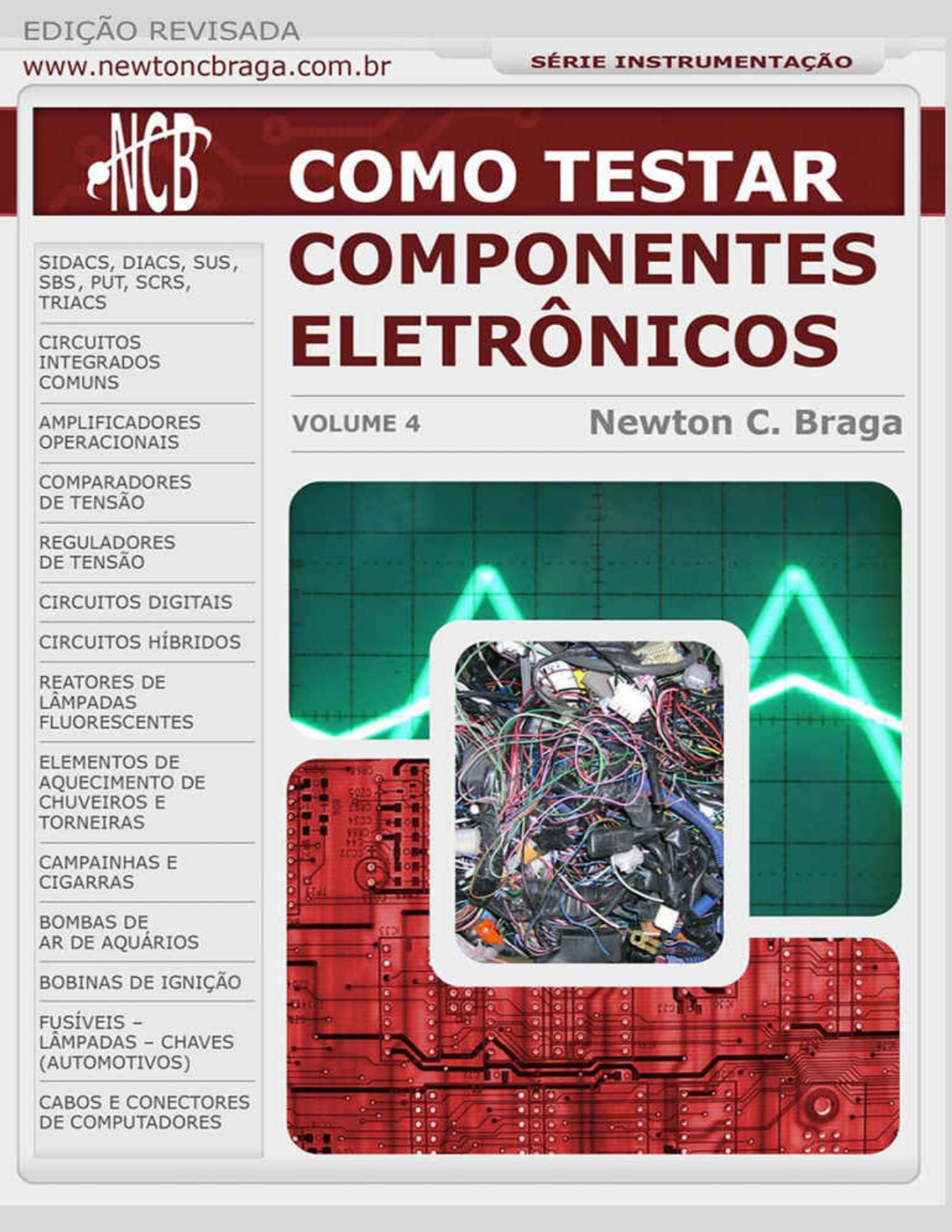 Newton C. Braga COMO TESTAR COMPONENTES ELETRÔNICOS VOLUME 4 EDIÇÃO REVISADA São Paulo - 2016 Institute NCB www.newtoncbraga.com leitor@newtoncbraga.com.br Autor: Newton C. Braga São Paulo - Brasil - 2016 Palavras-chave: Eletrônica - Reparo - Service - Componentes - Elétrica Diretor responsável: Newton C. Braga Diagramação e Coordenação: Renato Paiotti MAIS INFORMAÇÕES INSTITUTO NEWTON C. BRAGA http://www.newtoncbraga.com.br NOTA IMPORTANTE Esta série de livros fornece conhecimentos básicos de eletrônica para cursos regulares, cursos a distância e para autodidatas consistindo, portanto numa literatura cuja finalidade é apoio, iniciação ou complementação de conhecimentos. Sua aquisição não implica no direito a obtenção de certificados ou diplomas os quais devem ser emitidos pelas instituições que adotam o livro ou ainda ministram cursos de outras formas. Da mesma forma o autor ou a editora não se responsabilizam por eventuais problemas que possam ser causados pelo uso indevido das informações nele contidas como o não funcionamento de projetos, ferimentos ou danos causados a terceiros de forma acidental ou proposital, ou ainda prejuízos de ordem moral ou financeira. Os eventuais experimentos citados quando realizados por menores devem ter sempre a supervisão de um adulto. Todo cuidado foi tomado para que o material utilizado seja encontrado com facilidade na época da edição do livro, mas as mudanças tecnológicas são muito rápidas o que nos leva a não nos responsabilizarmos pela eventual dificuldade em se obter componentes para os experimentos quando indicados em outros livros desta série. http://www.newtoncbraga.com.br Índice 1 - SEMICONDUTORES 1.1 - SIDACs 1.2 - DIACs 1.3 - SUS 1.4 - SBS 1.5 - PUT 1.6 - SCRs 1.7 - Triacs 2 - CIRCUITOS INTEGRADOS 2.1 - Circuitos integrados comuns 2.2 - Amplificadores operacionais 2.3 - Comparadores de Tensão 2.4 - Reguladores de tensão 3 - CIRCUITOS E DISPOSITIVOS 3.1 - Circuitos digitais 3.2 - Circuitos híbridos 4 - OUTROS DISPOSTIVOS 4.1 – Reatores de Lâmpadas Fluorescentes 4.2 - Elementos de aquecimento de chuveiros e torneiras 4.3 - Campainhas e cigarras 4.4 - Bombas de ar de aquários 4.5 - Bobinas de ignição 4.6 - Fusíveis – Lâmpadas – Chaves (Automotivos) 4.7 - Cabos e Conectores de Computadores LIVROS TÉCNICOS Introdução No volume anterior ensinamos como testar um primeiro grupo de componentes semicondutores. No entanto, eles não são os únicos desta grande família que os profissionais, estudantes e praticantes da eletrônica em geral vão encontrar na sua atividade. Além deles, existem outros tipos de componentes semicondutores Neste quarto volume da série, continuaremos a ensinar como testar componentes da famíilia dos semicondutores que não foram vistos no volume anterior. Esses dispositivos semicondutores, como os demais, são os elementos básicos de todos os equipamentos eletrônicos modernos. O teste de tais componentes ou mesmo circuitos oferece um enorme desafio ao profissional da eletrônica. Em alguns casos procedimentos muitos simples podem revelar muito sobre o estado de tais componentes. No entanto, existem casos, em que os dispositivos testados são tão complexos que se torna impossível dizer alguma coisa sobre seu estado com um teste simples. Para esses casos pode-se utilizar procedimentos que envolvam a montagem de circuitos de simulação ou ainda a realização de diversas medidas, que possam dar um quadro geral do que ocorre com o dispositivo. Indo além, podemos contar com a ajuda do osciloscópio para levantar as curvas características de tais componentes em que, muito além de um simples teste, teremos informações importantes sobre seu estado e o modo de usá-lo. Neste volume focalizaremos os principais testes que podem ser realizados com esses componentes semicondutores usando desde simples provador de continuidade ou multímetro até recursos mais elaborados que envolvam o uso de instrumentos sofisticados como geradores de funções, osciloscópios e outros. 1 - SEMICONDUTORES 1.1 - SIDACs O que são Os SIDACs são diodos de quatro camadas da família dos tiristores. Tratam-se de dispositivos que disparam (conduzindo intensamente) quando a tensão entre esses terminais alcança um determinado valor. Os tipos mais comuns são especificados para tensões de 120 e 240 V, sendo portanto indicados para aplicações na rede de corrente alternada de 110 (117 ou 127 V) e 220 V (220 ou 240 V), no entanto existem tipos a partir de 30 V. Na figura 1 temos o símbolo e aspecto desses componentes que encontram aplicações em controles de potência, circuitos de proteção, economizadores de energia, etc. O que Testar A simples medida da resistência entre os terminais nada revela, já que são dispositivos bilaterais (suas características são as mesmas nos dois sentidos). Esse tipo de teste apenas permite detectar um SIDAC em curto, mas não se ele está bom. Para sabermos se ele está bom será preciso montar um circuito de prova. Instrumentos Usados Multímetro Provador de Continuidade Circuito de Teste Circuito de Teste e Osciloscópio O teste Existem várias formas de se comprovar o estado de um Sidac. A seguir, damos algumas: a. Prova de Continuidade A prova de continuidade apenas revela se um SIDAC está ou não em curto. Se está bom, é preciso ir além com o circuito de prova. Com o osciloscópio podemos ir além verificando qual é a tensão de disparo. Procedimento Coloque o multímetro numa escala baixa de resistências (ohms x1 ou ohms x10 se for analógico ou 200/2000 ohms se for digital). Para os tipos analógicos, zere-o antes de usar. No caso do provador de continuidade, basta colocá-lo em condições de funcionar. Retire o SIDAC do circuito e faça a medida das resistências no sentido direto e no sentido inverso. Lembramos que o Sidac não tem polaridade, por isso não há marcação no seu involucro. A figura 2 mostra como essa prova deve 