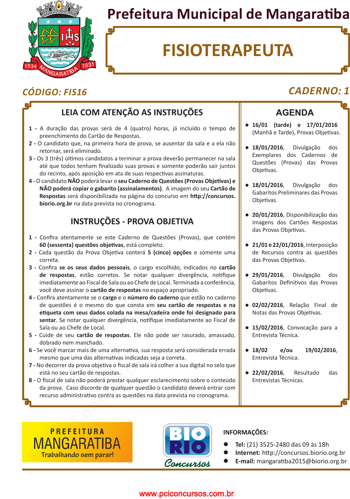 pcimarkpci MDAwMDowMDAwOjAwMDA6MDAwMDowMDAwOmZmZmY6YjViZjozZTlj:VGh1LCAxMyBNYXIgMjAyNSAwOToyNzoyNSAtMDMwMA== www.pciconcursos.com.br LEIA COM ATENÇÃO AS INSTRUÇÕES 1 - A duração das provas será de 4 (quatro) horas, já incluído o tempo de preenchimento do Cartão de Respostas. 2 - O candidato que, na primeira hora de prova, se ausentar da sala e a ela não retornar, será eliminado. 3 - Os 3 (três) últimos candidatos a terminar a prova deverão permanecer na sala até que todos tenham finalizado suas provas e somente poderão sair juntos do recinto, após aposição em ata de suas respectivas assinaturas. 4 - O candidato NÃO poderá levar o seu Caderno de Questões (Provas Objetivas) e NÃO poderá copiar o gabarito (assinalamentos). A imagem do seu Cartão de Respostas será disponibilizada na página do concurso em http://concursos. biorio.org.br na data prevista no cronograma. INSTRUÇÕES - PROVA OBJETIVA 1 - Confira atentamente se este Caderno de Questões (Provas), que contém 60 (sessenta) questões objetivas, está completo. 2 - Cada questão da Prova Objetiva conterá 5 (cinco) opções e somente uma correta. 3 - Confira se os seus dados pessoais, o cargo escolhido, indicados no cartão de respostas, estão corretos. Se notar qualquer divergência, notifique imediatamente ao Fiscal de Sala ou ao Chefe de Local. Terminada a conferência, você deve assinar o cartão de respostas no espaço apropriado. 4 - Confira atentamente se o cargo e o número do caderno que estão no caderno de questões é o mesmo do que consta em seu cartão de respostas e na etiqueta com seus dados colada na mesa/cadeira onde foi designado para sentar. Se notar qualquer divergência, notifique imediatamente ao Fiscal de Sala ou ao Chefe de Local. 5 - Cuide de seu cartão de respostas. Ele não pode ser rasurado, amassado, dobrado nem manchado. 6 - Se você marcar mais de uma alternativa, sua resposta será considerada errada mesmo que uma das alternativas indicadas seja a correta. 7 - No decorrer da prova objetiva o fiscal de sala irá colher a sua digital no selo que está no seu cartão de respostas. 8 - O fiscal de sala não poderá prestar qualquer esclarecimento sobre o conteúdo da prova. Caso discorde de qualquer questão o candidato deverá entrar com recurso administrativo contra as questões na data prevista no cronograma. AGENDA l 16/01 (tarde) e 17/01/2016 (Manhã e Tarde), Provas Objetivas. l 18/01/2016, Divulgação dos Exemplares dos Cadernos de Questões (Provas) das Provas Objetivas. l 18/01/2016, Divulgação dos Gabaritos Preliminares das Provas Objetivas. l 20/01/2016, Disponibilização das Imagens dos Cartões Respostas das Provas Objetivas. l 21/01 e 22/01/2016, Interposição de Recursos contra as questões das Provas Objetivas. l 29/01/2016, Divulgação dos Gabaritos Definitivos das Provas Objetivas. l 02/02/2016, Relação Final de Notas das Provas Objetivas. l 15/02/2016, Convocação para a Entrevista Técnica. l 18/02 e/ou 19/02/2016, Entrevista Técnica. l 22/02/2016, Resultado das Entrevistas Técnicas. CADERNO: 1CÓDIGO: FIS16 FISIOTERAPEUTA Prefeitura Municipal de Mangaratiba INFORMAÇÕES: l Tel: (21) 3525-2480 das 09 às 18h l Internet: http://concursos.biorio.org.br l E-mail: mangaratiba2015@biorio.org.br www.pciconcursos.com.br pcimarkpci MDAwMDowMDAwOjAwMDA6MDAwMDowMDAwOmZmZmY6YjViZjozZTlj:VGh1LCAxMyBNYXIgMjAyNSAwOToyNzoyNSAtMDMwMA== www.pciconcursos.com.br FISIOTERAPEUTA CADERNO 1 2 LÍNGUA PORTUGUESA TEXTO O FUTURO DA GENÉTICA O debate social sobre o sentido e o valor da engenharia genética segue um padrão facilmente apreensível. Os críticos usualmente recorrem a formulações éticas de nosso passado cultural para recomendar interdições e/ou cuidados. Uma fórmula é a hybris. Assim como os gregos propunham que haveria castigo divino para os humanos orgulhosos que queriam e podiam muito, que procuravam assemelhar-se aos deuses, algumas críticas da engenharia genética prescrevem a não-violação da ordem da natureza e alertam para a nossa extinção se continuarmos a cometer excessos. Esse gênero de crítica está em concordância com o conto milenar do aprendiz de feiticeiro, incapaz de controlar suas experiências. Uma outra aproximação crítica é feita entre o horror da eugenia moderna, que culmina no nazismo, e a tendência, apresentada em livros e filmes, para a fabricação do homem perfeito. Os defensores da engenharia genética tampouco são inovadores. Ora reiteram que o conhecimento está acima de tudo, ora que implicará em diversos progressos terapêuticos. No anúncio de resultados preliminares, políticos e médicos frisaram que o mapeamento do genoma humano seria o maior feito da humanidade e que erradicaria, num futuro próximo, uma série de doenças. O modo de desdobramento do debate está marcado por uma ausência decisiva: a singularidade desse modo de conhecimento. O genoma não é a descrição de um produto acabado; parece-se com um programa, com uma receita para construir, processo que é afetado pelas circunstâncias de desenvolvimento dos indivíduos. Quando se diz que um gene é para alguma coisa, o que se descobre usualmente é que a presença de uma diferença na sequência genética determina ou favorece a aparição de alguma doença ou desvio. Por fim, raros são os casos em que um erro de sequência determina singularmente o advento de uma doença. Como associam as diferenças de sequência a estatísticas sobre a aparição de doenças em uma população, a grande maioria dos diagnósticos genéticos é e será probabilística e multicausal. A medicina descobrirá propensões acrescidas de contrair certas doenças associadas a sequências genéticas singulares, propensões que se concretizam ou não, dependendo dos hábitos de vida. O que estamos experimentando é uma transformação tecnológica do estatuto do corpo. De início, trata-se de uma transformação ontológica: o corpo e todos os seres vivos to