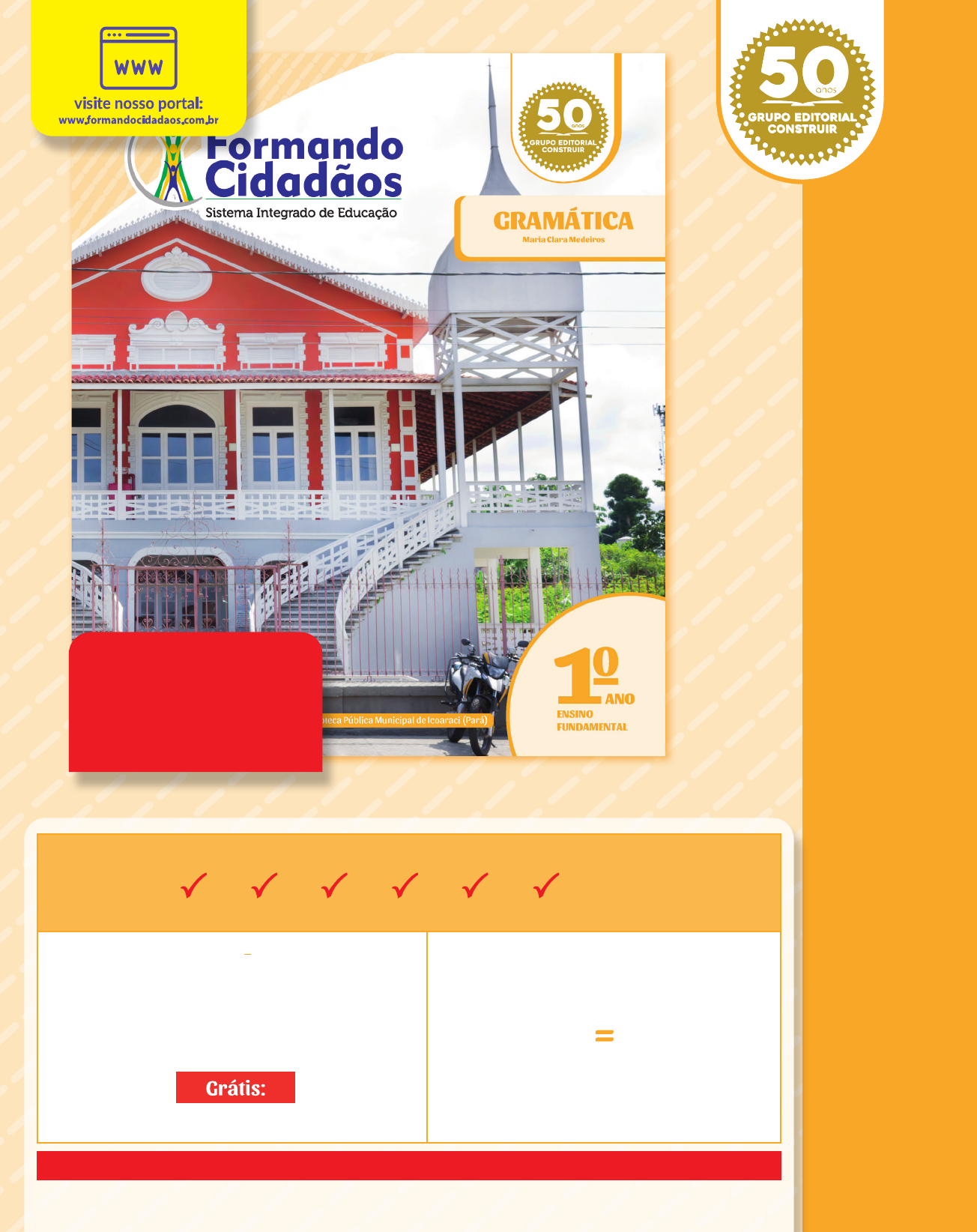EDIÇÃO 2024-2025-2026 M AN UA L D O ED UC AD O R FO RM AÇ ÃO C ON TI NU AD A PREÇO GARANTIDO POR 8 ANOS: 2018 • 2019 • 2020 • 2021 • 2022 • 2023 • 2024 • 2025 DE 1º DE SETEMBRO DE 2017 ATÉ 31 DE AGOSTO DE 2025. KIT A – 1o ANO 11 Livros: Língua Portuguesa + Matemática + História + Geografia + Ciências + Cidadania Moral e Ética + Gramática + As aventuras de um pirata + As asas maravilhosas da Dona Galinha + A casa da Dona Alegria + Assembleia dos bichos excluídos LIVRO DIÁRIO DO ALUNO. 11 livros = 592 páginas R$ 0,21 por página. R$ 124,30 PATENTEADO COM EXCLUSIVA METODOLOGIA DE ENSINO. INPI – BR 10 2020 000730 0 FORM ANDO CIDADÃOS • M ANUAL DO EDUCADOR • GRAM ÁTICA •1 o ANO FC_ME_Gramatica_1A_a_3A_7mm_CCc.indd 1FC_ME_Gramatica_1A_a_3A_7mm_CCc.indd 1 03/05/2023 15:13:5803/05/2023 15:13:58 Maria Clara Medeiros Gramática Manual do Educador ANO ENSINO FUNDAMENTAL 01 Formação Continuada FC_ME 1F GRA_UN 1.indd 1FC_ME 1F GRA_UN 1.indd 1 27/07/2023 15:41:1627/07/2023 15:41:16 Reprodução proibida. Art. 184 do Código Penal e Lei no 9.610, de 19 de fevereiro de 1998. Fizeram-se todos os esforços para localizar os detentores dos direitos das fotos, das ilustrações e dos textos contidos neste livro. A Formando Cidadãos Editora pede desculpas se houve alguma omissão e, em edições futuras, terá prazer em incluir quaisquer créditos faltantes. Maria Clara Medeiros EDITORAS Isabela Nóbrega Márcia Regina Silva REVISÃO DE TEXTO Consultexto PROJETO GRÁFICO, ILUSTRAÇÕES E EDITORAÇÃO ELETRÔNICA Mirai Design e Comunicação Ltda. IMAGENS VETORIAIS freepik.com shutterstock.com stock.adobe.com COORDENAÇÃO EDITORIAL DIREITOS RESERVADOS À MULTI MARCAS EDITORIAIS LTDA. Rua Neto Campelo Júnior, 37 Mustardinha - Recife/PE CEP: 50760-330 Fone: (81) 3447.1178 CNPJ: 00.726.498/0001-74 IE: 0214538-37 ISBN: 978-85-403-1986-8 3a edição Manual do Educador Formação Continuada Gramática 1o ano - Ensino Fundamental FC_ME 1F GRA_UN 1.indd 2FC_ME 1F GRA_UN 1.indd 2 27/07/2023 15:41:1727/07/2023 15:41:17 Prezado educador, Este é o seu novo Manual de Gramática. Com ele, você terá o suporte necessário para dinamizar as suas aulas e torná-las mais prazerosas. Para isso, ele apresenta orientações didáticas, sugestões de atividades e ativida- des lúdicas. O manual contém também habilidades que devem ser desenvolvidas em cada página de conteúdo do livro do aluno, de acordo com a Base Nacional Comum Curricular. Esperamos auxiliar a sua prática docente facilitando a aplicação de conteúdos tão importantes para o desenvolvimento do processo de ensino e aprendizagem da língua. Grande abraço, Maria Clara Medeiros Apresentação FC_ME 1F GRA_UN 1.indd 3FC_ME 1F GRA_UN 1.indd 3 27/07/2023 15:41:1727/07/2023 15:41:17 5 8 9 11 12 14 16 35 36 38 40 61 62 64 66 79 80 82 84 103 Conhecendo o manual Sumário do livro do aluno Planejamento de aulas Unidade 1 Conteúdos da unidade e a BNCC Grade semanal Páginas do livro do aluno Unidade 2 Conteúdos da unidade e a BNCC Grade semanal Páginas do livro do aluno Unidade 3 Conteúdos da unidade e a BNCC Grade semanal Páginas do livro do aluno Unidade 4 Conteúdos da unidade e a BNCC Grade semanal Páginas do livro do aluno Atividades lúdicas Sumário FC_ME 1F GRA_UN 1.indd 4FC_ME 1F GRA_UN 1.indd 4 27/07/2023 15:41:1727/07/2023 15:41:17 Conhecendo o manual Estrutura do livro do aluno Sumário do livro do aluno Este manual foi elaborado para ser um material pedagógico que auxilie o trabalho de professores em sala de aula. Para isso, está organizado em: estrutura do livro do aluno, sumário do livro do aluno, planejamento de aulas, conteú- do da unidade e a BNCC e grade semanal. Informações sobre a estrutura do livro do alu- no, apontando tudo o que é necessário para o professor e a criança explorarem-no da melhor maneira. As páginas do livro do aluno apare- cem, ao longo do manual, com as respostas. É apresentada a página do sumário do livro do aluno para que o professor possa ter acesso ao conteúdo anual que será proposto para as crianças. 5 FC_ME 1F GRA_UN 1.indd 5FC_ME 1F GRA_UN 1.indd 5 27/07/2023 15:41:1827/07/2023 15:41:18 Planejamento de aulas Grades semanais Corresponde a uma imagem relacionada à prática docente e a um texto para refletir. Apresentam sugestões para o professor traba- lhar durante as semanas. Conteúdos da unidade e a BNCC Antes da abertura de cada unidade, são apre- sentados os conteúdos didáticos, os objetos de conhecimento, as práticas de linguagem e as habilidades que os alunos deverão demons- trar ao final do trabalho em cada unidade. Assim, o educador poderá nortear suas ações pedagógicas. 6 FC_ME 1F GRA_UN 1.indd 6FC_ME 1F GRA_UN 1.indd 6 27/07/2023 15:41:1927/07/2023 15:41:19 O manual apresenta três seções importantes: orientações didáticas, sugestão de atividade e atividades lúdicas. Orientações didáticas Atividades lúdicas São propostas de atividades simples e práticas, mas que são reconhecidas como facilitadoras da aprendizagem, que poderão ser realizadas em sala de aula com as crianças. Procuramos, inclu- sive, propor atividades que utilizam material de fácil acesso ou, simplesmente, pouco material. Sugestões de atividades que exploram os con- teúdos da grade curricular de cada disciplina de forma lúdica e dinâmica. Sugestão de atividade São atividades referentes ao assunto que está sendo trabalhado na página do livro do aluno e servem para reforçar os con- teúdos estudados. 7 FC_ME 1F GRA_UN 1.indd 7FC_ME 1F GRA_UN 1.indd 7 31/07/2023 10:28:5231/07/2023 10:28:52 Sumário do livro do aluno 8 FC_ME 1F GRA_UN 1.indd 8FC_ME 1F GRA_UN 1.indd 8 27/07/2023 15:41:2227/07/2023 15:41:22 Planejamento de aulas zinkevych / stock.adobe.com 9 FC_ME 1F GRA_UN 1.indd 9FC_ME 1F GRA_UN 1.indd 9 27/07/2023 15:41:2327/07/2023 15:41:23 O educador precisa implantar um clima fraterno, promovendo a solidariedade, incentivando a colabora- ção, 