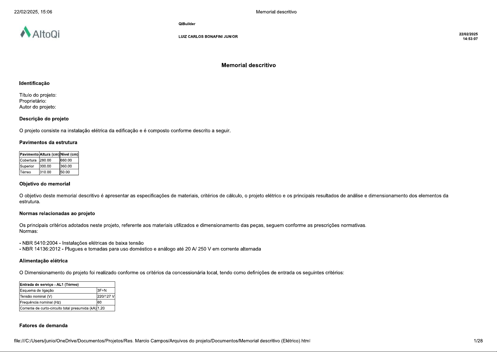 22/02/2025, 15:06 Memorial descritivo QiBuilder AltoQi 22/02/2025 14:53:07 Memorial descritivo Identificação Título do projeto: Proprietário: Autor do projeto: Descrição do projeto projeto consiste na instalação elétrica da edificação e é composto conforme descrito a seguir Pavimentos da estrutura Pavimento Altura (cm) Nível (cm) Cobertura 280.00 660.00 Superior 300.00 360.00 Térreo 310.00 50.00 Objetivo do memorial objetivo deste memorial descritivo é apresentar as especificações de materiais, critérios de cálculo, o projeto elétrico e os principais resultados de análise e dimensionamento dos elementos da Normas relacionadas ao projeto Os principais critérios adotados neste projeto, referente aos materiais utilizados e dimensionamento das peças, seguem conforme as prescrições normativas. Normas: NBR 5410:2004 Instalações elétricas de baixa tensão NBR 14136:2012 - Plugues e tomadas para uso doméstico e análogo até 20 A/ 250 V em corrente alternada Alimentação elétrica Dimensionamento do projeto foi realizado conforme os critérios da concessionária local, tendo como definições de entrada os seguintes critérios: Entrada de serviço - AL1 (Térreo) Esquema de ligação 3F+N Tensão nominal (V) 220/127 Frequência nominal (Hz) 60 Corrente de curto-circuito total presumida (kA) 1.20 Fatores de demanda Campos/Arquivos do projeto/Documentos/Memorial descritivo (Elétrico).html 1/2822/02/2025, 15:06 Memorial descritivo A demanda foi aplicada para determinar a potência demandada pelo quadro. Foram considerados os seguintes critérios para cálculo: AL1 (Térreo) Tipo: Unidade consumidora individual Tipo de carga Potência instalada (kVA) Fator de demanda (%) Demanda (kVA) Iluminação e TUG's (Casas e apartamentos) 14.35 24.00 Uso Específico 32.20 16.10 TOTAL Quadro de medição e proteção geral A proteção geral para o alimentador deve ser realizada por um disjuntor localizado no quadro geral de medição que será instalado na parede do muro localizado no limite do passeio no acesso da propriedade e um disjuntor de manutenção no quadro de distribuição localizado no primeiro pavimento da Quadro Proteção (A) Seção Medidor poste auxiliar (Térreo) 63.00 16 Quadros de distribuição e disjuntores o quadro de distribuição QD, ou caixa de distribuição - CD, constituído de material termoplástico antichama ou metálico. instalação embutida ou de sobrepor, grau de proteção de acordo com a necessidade da instalação, na qual recebe alimentação de uma fonte de geradora e distribui a energia para um ou mais circuitos. A estrutura interna é destinada à instalação de dispositivos de proteções unipolares, bipolares e tripolares padrão DIN ou UL, conforme Norma NBR IEC 60.439-3 e NBR IEC 60.670-1. modelo do quadro de distribuição a ser utilizado no projeto deve ser conforme definido na lista de materiais e legenda de simbologias. Todos os quadros de disjuntores deverão ser aterrados e providos de barramento específico para as fases, neutro e terra. Os disjuntores utilizados serão monopolares, bipolares ou tripolares, conforme diagramas unifilares e lista de materiais. Deverão atender as exigências da norma NBR 60898 (IEC60 9472), não sendo aceito disjuntores que não atendam a esta norma. Os disjuntores terão tensão de funcionamento compatível com a tensão do circuito e protegerá a fiação. A capacidade de interrupção de corrente de curto circuito dos disjuntores deve ser conforme definido na lista de materiais estando atrelada ao disjuntor escolhido. Serão utilizados interruptores diferenciais residuais (IDR) para promover a proteção em caso de choques elétricos acidentais. Serão utilizados IDR's bipolares e tetrapolares com tensão de 220V e 380V respectivamente e corrente de disparo de no mínimo de 30mA. o Dispositivo de proteção contra surtos (DPS), ou supressor de surto, é um dispositivo que protege as instalações elétricas e equipamentos contra picos de tensão, geralmente ocasionados por descargas atmosféricas na rede de distribuição de energia elétrica. o dispositivo é instalado no quadro de distribuição entre fase e terra, possuir classe I, ou III, conforme IEC. Dimensionamento dos quadros de distribuição Quadro Proteção (A) QDLF- Superior (Superior) 50.00 QDLF-Térreo (Térreo) 40.00 Queda de tensão A instalação atendida por ramal de baixa tensão terá queda de tensão máxima desde o ponto de entrega até o circuito terminal, conforme a tabela abaixo: Queda de tensão admissível (CA) Total (%) 5 Alimentação (%) 4 Iluminação (%) 4 Força (%) 4 Controle (%) 1 Queda de tensão admissível (CC) Marcio Campos/Arquivos do projeto/Documentos/Memorial descritivo 2/2822/02/2025, 15:06 Memorial descritivo Total (%) 4 Alimentação (%) 2 Iluminação (%) 2 Força (%) 2 Controle (%) 1 Temperatura ambiente A temperatura média do ambiente e do solo são elementos utilizados para o cálculo do Fator de correção por temperatura. FCT é utilizado no cálculo da corrente de projeto corrigida para o dimensionamento da seção da fiação do circuito. Temperatura ambiente Ambiente 30 Solo 20 Pontos elétricos Composição e tabelas de cargas Para o projeto em questão foram consideradas as seguintes potências unitárias e respectivos fatores de potência: Pontos de força Peça Pontos de comando e força - Interruptor simples e Tomada hexagonal Potência unitária (W) 100 Número de pontos atendidos 2 Potência total (W) 200 Fator de potência 0.9 Peça Pontos de força - Uso específico Chuveiro 5500 W Potência unitária (W) 5500 Número de pontos atendidos 3 Potência total (W) 16500 Fator de potência Peça Pontos de força Uso geral 2P+T 20A (2) baixa Potência unitária (W) 200 Número de pontos atendidos 10 Potência total (W) 2000 Fator de potência 0,9 Peça Pontos de força Uso geral 2P+T 20A (2) baixa -150W Potência unitária (W) 300 Número de pontos atendidos 15 Potência total (W) 