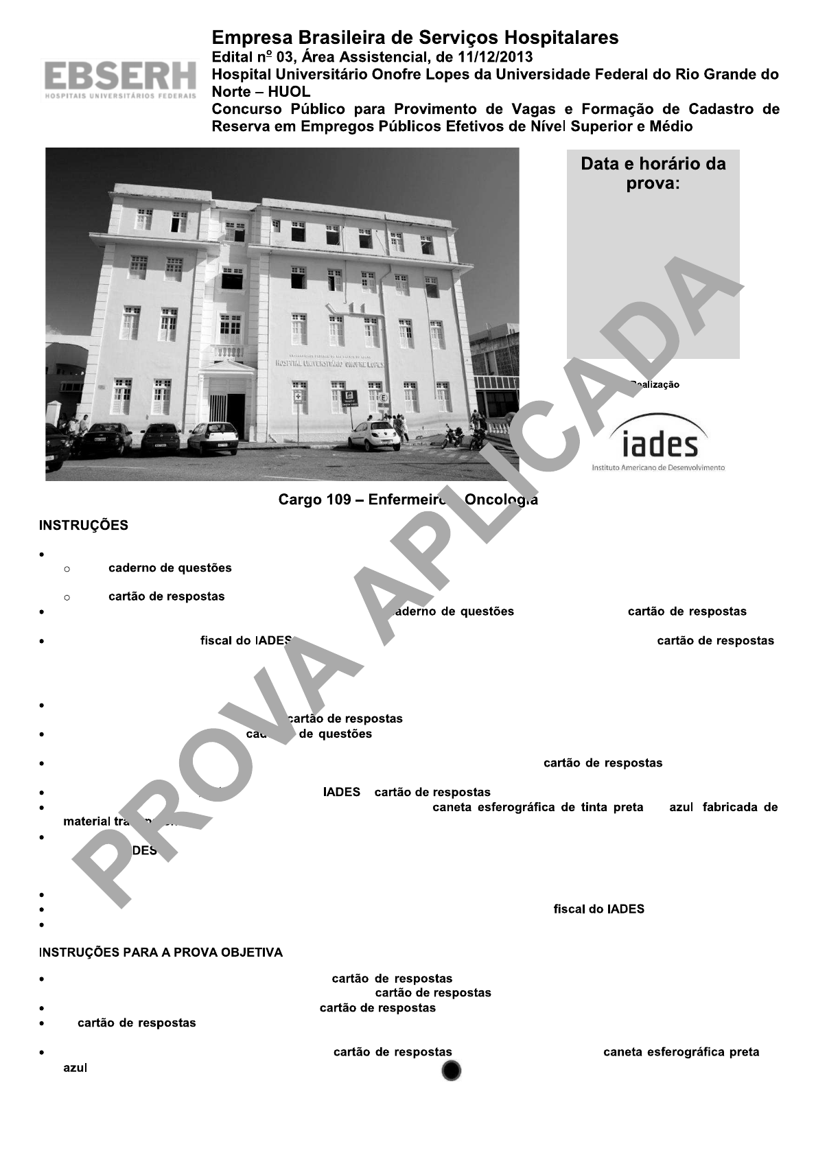 Você receberá do fiscal: um da prova objetiva contendo 50 (cinquenta) questões de múltipla escolha, com 5 (cinco) alternativas de resposta cada uma, e apenas uma alternativa correta; um ótico personalizado. Verifique se a numeração das questões, a paginação do e a codificação do ótico estão corretas. Quando autorizado pelo , no momento da identificação, escreva no espaço apropriado do , com a sua caligrafia usual, a seguinte frase: Esquecer é uma necessidade. Você dispõe de 4 (quatro) horas para fazer a prova objetiva, devendo controlar o tempo, pois não haverá prorrogação desse prazo. Esse tempo inclui a marcação do ótico. Somente será permitido levar o da prova objetiva após 3 (três) horas e 30 (trinta) minutos do início da prova. Somente após decorrida 1 (uma) hora do início da prova, você poderá entregar seu ótico e retirar-se da sala. Após o término da prova, entregue ao fiscal do o devidamente assinado. Deixe sobre a carteira apenas o documento de identidade e a ou , . Não é permitida a utilização de qualquer aparelho eletrônico de comunicação. Desligue e guarde em embalagem fornecida pelo fiscal do : máquina fotográfica; telefone celular; relógio; gravador; bip; receptor; pager; notebook; tablet eletrônico; walkman; aparelho portátil de armazenamento e de reprodução de músicas, vídeos e outros arquivos digitais; agenda eletrônica; palmtop; régua de cálculo; máquina de calcular e (ou) qualquer outro equipamento similar. Não é permitida a consulta a livros, dicionários, apontamentos e apostilas. Você somente poderá sair e retornar à sala de aplicação de provas na companhia de um . Não será permitida a utilização de lápis em nenhuma etapa da prova. Verifique se os seus dados estão corretos no . Caso haja algum dado incorreto, escreva apenas no(s) campo(s) a ser(em) corrigido(s), conforme instruções no . Leia atentamente cada questão e assinale, no ótico, uma única alternativa. O ótico não pode ser dobrado, amassado, rasurado ou manchado nem pode conter nenhum registro fora dos locais destinados às respostas. A maneira correta de assinalar a alternativa no é cobrir, fortemente, com ou , o espaço a ela correspondente. Marque as respostas assim: Domingo 16/02/2014 8 horas (Horário de Brasília) www.pciconcursos.com.br CONCURSO PÚBLICO ÁREA ASSISTENCIAL EBSERH 109 Enfermeiro Oncologia PÁGINA /10 CONHECIMENTO S BÁSICOS Questões de 1 a 20 LÍNGUA PORTUGUESA Questões de 1 a 10 Texto 1 para responder as questões de 1 a 4. 1 4 7 10 13 16 17 Medicina É a ciência que investiga a natureza e as causas das doenças humanas, procurando sua cura e prevenção. A saúde humana é o objeto de estudo do médico. Ele pesquisa e trata disfunções e moléstias, escolhendo os melhores procedimentos para preveni-las e combatê-las. Para isso, tem de estar sempre bem informado a respeito de novas drogas e equipamentos que proporcionem aos pacientes os diagnósticos e os tratamentos mais avançados e eficientes. Com um conhecimento aprofundado dos órgãos, sistemas e aparelhos do corpo humano, faz diagnósticos, pede exames, prescreve medicamentos e realiza cirurgias. Participa também de programas de prevenção e de planejamento da saúde coletiva. Há trabalho para o médico em hospitais, clínicas, postos de saúde e empresas. Grande parte atua também em consultório próprio. Pode trabalhar ainda como consultor em sites especializados, voltados para o exercício da medicina. Disponível em: . Acesso em: 10/1/2014, com adaptações. QUESTÃO 1 _______________________ Considerando as informações do texto e a relação entre as partes que o constituem, assinale a alternativa correta. O exercício da medicina está voltado, especialmente, para a cura das doenças humanas. O médico, cujo objeto de estudo é a saúde humana, tem como objetivo profissional prevenir e combater as disfunções e moléstias que acometem o ser humano. O trabalho de prevenção e cura de doenças só é possível quando o médico dispõe de equipamentos avançados. Para fazer diagnósticos, pedir exames, prescrever medicamentos e realizar cirurgias, o médico precisa tão somente conhecer os órgãos do corpo humano. Um dos deveres de quem exerce a medicina é trabalhar como consultor. QUESTÃO 2 _______________________ Com base na norma-padrão da língua portuguesa e nos recursos de coesão utili zados no primeiro parágrafo, assinale a alternativa correta. que investiga a natureza e as causas das substituído por na qual dois termos por meio da ideia de adição. sua preveni-las e combatê-las destacados referem-se, respectivamente, a bém poderia ser empregado Para isto. que proporcionem aos pacientes os - portanto poderia ser substituído por os quais. QUESTÃO 3 ________________________ De acordo com a norma-padrão, assinale a alternativa que reproduz integralmente a relação de sentido entre as ideias do Para isso, tem de estar sempre bem informado a respeito de novas drogas e equipamentos que proporcionem aos pacientes os diagnósticos e os tratamentos mais Af im de realizar tal função, tem de estar sempre bem informado há cerca de novas drogas e equipamentos que proporcionem aos pacientes os diagnósticos e os tratamentos mais avançados e eficientes. Para tanto, tem de estar sempre bem informado sobre novas drogas e equipamentos, que proporcionem aos pacientes os diagnósticos e os tratamentos mais avançados e eficientes. Tem de estar, para isso, sempre bem informado acerca de novas drogas e equipamentos que proporcionem aos pacientes os diagnósticos e os tratamentos mais avançados e eficientes. Em virtude disso, tem de estar sempre bem informado a respeito das novas drogas e equipamentos que proporcionem aos pacientes os diagnósticos e os tratamentos mais avançados e eficientes. Tem de estar, devido a isso, sempre bem informado com respeito à novas drogas e equipamentos que proporcionem aos pacientes os diagnóstic
