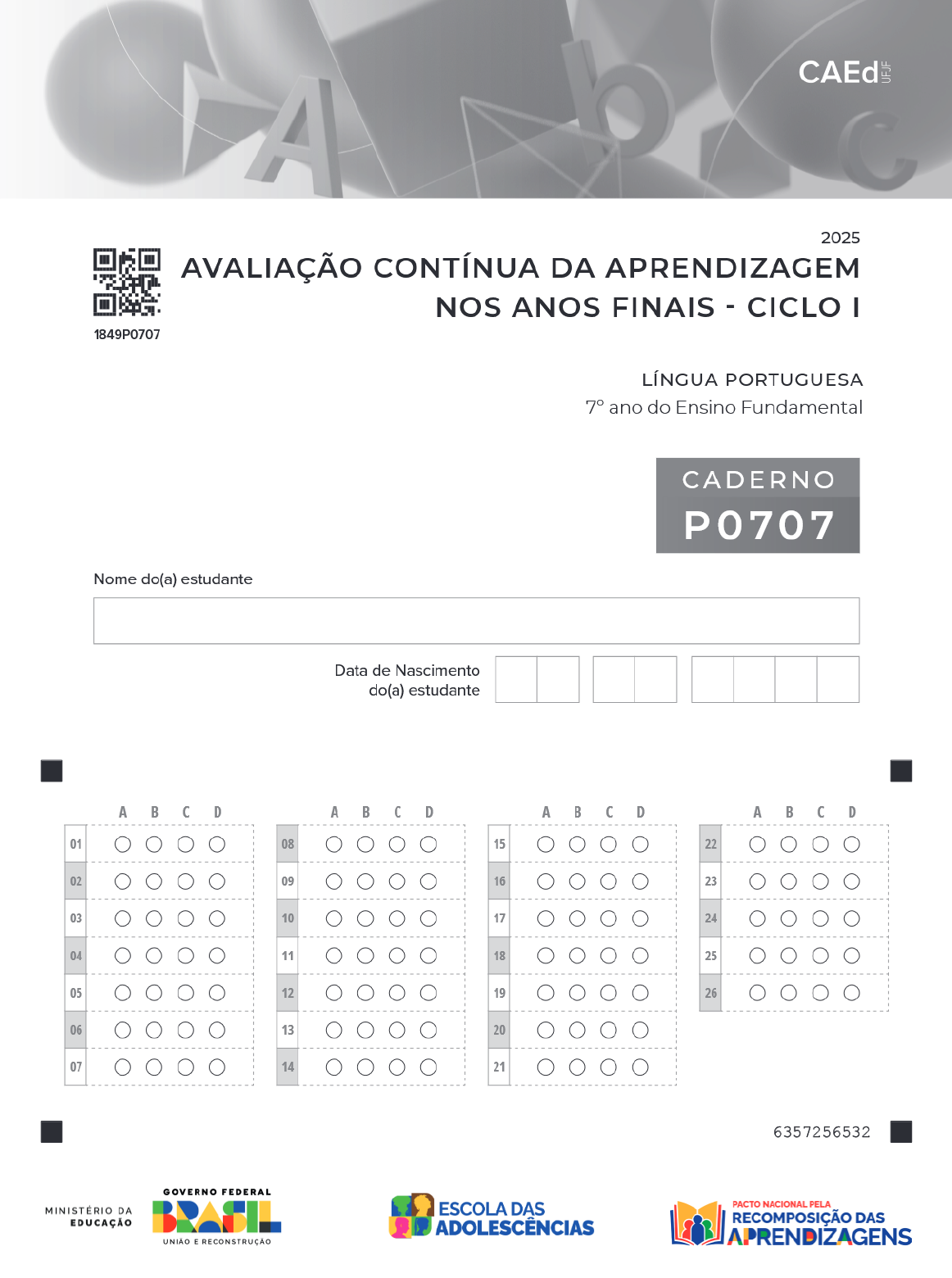 BL03P07 Leia o texto abaixo. Pais e filhos: amizade, superproteção e autoritarismo De acordo com a psicóloga Fernanda Kimie Mishima, é necessário autoconhecimento e autoconfiança dos pais no entendimento de seus próprios limites para construir uma relação saudável com os filhos Dificuldades no relacionamento entre pais e filhos são comuns. Afinal, são pessoas diferentes, com ideias e pensamentos distintos. No entanto, é preciso que o amor e o respeito prevaleçam. A afirmação é da psicóloga Fernanda Kimie Tavares Mishima, da USP, que adianta ser necessário também autoconhecimento e autoconfiança dos pais no entendimento de seus próprios limites para construir uma relação saudável com os filhos. [...] Pais superprotetores [...] Fernanda afirma que o comportamento prejudica o amadurecimento da relação entre pais e filhos, além de impedir os pais de confiarem na capacidade dos filhos. Para Fernanda, dizer “eu superprotejo meu filho porque ele não pode ter frustração, ele não pode saber que há limites” confunde a mente da criança, “que passa a acreditar que pode tudo e suas vontades devem ser sempre respeitadas porque são as corretas”. Para a estudante de pedagogia L.A.F., de 22 anos, que [...] prefere não se identificar, ter mãe superprotetora trouxe consequências negativas para sua vida adulta, a insegurança. A jovem conta que saiu de casa no ano passado e, no início, sofreu por depender emocionalmente da mãe. Relata ter tido dificuldade em ficar longe e realizar sozinha as tarefas do dia a dia. Ter que tomar decisões e encarar o mundo sozinha deixava a estudante ansiosa, já que ela “nunca tinha feito isso antes, nunca tive essa oportunidade de poder amadurecer e crescer”. Hoje, após vencer as dificuldades, a estudante afirma ter mais autonomia. Pais amigos Relacionamento amigável com os pais foi relatado pela estudante de jornalismo Luana de Camargo Pena, de 22 anos, como benéfico. “É uma sensação de segurança. Eu sei que eu posso contar com eles e eles também podem contar comigo.” Seja para pedir conselhos ou para compartilhar situações boas e ruins Luana se sente confortável com os pais [...]. PIERRI, Vitória. Pais e filhos: amizade, superproteção e autoritarismo. Jornal da USP. 5 mar. 2021. Disponível em: https://jornal.usp.br/atualidades/pais-e-filhos-amizade-superprotecao-e-autoritarismo/. Acesso em: 11 jan. 2024. Fragmento. (P00045072_SUP) 01) (P00045072) Nesse texto, o trecho que mostra uma opinião é: A) “Dificuldades no relacionamento entre pais e filhos são comuns. Afinal, são pessoas diferentes, com ideias e pensamentos distintos.”. B) “Para Fernanda, dizer ‘eu superprotejo meu filho porque ele não pode ter frustração, ele não pode saber que há limites’ confunde a mente da criança,...”. C) “A jovem conta que saiu de casa no ano passado...”. D) “Relacionamento amigável com os pais foi relatado pela estudante de jornalismo...”. 02) (P00045076) Nesse texto, no trecho “... já que ela ‘nunca tinha feito isso antes,...’”, o pronome destacado faz referência A) à estudante de pedagogia. B) à Fernanda Kimie Tavares Mishima. C) à Luana de Camargo Pena. D) à mãe superprotetora. P0707 1 BL03P07 P0707 2 Leia novamente o texto “Pais e filhos: amizade, superproteção e autoritarismo” para responder às questões abaixo. 03) (P00045074) Esse texto é um exemplo de A) artigo de opinião. B) carta de leitor. C) notícia. D) reportagem. 04) (P00045075) Nesse texto, no trecho “‘... suas vontades devem ser sempre respeitadas porque são as corretas.’”, a palavra destacada expressa ideia de A) adição. B) conclusão. C) explicação. D) oposição. 05) (P00045073) Qual é o assunto desse texto? A) A busca dos jovens por autonomia longe da casa dos pais. B) A construção de uma relação saudável entre pais e filhos. C) A dificuldade dos filhos em compreender os pais. D) A importância do autoconhecimento dos pais. BL01P07 Leia o texto abaixo. Sou mãe e professora, e sei bem o quanto dizer não é importante, mas ao mesmo tempo sofrido.A reportagem abordou vários elementos e soube respeitar tanto os pais quanto as crianças e os adolescentes. Aos pais, cabe a educação moral dos filhos e isso está sendo deixado para a escola, o que certamente traz consequências negativas para todos. Essa reflexão é importante para a sociedade, pois, a partir dela, pode-se pensar em um futuro melhor, com pessoas mais altruístas e conscientes. S. M. P. G., CAMPINAS, SP Armazém de texto. 15 out. 2021. Disponível em: https://armazemdetexto.blogspot.com/2021/10/carta-do-leitor-cartas-comportamento.html. Acesso em: 10 jan. 2024. (P00045054_SUP) 06) (P00045054) Qual trecho desse texto apresenta uma opinião? A) “Sou mãe e professora, e sei bem quanto dizer não é importante,...”. B) “A reportagem abordou vários elementos...”. C) “... soube respeitar tanto os pais quanto as crianças e os adolescentes.”. D) “... isso está sendo deixado para a escola,...”. 07) (P00045058) Esse texto é um exemplo de A) artigo de opinião. B) carta de leitor. C) diário. D) notícia. 08) (P00045059) Nesse texto, no trecho “A reportagem abordou vários elementos...”, a palavra destacada pode ser substituída por A) apresentou. B) costurou. C) defendeu. D) separou. 09) (P00045057) De acordo com o trecho “Sou mãe e professora, e sei bem o quanto dizer não é importante, mas ao mesmo tempo sofrido.”, a autora do texto A) evita dizer não aos seus filhos. B) incentiva os filhos a dizerem não. C) tem conhecimento para falar sobre educação de crianças. D) tem uma relação ruim com a educação de suas crianças. 10) (P00045056) De acordo com esse texto, os pais devem A) cuidar da educação moral dos filhos. B) deixar crianças e adolescentes na escola. C) pensar em um futuro melhor para os filhos. D) respeitar as crianças e os adolescentes. P0707 3 BL02P07 Leia o texto aba