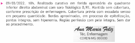 Anotação de Enfermagem (Voltado ao cuidado à pacientes com feridas) • A anotação de enfermagem é o registro de informações realizado pela equipe de enfermagem (enfermeiro, técnico e auxiliar de enfermagem); • As anotações são organizadas de forma a reproduzir os fatos na ordem em que eles ocorreram, incluindo todos os cuidados realizados e fatos observados; • Assegurar a comunicação entre os membros da equipe de saúde; • Garantir a continuidade dos planos de cuidados e das informações nas 24 horas, a qualidade da assistência, a segurança do paciente e da equipe de cuidado; • Respaldo profissional. Tipos de curativos ➢ Oclusivo: Bandagem que cobre uma ferida, impedindo a entrada de ar e fluidos. Ele é utilizado para promover a cicatrização e evitar a infecção. ➢ Compressivo: Reduz o fluxo sanguíneo local, promovendo a coagulação do sangue e evitando hemorragias. O que anotar na evolução de um curativo? → Tipo de curativo; → Tipo de lesão (lesão por pressão, ferida operatória, escoriações ou outros); → Tamanho da lesão: descrever largura, comprimento e profundidade em cm; → Localização da lesão; → Leito da ferida com tecido de: granulação, epitelização, necrose, esfacelo, espaço desvitalizado, presença de túneis; → Quantidade de exsudato: pequena, média e grande; → Aspecto do exsudato: seroso, sanguinolento, serosan- guinolento, piosanguinolento, purulento, pútrido; → Pontos de: necrose acasta- nhada, necrose esverdeada, necrose escura, esfacelo; → Pele perilesão: integra, hiperemiada, macerada, presença de dreno, etc; → Bordos da ferida com contorno: irregular e regular; → Produto e cobertura utilizados para a realização do curativo, conforme prescrição de enfermagem; → Relatar o nível de dor do paciente ao procedimento, a fim de avaliar necessidade de analgesia prévia; → Nome completo e Coren do responsável pelo procedimento. EX: Proteger a vermelha: Tecido de granulação Limpar a amarela: Necrose de liquefação (esfacelo) Desbridar a preta: Necrose de coagulação (escara) Soro fisiológico 0,9% → Ação: Mantém o meio úmido; estimula o processo de autólise do tecido desvitalizado (ação da enzima hidrolase ácida). → Indicação: Ferida cutânea limpa; ferida pouco exsudativa; ferida com pequena formação de tecido necrótico-fibrinoso. → Troca: a cada 4 horas. → Apresentação: solução. HIDROGEL → Composição: água; Carboxi- metilcelulose Sódica; Alginato de Cálcio. → Ação: proporciona ambiente úmido; evita ressecamento; desbrida áreas de necrose (desbridamento autolítico). → Indicação: Feridas abertas na presença de tecido desvitalizado e crostas; com áreas necróticas. → Troca: diariamente (cobertura convencional); Feridas infectadas: no máximo 24 horas; Necrose: no máximo 72 horas. → Apresentação: Tubo com 8g, 15g, 25g. Creme barreira → Composição: Creme hidrofóbico composto de água, parafinalíquida, petrolato, ceramicrocristalina, oleato- deglicerol, álcool de lanolina, ácidocítrico, citrato de magnésio, ciclometicone, glicerina, metil-parabeno, propilparabenoepropilenoglicol. → Ação: hidrata, protege e recupera o pH natural da pele. → Indicação: Tratamento da pele seca ou irritada por efluentes agressivos de estomias e fístulas, prevenção de dermatites associadas à incontinência (DAI), radiodermites e pele perilesional. → Troca: diariamente. → Apresentação: tubo contendo 60 ml. Hidrocolóide → Composição: Carboximetilcelulose (CMC) e Alginato de Cálcio. → Ação: Impermeável à água, bactérias e vírus. Isola o leito da ferida do meio externo. Evita o ressecamento e a perda de calor. Mantém o meio úmido. → Indicação: Abrasões, lacerações, cortes superficiais, queimaduras, rachaduras de pele, UPP e úlceras diabéticas, feridas cirúrgicas. Prevenção de lesões de pele. Feridas com pouco a moderado exsudato. → Troca: Acada 07 dias ou quando houver presença de fluido na ferida. → Apresentação: Placa, pó e pasta. Carvão ativado com prata → Ação: Ação bactericida. Adsorve exsudato. Neutralizador de odor. → Indicação: Lesões neoplásicas fétidas. Feridas infectadas exsudativas. → Troca: Acada 24 ou 48 horas. Necessita de cobertura secundária. → Apresentação: Sachê Gaze não aderente – Gaze de Rayon → Composição: Ácidos Graxos Essenciais (Óleo de Girassol), Lecitina de Soja, Óleo de Copaíba, Óleo de Melaleuca, Triglicerídeos de Cadeia Média, Vitamina A e Vitamina E. → Ação: Revitalizam a pele e auxiliam processo cicatrização feridas. → Indicação: Feridas com formação de tecido de granulação; Áreas doadoras e receptoras de enxerto; Queimaduras superficiais de 2º grau; Áreas cutâneas pós- trauma. → Troca: a cada 24 horas. → Apresentação: Gaze (7,5cm x 15cm) (7,5cm x 40cm) Filme → Ação: Mantém a umidade e o pH natural da pele. → Indicação: Tratamento de feridas secas com dano parcial do tecido. → Troca: até 07 dias. → Apresentação: Placa, com fenestra ou sem fenestra. Papaína → Apresentação: Gel, pasta e pó. → Atuação: desbridante (enzimático) não traumática, anti-inflamatória, bactericida, estimula a força tensil das cicatrizes, pH ótimo de 3 12, atua apenas em tecidos lesados, devido a anti-protease plasmática (alfa anti-tripsina). → Observações: Diluições 10% para necrose, 4 a 6% para exsudato purulento e 2% para uso em tecido de granulação. → Cuidados no armazenamento: (fotossensível) e substâncias oxidantes (ferro/iodo/oxigênio), manter em geladeira. Ácidos Graxos Essenciais 1- Derivados do ácido linoléico: Dersani, Ativoderm, AGE Derm. 2- Derivados do ácido linoléico com lanolina: Sommacare, Saniskin. 3- Derivados do ácido ricinoléico - da mamona: Hig Med → Indicação: lesões abertas não intactas, e profilaxia das úlceras de pressão. → Modo de usar: aplicar no local a