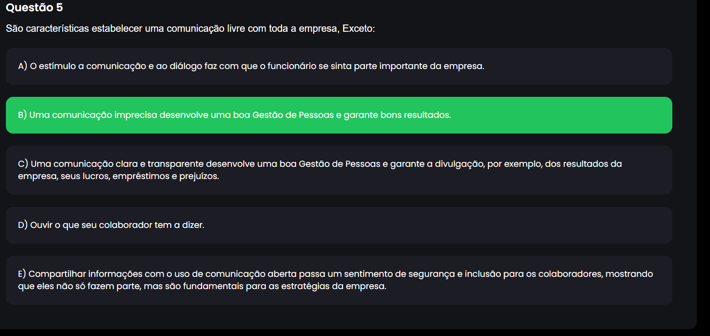 Questão 5 São características estabelecer uma comunicação livre com toda a empresa, Exceto: A) O estímulo a comunicação e ao diálogo faz com que funcionário se sinta parte importante da empresa. B) Uma comunicação imprecisa desenvolve uma boa Gestão de Pessoas e garante bons resultados. c) Uma comunicação clara e transparente desenvolve uma boa Gestão de Pessoas e garante a divulgação, por exemplo, dos resultados da empresa, seus lucros, empréstimos e prejuízos. D) Ouvir que seu colaborador tem a dizer. E) Compartilhar informações com uso de comunicação aberta passa um sentimento de segurança e inclusão para os colaboradores, mostrando que eles não só fazem parte, mas são fundamentais para as estratégias da empresa.