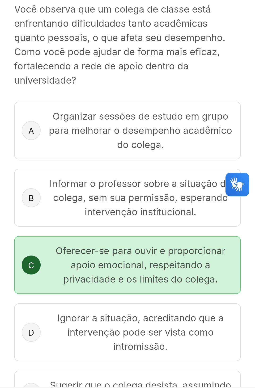 Você observa que um colega de classe está enfrentando dificuldades tanto acadêmicas quanto pessoais, o que afeta seu desempenho. Como você pode ajudar de forma mais eficaz, fortalecendo a rede de apoio dentro da universidade? Organizar sessões de estudo em grupo A para melhorar o desempenho acadêmico do colega. Informar o professor sobre a situação d B colega, sem sua permissão, esperando intervenção institucional. Oferecer-se para ouvir e proporcionar C apoio emocional, respeitando a privacidade e os limites do colega. Ignorar a situação, acreditando que a D intervenção pode ser vista como intromissão.