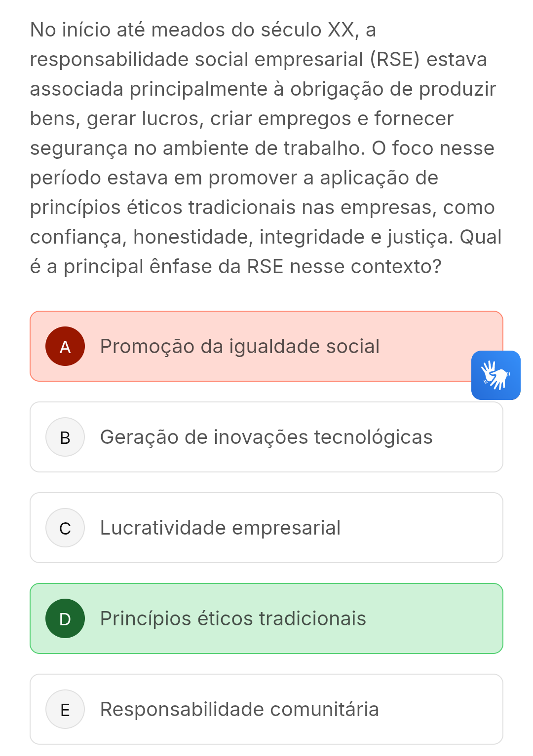 No início até meados do século XX, a responsabilidade social empresarial (RSE) estava associada principalmente à obrigação de produzir bens, gerar lucros, criar empregos e fornecer segurança no ambiente de trabalho. O foco nesse período estava em promover a aplicação de princípios éticos tradicionais nas empresas, como confiança, honestidade, integridade e justiça. Qual é a principal ênfase da RSE nesse contexto? A Promoção da igualdade social B Geração de inovações tecnológicas C Lucratividade empresarial D Princípios éticos tradicionais E Responsabilidade comunitária