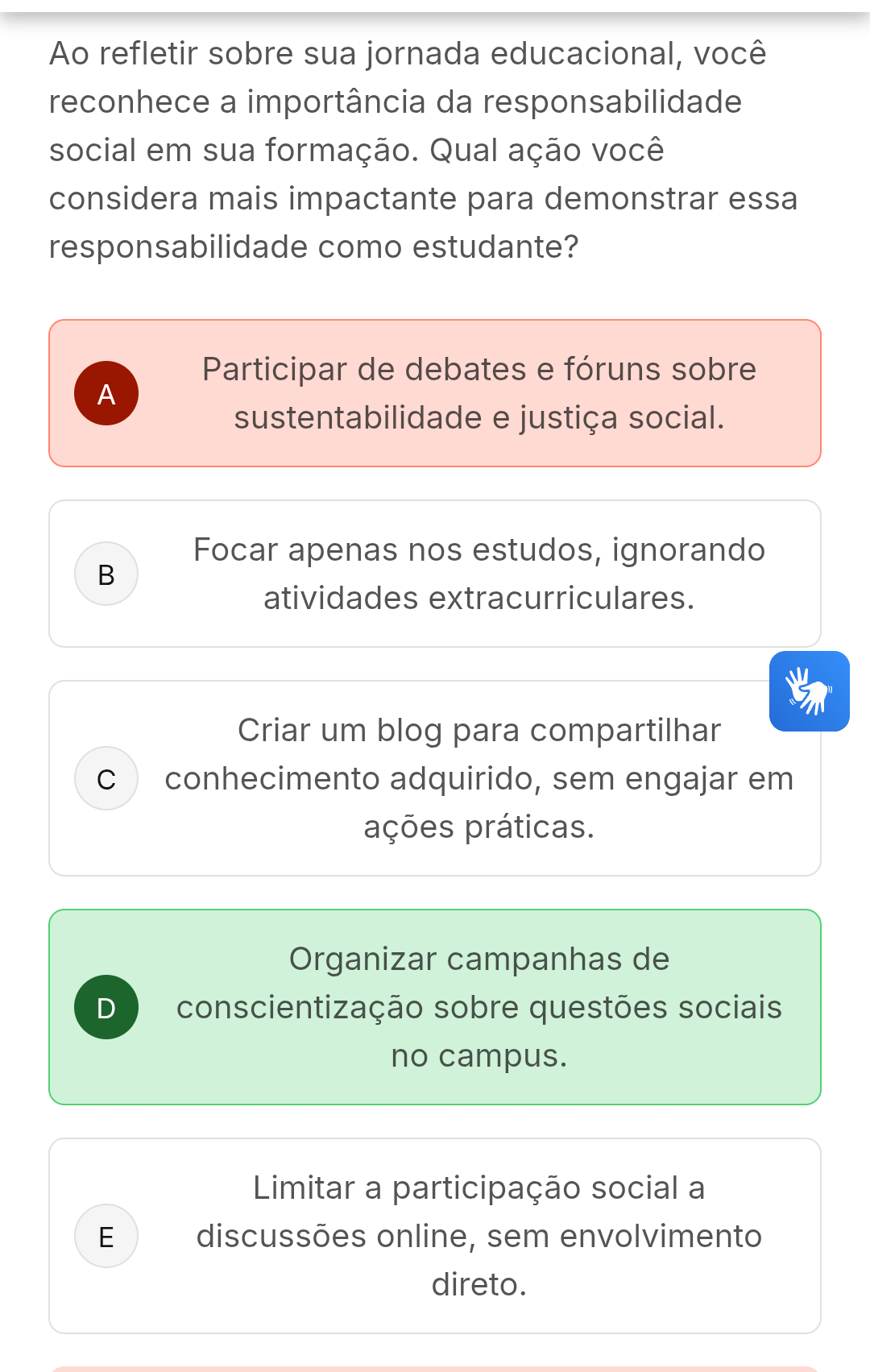 Ao refletir sobre sua jornada educacional, você reconhece a importância da responsabilidade social em sua formação. Qual ação você considera mais impactante para demonstrar essa responsabilidade como estudante? Participar de debates e fóruns sobre A sustentabilidade e justiça social. Focar apenas nos estudos, ignorando B atividades extracurriculares. Criar um blog para compartilhar C conhecimento adquirido, sem engajar em ações práticas. Organizar campanhas de D conscientização sobre questões sociais no campus. Limitar a participação social a E discussões online, sem envolvimento direto.
