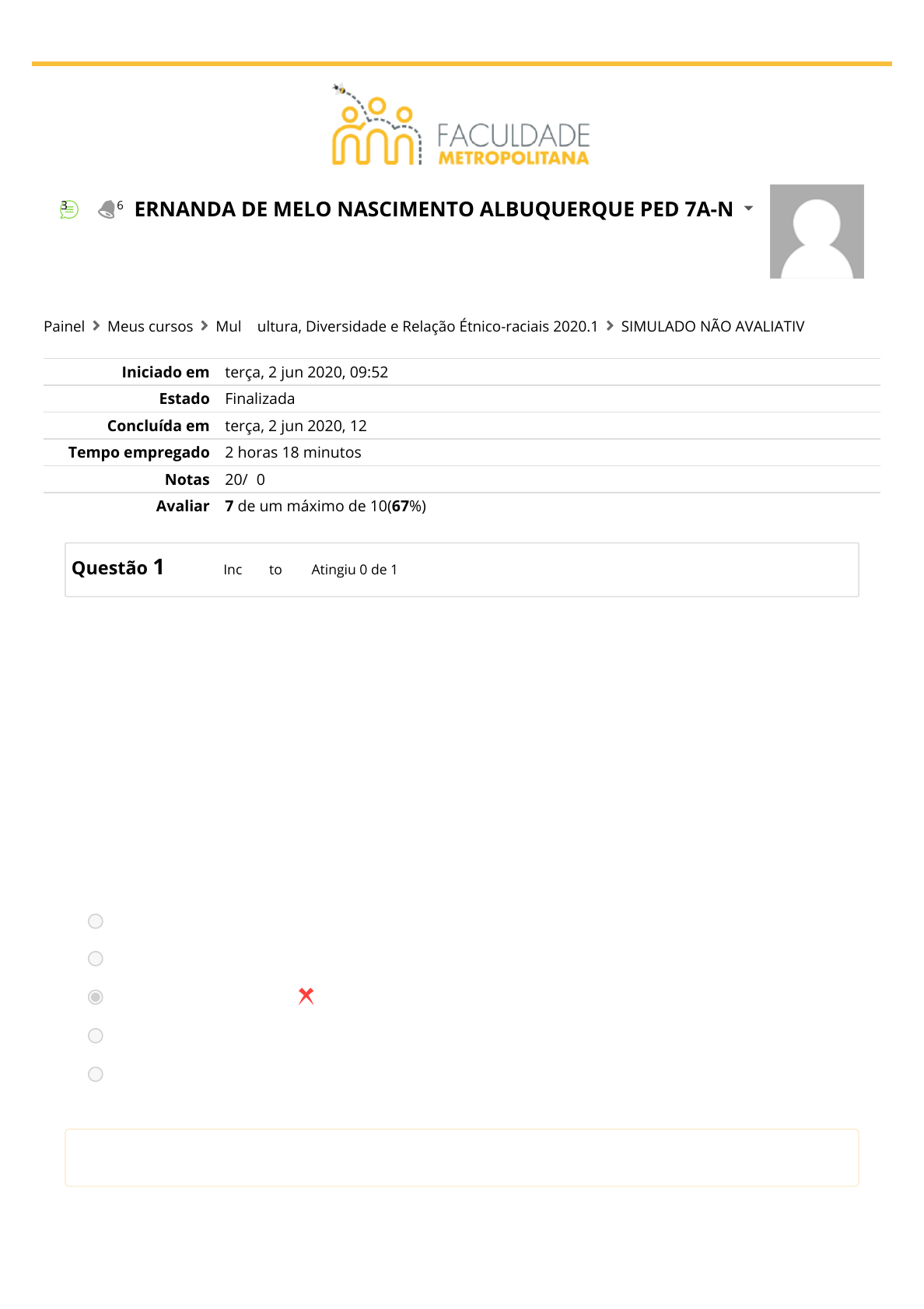 / Iniciado em terça, 2 jun 2020, 09:52 Estado Finalizada Concluída em terça, 2 jun 2020, 12:10 Tempo empregado 2 horas 18 minutos Notas 20/30 Avaliar 7 de um máximo de 10(67%) Questão 1 Incorreto Atingiu 0 de 1 Diana Baumrind é uma pesquisadora que examinou as combinações das várias dimensões de paternidade: afeto ou ausência; nível de expectativa; clareza e consistência das regras, comunicação entre pai e �lho. A partir daí, Diana passou a considerar três combinações especí�cas dessas características: o estilo permissivo, o estilo autoritário e o estilo democrático. Resultados mais consistentes de outros estudiosos, apontam para uma quarta combinação: o estilo negligente. Considerando uma família em que os �lhos crescem sem regras e onde a ausência de comunicação é notória, a qual combinação especí�ca se relaciona a esta situação? Escolha uma: a. Um estilo permissivo. b. Um estilo autoritário. c. Um estilo negligente. d. Um estilo democrático, porém permissivo. e. Um estilo democrático. A resposta correta é: Um estilo permissivo.. 3 6 ERNANDA DE MELO NASCIMENTO ALBUQUERQUE PED 7A-N Painel Meus cursos Multicultura, Diversidade e Relação Étnico-raciais 2020.1 SIMULADO NÃO AVALIATIVO https://www.ead.metropolitana.edu.br/ https://www.ead.metropolitana.edu.br/user/view.php?id=1584&course=1319 https://www.ead.metropolitana.edu.br/my/ https://www.ead.metropolitana.edu.br/course/view.php?id=1319 https://www.ead.metropolitana.edu.br/mod/quiz/view.php?id=47515 / Questão 2 Correto Atingiu 1 de 1 Sobre as identidades de gênero, vale ressaltar que a criança adquire informações observando os adultos, assistindo televisão, ouvindo avaliações, comentários e conselhos sobre diferentes atividades e regras de comportamento. A família, normalmente é a principal transmissora destas informações e conceitos. Analise as alternativas referentes à participação dos pais no estudo das identidades de gênero e assinale a CORRETA. Escolha uma: a. Recomendar aos �lhos que sigam suas aptidões e talentos, negligenciando o próprio sexo é um grave equívoco. b. As diferenças percebidas no temperamento dos �lhos di�cilmente afetam a resposta dos pais. c. A escolha de brinquedos aos quais os �lhos terão acesso não tem a capacidade de ressaltar as diferenças de gênero. d. Pais tendem a aceitar as diferenças entre os papéis de gênero dos �lhos e a identidade estabelecida pelo sexo biológico. e. O comportamento dos pais in�uencia diretamente a formação da identidade de gênero dos adolescentes. A resposta correta é: O comportamento dos pais in�uencia diretamente a formação da identidade de gênero dos adolescentes.. https://www.ead.metropolitana.edu.br/mod/lti/view.php?id=48181 https://www.ead.metropolitana.edu.br/mod/lti/view.php?id=48181 / Questão 3 Correto Atingiu 1 de 1 A Metodologia do Programa SENAI para a Maturidade (2007) a�rma que em muitas pro�ssões, o trabalhador em processo de envelhecimento é tido como menos desejável para atuar em uma vaga de trabalho. Isto se acentua ainda mais em um mundo com um ritmo industrial, globalizado e competitivo. Tal tendência do mercado de trabalho em relação ao envelhecimento se justi�ca, dentre outros fatores, pelo fato de que: Escolha uma: a. A proximidade da aposentadoria desestimula a produção do trabalhador. b. O trabalhador mais velho está demasiadamente acostumado com a rotina de seu trabalho. c. O trabalhador mais velho apresenta mais intercorrências clínicas e acidentes fora do trabalho. d. A e�ciência no trabalho depende apenas do fator da idade. e. O trabalhador apresenta perdas inerentes à chegada da idade, mesmo no envelhecimento não patológico. A resposta correta é: O trabalhador apresenta perdas inerentes à chegada da idade, mesmo no envelhecimento não patológico.. / Questão 4 Correto Atingiu 1 de 1 O autoconhecimento da criança sobre o seu sexo biológico e a identidade de gênero que irá adotar, bem como a distinção entre outras pessoas como sendo de gêneros diferentes, faz parte de um processo que se inicia logo nos primeiros dias de vida e vai sendo desenvolvido juntamente com seu entendimento geral do mundo. Neste contexto, analise as alternativas abaixo e assinale a VERDADEIRA. Escolha uma: a. A criança não compreende a ideia de gênero até o início da adolescência. b. A estabilidade de gênero se refere à in�uência das condições externas. c. As diferenças genitais não interferem no entendimento de gênero. d. Sexo biológico e gênero psicológico não tem nenhuma relação no autoconceito de cada criança. e. A identidade é o primeiro estágio para o entendimento de gênero. A resposta correta é: A identidade é o primeiro estágio para o entendimento de gênero.. / Questão 5 Correto Atingiu 1 de 1 Tânia, uma aluna com politraumatismo, é hoje uma jovem que está terminando a formação pro�ssional de nível superior em Pedagogia. Chegar a este nível só foi possível graças a sua tenacidade, ao apoio constante dos pais, ao estímulo dos colegas e a uma equipe de professores convencida de que as di�culdades dela seriam superadas com sua integração no grupo e com a adaptação do currículo às limitações sensoriais e intelectuais que ela apresentava. Num sistema educacional que apresente valores como os daquele em que Tânia estuda, é CORRETO esperar que: Escolha uma: a. Em um sistema educacional como aquele em que Tânia estuda, o aluno especial é o único bene�ciado. b. Ao considerar a diversidade, a integração dos alunos, em cada uma das séries, se dará de modo inteiramente homogêneo. c. A atenção do professor deverá estar centrada no currículo escolar, desenvolvendo as ações nele previstas. d. No tipo de educação oferecido a Tânia, há maiores chances de superação e equilíbrio frente às descompensações individuais. e. As ações em favor de alunos como Tânia devem ser excl