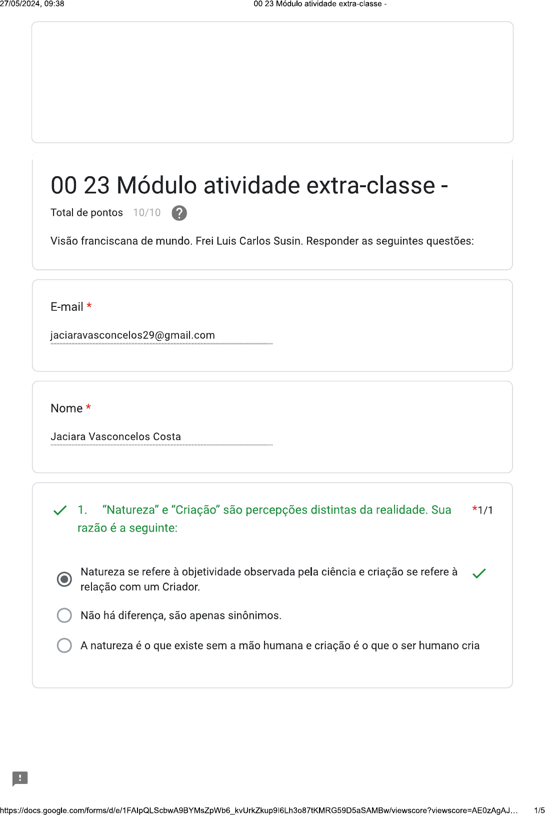27/05/2024, 09:38 00 23 Módulo atividade extra-classe - 00 23 Módulo atividade extra-classe - Total de pontos 10/10 ? Visão franciscana de mundo. Frei Luis Carlos Susin. Responder as seguintes questões: E-mail * jaciaravasconcelos29@gmail.com Nome * Jaciara Vasconcelos Costa 1. "Natureza" e "Criação" são percepções distintas da realidade. Sua *1/1 razão é a seguinte: Natureza se refere à objetividade observada pela ciência e criação se refere à relação com um Criador. Não há diferença, são apenas sinônimos. A natureza é o que existe sem a mão humana e criação é o que o ser humano cria ! 1/527/05/2024, 09:38 00 23 Módulo atividade extra-classe - São Francisco é o patrono dos ecologistas: * 1/1 Porque pode inspirar uma postura adequada de aproximação às criaturas. Porque protegeu os pássaros. Porque compreendeu cientificamente a trama da vida e da ecologia. As condições de Francisco para tratar fraternalmente as criaturas: * 1/1 Foi transmitido por sua mãe Dona Pica. Foi seu natural sentimento poético. Foi sua postura de despojamento e desapego "sine proprium". Francisco fala e prega aos animais: * 1/1 Porque deseja salvar todas as criaturas Porque se relaciona com toda criatura e as traz para a convivência pela linguagem. Os animais não humanos escutam mais do que os animais humanos. A communitas, de caráter antropológico, na experiência de Francisco foi *1/1 estendida também a toda criatura para além do ser humano. Nenhuma das afirmações acima é correta. Francisco, ao recuperar a inocência original, teve como prova a obediência das criaturas Francisco percebeu e viveu uma fraternidade criatural !27/05/2024, 09:38 00 23 Módulo atividade extra-classe No episódio do Irmão Lobo Francisco celebra uma aliança, um *1/1 compromisso entre o lobo e a cidade. A narrativa é uma alegoria das relações humanas entre homens e mulheres. É uma aliança de mútuo respeito, de mútuo compromisso e de cuidado na diversidade das formas de ser criaturas. É uma forma unilateral de solucionar a fome do lobo e acalmar sua violência. "Mãe Terra" é expressão pagã de culto conhecido em muitas populações *1/1 antigas. Há, no entanto, uma diferença no Cântico das Criaturas. Francisco compreende a maternidade no horizonte da fraternidade criatural Francisco conhecia bem as antigas expressões e utilizou dando sua versão. Essa questão não é importante na espiritualidade franciscana. A morte foi integrada por Francisco na fraternidade, como um encontro *1/1 de um irmão com uma irmã. Ele é devedor da mitologia grega sobre tánatos. Ele quis assim dar um significado à própria morte. A morte foi sua na condução para o seu Senhor, que é também Senhor da irmã morte. ! 3/527/05/2024, 09:38 00 23 Módulo atividade extra-classe Na teologia franciscana de Duns Scotus Cristo tem o primeiro lugar na *1/1 Criação, para o qual tudo é criado e exaltado, introduzido nas relações trinitárias. Desenvolve assim uma teologia que não tem seu eixo no pecado e na redenção do pecado, mas na glória e no desígnio divino, no qual também o pecado é redimido. Foi uma maneira de contestar Santo Anselmo e os escolásticos precedentes. É um otimismo típico do temperamento de Francisco e dos franciscanos. Na tradição franciscana, mesmo depois de séculos, se mantém algo da *1/1 visão franciscana da dimensão fraternal com toda criatura em certos traços e sinais. hábito que os frades vestem é da cor da terra. A memória de Francisco produz continuamente o convite a uma conversão ecológica e a um cuidado da criação, é uma memória profética inevitável. Os franciscanos são ecologistas natos. Em um pequeno parágrafo de até quatro linhas, ESCREVA sobre qual o ponto que * lhe chamou mais atenção e por qual razão: Para mim, ficou muito latente o processo que fez Francisco de Assis após sua primeira crise, desencantado do ideal de cavaleiro, como ele vai crescendo no contato com a Natureza. Algo que para ele não tinha graça, transformou-se em sua própria conversão, na sua relação de auteridade. Este formulário foi criado em espfran.com.br. Denunciar abuso Google Formulários ! 4/527/05/2024, 09:38 00 23 Módulo atividade extra-classe - 5/5
