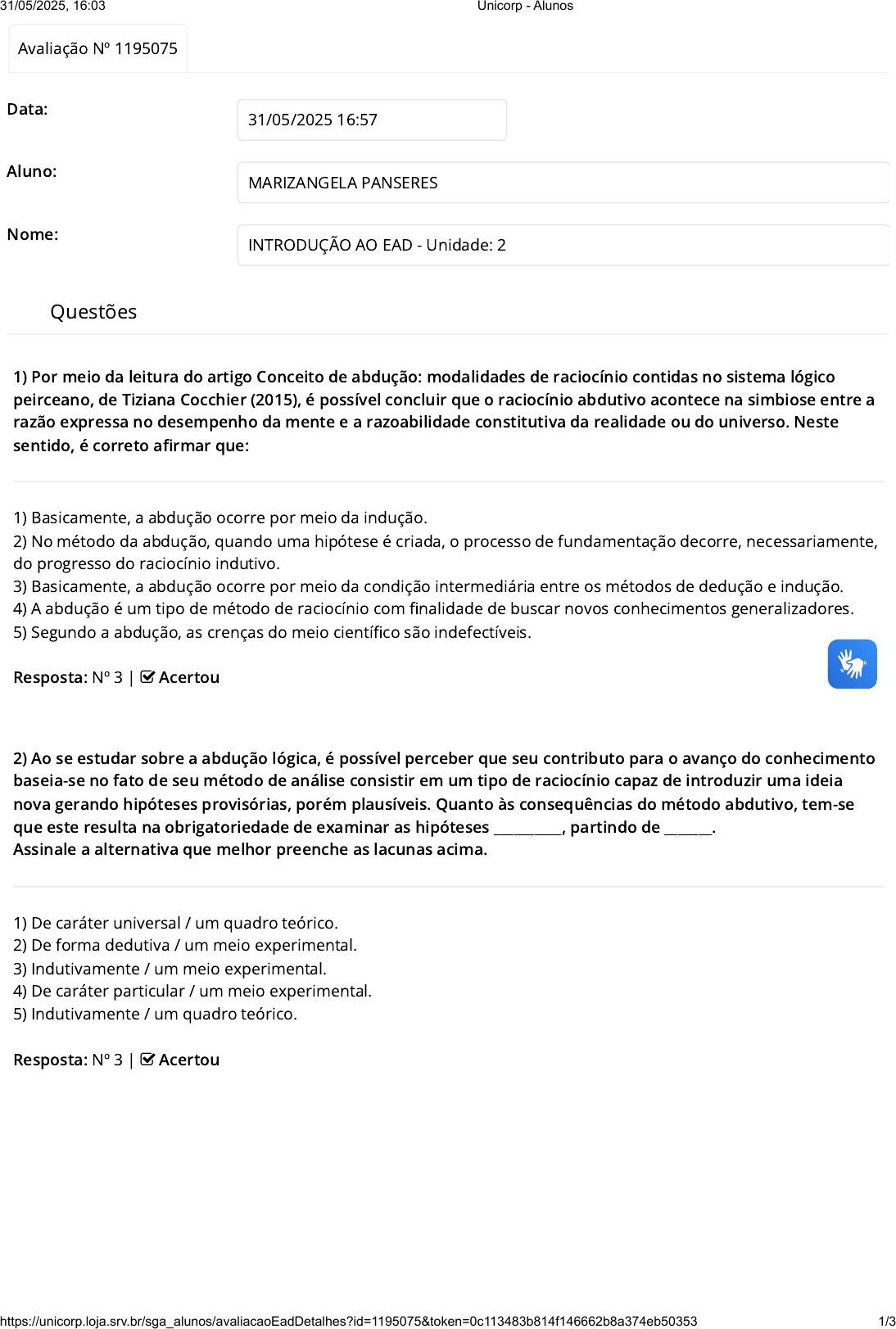 Questões 1) Por meio da leitura do artigo Conceito de abdução: modalidades de raciocínio contidas no sistema lógico peirceano, de Tiziana Cocchier (2015), é possível concluir que o raciocínio abdutivo acontece na simbiose entre a razão expressa no desempenho da mente e a razoabilidade constitutiva da realidade ou do universo. Neste sentido, é correto afirmar que: 1) Basicamente, a abdução ocorre por meio da indução. 2) No método da abdução, quando uma hipótese é criada, o processo de fundamentação decorre, necessariamente, do progresso do raciocínio indutivo. 3) Basicamente, a abdução ocorre por meio da condição intermediária entre os métodos de dedução e indução. 4) A abdução é um tipo de método de raciocínio com finalidade de buscar novos conhecimentos generalizadores. 5) Segundo a abdução, as crenças do meio científico são indefectíveis. Resposta: Nº 3 | Acertou 2) Ao se estudar sobre a abdução lógica, é possível perceber que seu contributo para o avanço do conhecimento baseia-se no fato de seu método de análise consistir em um tipo de raciocínio capaz de introduzir uma ideia nova gerando hipóteses provisórias, porém plausíveis. Quanto às consequências do método abdutivo, tem-se que este resulta na obrigatoriedade de examinar as hipóteses __________, partindo de _______. Assinale a alternativa que melhor preenche as lacunas acima. 1) De caráter universal / um quadro teórico. 2) De forma dedutiva / um meio experimental. 3) Indutivamente / um meio experimental. 4) De caráter particular / um meio experimental. 5) Indutivamente / um quadro teórico. Resposta: Nº 3 | Acertou Avaliação Nº 1195075 Data: 31/05/2025 16:57 Aluno: MARIZANGELA PANSERES Nome: INTRODUÇÃO AO EAD - Unidade: 2 31/05/2025, 16:03 Unicorp - Alunos https://unicorp.loja.srv.br/sga_alunos/avaliacaoEadDetalhes?id=1195075&token=0c113483b814f146662b8a374eb50353 1/3 3) Ao se estudar sobre a lógica, pode-se ver o quanto o método da associação é uma ferramenta essencial para que se possa encontrar respostas assertivas. A lógica constitui-se como uma matéria bem mais prática do que teórica, mas seu conceito e seu objetivo são extremamente importantes para a compreensão desse estudo. Com relação à lógica, analise as assertivas abaixo. I ? A associação lógica é conhecida também por correlação de elementos. II ? A associação lógica nada mais é do que problemas para serem resolvidos por meio da matemática. III ? A associação lógica tem como objetivo descobrir a relação dos conteúdos advindos da informação. Assinale a alternativa que contém a(s) assertiva(s) que apresenta(m) fator(es) correspondente(s) à lógica. 1) Apenas I. 2) Apenas II. 3) Apenas III. 4) Apenas I e II. 5) Apenas I e III. Resposta: Nº 5 | Acertou 4) As falácias estão presentes em todo tipo de discurso. Os argumentos falaciosos são aqueles que, apesar de serem aparentemente válidos, na verdade são incorretos. Sobre as falácias é correto afirmar que: 1) A verdade lógica é aquela cuja conclusão seja uma consequência necessária daquilo que foi posto por suas premissas. 2) A validade de um argumento diz respeito à conformidade das coisas às ideias segundo as quais foram feitas. 3) As falácias são do tipo formal e informal. 4) Somente o método indutivo contribui para a identificação de falácias. 5) Somente o método dedutivo contribui para a identificação de falácias. Resposta: Nº 3 | Acertou 31/05/2025, 16:03 Unicorp - Alunos https://unicorp.loja.srv.br/sga_alunos/avaliacaoEadDetalhes?id=1195075&token=0c113483b814f146662b8a374eb50353 2/3 2025 © Grupo UNICORP - Educação e Desenvolvimento Versão:2.3.0 5) Com relação à efetivação do método abdutivo, analise a imagem abaixo. Partindo dessa imagem, temos que o raciocínio abdutivo acontece na simbiose entre: 1) As hipóteses geradas. 2) A verificação das consequências subsumidas na dedução e seu alinhamento com a conformidade da experiência. 3) A escolha da hipótese mais adequada e sua explanação. 4) A dedução das consequências por meio da hipótese escolhida e sua inserção no processo de descoberta. 5) A razão clara no desempenho da mente e uma ponderação da razão constitutiva do universo. Resposta: Nº 5 | Acertou 31/05/2025, 16:03 Unicorp - Alunos https://unicorp.loja.srv.br/sga_alunos/avaliacaoEadDetalhes?id=1195075&token=0c113483b814f146662b8a374eb50353 3/3