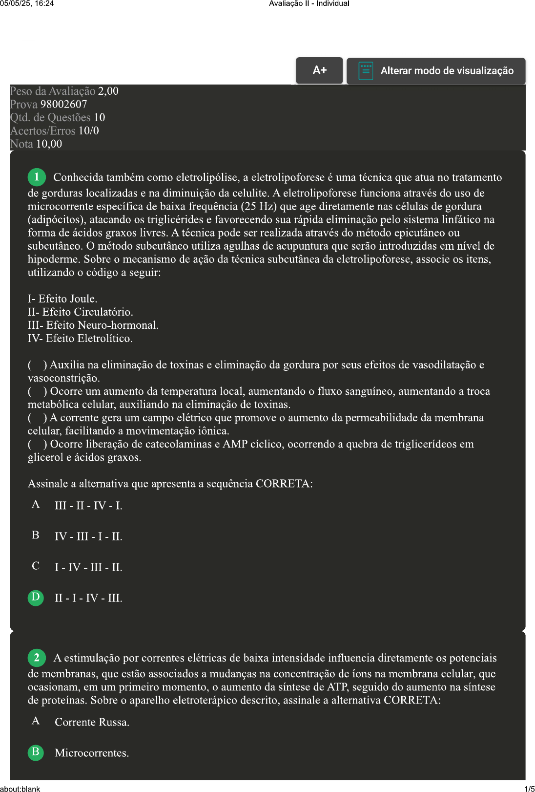 05/05/25, 16:24 Avaliação Individual A+ Alterar modo de visualização Peso da Avaliação 2,00 Prova 98002607 Qtd. de Questões 10 Acertos/Erros 10/0 Nota 10,00 1 Conhecida também como eletrolipólise, a eletrolipoforese é uma técnica que atua no tratamento de gorduras localizadas e na diminuição da celulite. A eletrolipoforese funciona através do uso de microcorrente específica de baixa frequência (25 Hz) que age diretamente nas células de gordura (adipócitos), atacando os triglicérides e favorecendo sua rápida eliminação pelo sistema linfático na forma de ácidos graxos livres. A técnica pode ser realizada através do método epicutâneo ou subcutâneo. O método subcutâneo utiliza agulhas de acupuntura que serão introduzidas em nível de hipoderme. Sobre mecanismo de ação da técnica subcutânea da eletrolipoforese, associe os itens, utilizando código a seguir: I- Efeito Joule. II- Efeito Circulatório. III- Efeito Neuro-hormonal. IV-Efeito Eletrolítico. ( ) Auxilia na eliminação de toxinas e eliminação da gordura por seus efeitos de vasodilatação e vasoconstrição. ( ) Ocorre um aumento da temperatura local, aumentando fluxo sanguíneo, aumentando a troca metabólica celular, auxiliando na eliminação de toxinas. ( ) A corrente gera um campo elétrico que promove aumento da permeabilidade da membrana celular, facilitando a movimentação ionica. ( ) Ocorre liberação de catecolaminas e AMP cíclico, ocorrendo a quebra de triglicerídeos em glicerol e ácidos graxos. Assinale a alternativa que apresenta a sequência CORRETA: A B IV III - I II. C I - IV - III II. D II - I - IV - III. 2 A estimulação por correntes elétricas de baixa intensidade influencia diretamente os potenciais de membranas, que estão associados a mudanças na concentração de na membrana celular, que ocasionam, em um primeiro momento, aumento da síntese de ATP, seguido do aumento na síntese de proteínas. Sobre aparelho eletroterápico descrito, assinale a alternativa CORRETA: A Corrente Russa. B Microcorrentes. about:blank 1/505/05/25, 16:24 Avaliação Individual C Eletroestimulação Neuromuscular. D Eletrolipoforese. 3 [Laboratório Virtual Eletroterapia Corporal Tratamento de Flacidez Tissular e Gordura Localizada] A dosagem do aparelho de Radiofrequência está relacionada à sensibilidade, hiperemia e limiar de dor, e a temperatura está relacionada à disfunção estética a ser tratada, sendo indicada a temperatura de 40 a 42 °C para flacidez tissular e gordura localizada. Sobre exposto e de acordo com a atividade realizada através do laboratório virtual, assinale a alternativa CORRETA: Para atingir a temperatura ideal de tratamento, deve-se começar a aplicação com a menor intensidade e atingir a temperatura ideal lentamente. B Para atingir a temperatura ideal de tratamento, deve-se começar a aplicação com a menor intensidade e atingir a temperatura ideal rapidamente. C Para atingir a temperatura ideal de tratamento, deve-se começar a aplicação com a maior intensidade possível e atingir a temperatura ideal lentamente. D Para atingir a temperatura ideal de tratamento, deve-se começar a aplicação com intensidade média e aplicar sobre a região total a ser tratada. 4 A corrente galvânica é uma das correntes mais aplicadas e conhecidas em eletroterapia, caracterizada por ser uma corrente contínua, que mantém sempre a mesma intensidade, tanto em valor quanto em direção, e unidirecional, cujo funcionamento depende da presença de dois eletrodos (positivo e negativo) e do contato com paciente. Essa corrente possui polo positivo e negativo, que proporciona a movimentação de íons. Com relação à corrente galvânica, analise as sentenças a seguir: I- O polo negativo atrai líquido (hidratante) e positivo repele os líquidos (drenante). II- O efeito da ação vasomotora e trófica da corrente galvânica é resultado do estímulo da circulação e do movimento ionico intracelular. III- Não deve ser utilizada a corrente galvânica em pacientes portadores de marca-passos e nem em pacientes portadores de implantes metálicos. IV- É contra indicado uso da corrente galvânica em pacientes sobre tratamento de hiperidrose, já que pode ocorrer queimadura tecidual. Agora, assinale a alternativa CORRETA: A As sentenças I, II e III estão corretas. B As sentenças I e IV estão corretas. C As sentenças I, III e IV estão corretas. D As sentenças II e IV estão corretas. 5 O uso do ozônio é uma técnica terapêutica milenar que consiste na aplicação de ozônio medicinal no corpo humano para tratar inúmeras doenças. Atualmente, muito tem se falado sobre os about:blank 2/505/05/25, 16:24 Avaliação Individual inúmeros benefícios do ozônio ao organismo. Até mesmo em clínicas de estética e spas tem-se feito uso dessas terapias, como é exemplo de banhos de ozônio, ofurô, saunas. Sobre equipamento eletroterápico que gera a formação de ozônio quando aplicado, assinale a alternativa CORRETA: A Radiofrequência. B Iontoforese. C Alta frequência. D Desincruste. 6 O mercado estético lança quase todos os dias um equipamento ou uma técnica nova, por isso os profissionais estéticos devem compreender os efeitos fisiológicos, as indicações e as contraindicações da aplicação de cada aparelho eletroterápico. Apenas desse modo, poderá então optar por qual recurso é mais eficiente para cada disfunção estética. Sobre a técnica de microcorrentes, analise as sentenças a seguir: I- Tem por objetivo aumentar a síntese de ATP, melhorando a cicatrização de feridas. II- Promove uma regeneração celular, pois aumenta metabolismo local. III- Auxilia na eliminação de toxinas e na eliminação da gordura. IV- Promove aumento da produção dos fibroblastos, que resulta na melhora da flacidez muscular. Assinale a alternativa CORRETA: A As sentenças I e II estão corretas. B As sentenças III e IV estão corretas. C As sentenças II e III est