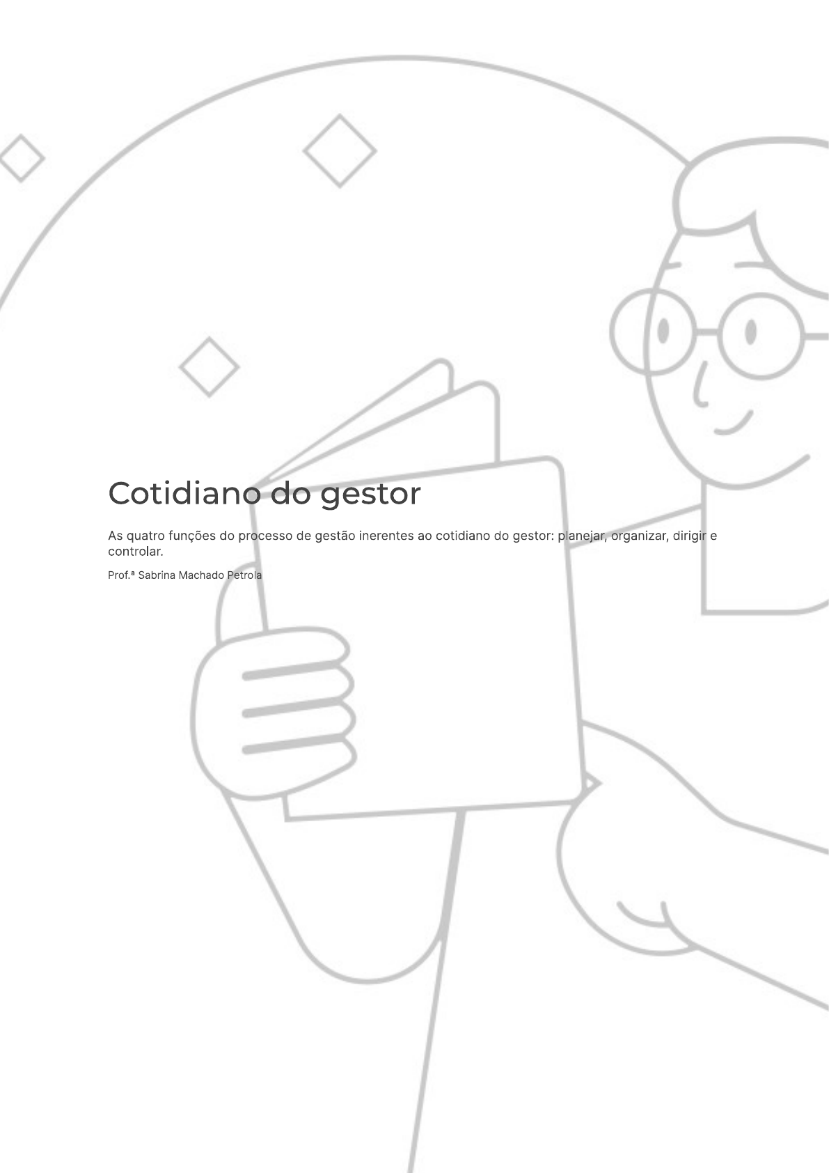 Cotidiano do gestor As quatro funções do processo de gestão inerentes ao cotidiano do gestor: planejar, organizar, dirigir e controlar. Sabrina Machado Petrola1. Itens iniciais Propósito Interpretar os objetivos propostos pela organização e traduzi-los em ação será parte do seu trabalho como futuro gestor, ao planejar, organizar, dirigir e controlar. Objetivos Reconhecer a importância da função planejamento para a gestão. Identificar a função organização como parte do processo de gestão. Descrever o papel do gestor como líder de uma organização. Definir a função de controle nas organizações contemporâneas. Introdução A gestão e a informática eram assuntos nos quais, geralmente, gestores e analistas de sistema trabalhavam no passado. Entretanto, nos dias atuais, tais assuntos são cada vez mais comuns em diversas profissões, independentemente do nível hierárquico. No caso da gestão, seja para um diretor de uma grande empresa, para um dono de pequeno restaurante ou, ainda, para um criador de jogos on-line, os fundamentos dessa área são praticamente os mesmos: planejar, organizar, liderar e controlar. No cotidiano da gestão, antes de começar a executar, é importante planejar: analisar o ambiente (interno e externo) e definir metas e caminhos para atingi-las. Depois, distribuir e organizar os recursos (tempo, pessoas, dinheiros, equipamentos etc.) e as responsabilidades por toda organização, seja ela pequena ou grande. Depois do planejamento e da organização, é hora de executar o que está no papel. Para isso, conhecer as técnicas e a arte da liderança é essencial, a fim de que as pessoas trabalhem alinhadas ao que foi planejado e os resultados sejam alcançados. E por falar em resultados e performance, é necessário controle! controle deve ser feito antes, durante e depois do processo gerencial, para conferir se o que planejamos foi alcançado, bem como para fazer melhorias. Como dizia o guru da administração Peter Drucker: "Se não pode medir, não pode gerenciar".1. Planejamento Função planejamento que é planejar? Diferentemente do que muitos podem imaginar, planejar não é tentar prever o futuro. Na verdade, é o processo pelo qual as pessoas e as organizações preparam-se para enfrentá-lo, afinal, os contextos dinâmicos e permeados de incertezas, que ora atuamos, exigem que se defina para onde devemos caminhar e como chegaremos lá. Preparar-se para o futuro faz parte do cotidiano de qualquer gestor, independentemente da sua área de atuação Experimente observar o trabalho de algum gestor e logo perceberá que, para alcançar os objetivos desejados, a função dele é decidir o que será feito e quando será feito aquilo que é necessário. No contexto organizacional, tais decisões são essenciais para que uma organização cresça de forma sustentável e sobreviva a longo prazo. Em uma definição bem simples: o ato de planejar, como parte integrante do processo de gestão, é decidir o que será feito hoje para atingir o que desejamos no futuro. E sobre a função planejamento, segundo Sobral e Peci (2008) é: A função responsável pela definição dos objetivos da organização e pela concepção de planos que integram e coordenam suas atividades. (SOBRAL; PECI, 2008, p. 132) Ainda que nosso objetivo seja compreender a função planejamento no contexto da gestão, convido-o a pensar sobre como o planejamento faz parte de nossas vidas, afinal, todas as pessoas utilizam técnicas do processo de planejamento em situações de seu cotidiano. planejamento envolve definir meios para alcançar objetivos em um dado período projetado no futuro. Vamos ver essa premissa se realizando em um exemplo cotidiano de planejamento!Pense nas comemorações de Ano-Novo na sua família. É preciso definir o que será feito, quem será convidado, onde a reunião ocorrerá e o que será servido para que, no dia da festa, tudo esteja perfeito. Certo? Percebeu agora, nesse exemplo do dia a dia, como o planejamento envolve definir meios para alcançar objetivos em um dado período projetado no futuro? Aposto que disse sim! Dentro da realidade das organizações, esses objetivos são o propósito, as intenções ou os estados futuros que precisamos atingir. Você deve estar se perguntando: como faremos isso? Ajudaremos você a responder: os planos, decorrentes do processo de planejamento, serão os guias que nos orientarão nessa direção. Vamos aprender mais sobre o assunto! O processo de planejamento é fundamental para as organizações que atuam em ambientes de elevada competição, uma vez que nos ajuda a: Conquistar mercados. Reter nossos clientes atuais. Lidar com os fornecedores. Atender às expectativas do governo. Contribuir com a comunidade em que estamos inseridos. Acompanhar as tendências na área de tecnologia. Refletir as mudanças culturais da sociedade. Garantir a atração de talentos capazes de entregar os resultados desejáveis. Investir em planejamento traz inúmeras vantagens, vejamos algumas: Maximização da eficiência Foco Maximiza que uso dos Mantém foco nos esforcos ao estabelecendo prioridades promover inte gração das atividades Todos Senso de direção seguem na mesma direção para que decisões sejam tomadas Proporciona senso de direção conformidade com aquilo ele nos indica quais que planejado caminhos devemos seguir dire- cionando esforços para um objetivo comum. VANTAGENS DO PLANEJAMENTO Alinhamento Promove alinhamento da soas aos organizacionais, esclarecendo - Autoconhecimento 7 organizacional comportamento considerado Potencializa autoconhecimento estratégicos se possa organizacional, ao ana alcançar tais propósitos Definição de parâmetros empresa passa contexto Define de controle em atua estabelecemos ob jetivos conhecemos de desempenho desejáveis, que subsidiarão o controle Além disso, o planejamento nos ajuda a sair da rotina da operação diária para se concentrar no futuro da organização