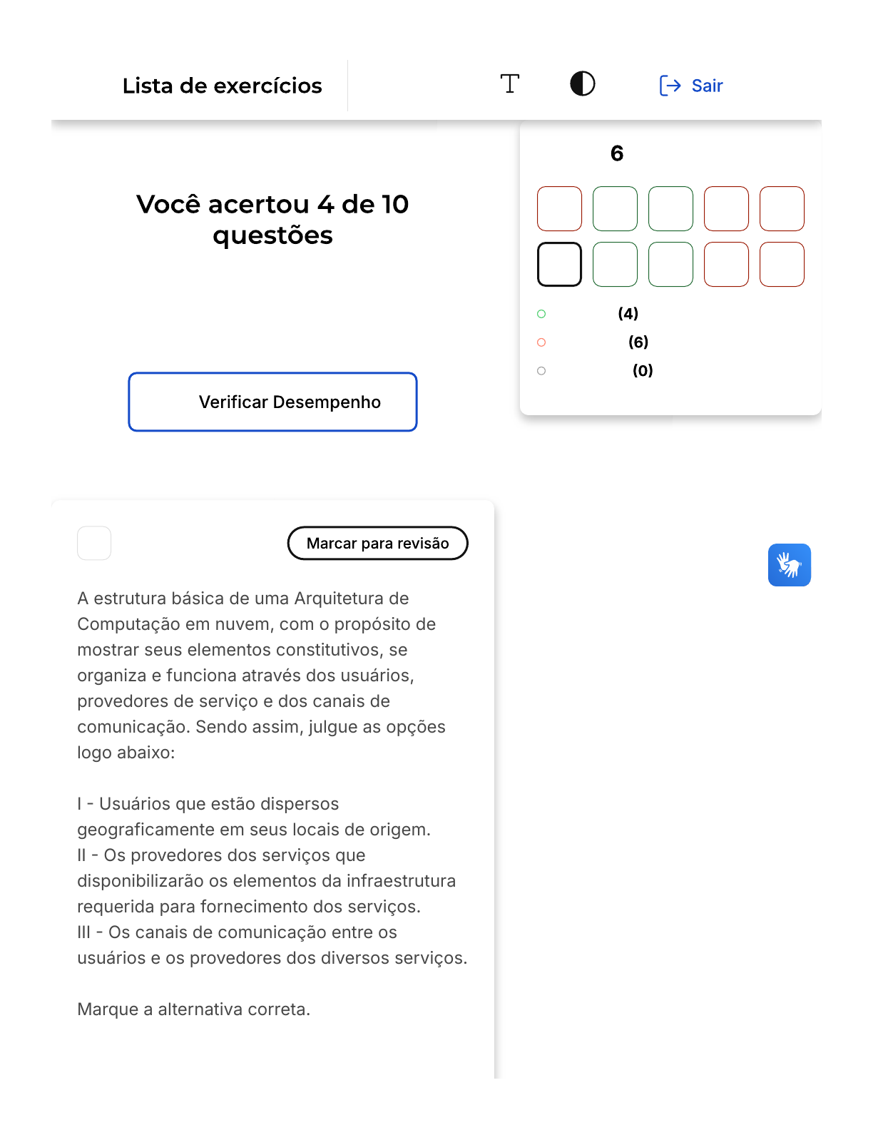 Verifique o seu desempenho e continue treinando! Você pode refazer o exercício quantas vezes quiser. 1 A estrutura básica de uma Arquitetura de Computação em nuvem, com o propósito de mostrar seus elementos constitutivos, se organiza e funciona através dos usuários, provedores de serviço e dos canais de comunicação. Sendo assim, julgue as opções logo abaixo: I � Usuários que estão dispersos geograficamente em seus locais de origem. II � Os provedores dos serviços que disponibilizarão os elementos da infraestrutura requerida para fornecimento dos serviços. III � Os canais de comunicação entre os usuários e os provedores dos diversos serviços. Marque a alternativa correta. Questão de 10 Corretas Incorretas Em branco 1 2 3 4 5 6 7 8 9 10 Arquitetura… Firefox https://estacio.saladeavaliacoes.com.br/exercicio/68464470f464610f1c... 1 of 19 08/06/2025, 23:18 A B C D E Apenas o item I está correto. Os itens I e III estão corretos. Apenas o item III está correto. Os itens I, II e III estão corretos. Os itens II e III estão corretos. Opa! A alternativa correta é a letra D. Confira o gabarito comentado! Firefox https://estacio.saladeavaliacoes.com.br/exercicio/68464470f464610f1c... 2 of 19 08/06/2025, 23:18 A A Computação em nuvem possui uma arquitetura que deve evidenciar e detalhar os aspectos inerentes à sua funcionalidade, como a organização de seus elementos funcionais e as ações necessárias para realizar a atividade de Computação em nuvem. A estrutura básica dessa arquitetura é composta por usuários, que podem estar geograficamente dispersos; provedores de serviços, que disponibilizam os elementos da infraestrutura necessária para o fornecimento dos serviços; e os canais de comunicação, que permitem a interação entre os usuários e os provedores de serviços. Portanto, os itens I, II e III estão corretos, o que torna a alternativa D a resposta correta para a questão. 2 A infraestrutura de computação em nuvem permite que sejam desenvolvidos diversos tipos de aplicações altamente escaláveis e com alta disponibilidade. A infraestrutura de computação em nuvem típica é dividida em camadas. Apresente quais são as três principais camadas de serviço da infraestrutura de nuvem típica? Camada de servidor, camada de armazenamento e camada de rede. Firefox https://estacio.saladeavaliacoes.com.br/exercicio/68464470f464610f1c... 3 of 19 08/06/2025, 23:18 B C D E Camada de gerenciamento, camada de segurança e camada de armazenamento. Camada de aplicativos, camada de gerenciamento e camada de armazenamento. Camada de virtualização, camada de gerenciamento e camada de armazenamento. Camada de computação, camada de armazenamento e camada de gerenciamento. Parabéns, você selecionou a alternativa correta. Confira o gabarito comentado! As três principais camadas de serviço da infraestrutura em nuvem típica são: a camada de servidor, a camada de armazenamento e a camada de rede. A camada de servidor é composta por servidores virtuais, servidores físicos ou uma combinação de ambos. A camada de armazenamento engloba sistemas de arquivos, bancos de dados e outros tipos de armazenamento. Por fim, a camada de rede inclui serviços de conectividade, segurança e gerenciamento de aplicativos. Essas camadas trabalham em conjunto Firefox https://estacio.saladeavaliacoes.com.br/exercicio/68464470f464610f1c... 4 of 19 08/06/2025, 23:18 A B C D E para fornecer uma infraestrutura de computação em nuvem eficiente e escalável, permitindo o desenvolvimento de aplicações com alta disponibilidade. 3 Na arquitetura de computação em nuvem, um dos serviços existentes no back-end é o serviço de armazenamento na nuvem. Como esse serviço pode ser utilizado? Para descartar backups automáticos de arquivos Para gerenciar escalabilidade de recursos em nuvem Para garantir a segurança de dados em nuvem Para compartilhar arquivos entre diferentes usuários e dispositivos Para automatizar tarefas de gerenciamento de redes Firefox https://estacio.saladeavaliacoes.com.br/exercicio/68464470f464610f1c... 5 of 19 08/06/2025, 23:18 Parabéns, você selecionou a alternativa correta. Confira o gabarito comentado! O serviço de armazenamento na nuvem é uma ferramenta essencial na arquitetura de computação em nuvem. Ele permite que os usuários armazenem e acessem arquivos de maneira remota, independentemente de onde estejam fisicamente. Isso significa que os usuários podem acessar seus arquivos de qualquer lugar, desde que tenham uma conexão com a internet e as credenciais de acesso corretas. Além disso, este serviço também possibilita o compartilhamento de arquivos com outros usuários, independentemente de onde eles estejam. Isso facilita a colaboração eficiente em projetos e tarefas em equipe. Esta funcionalidade é especialmente útil para empresas ou equipes que trabalham em diferentes locais, pois permite que eles compartilhem arquivos de maneira segura e fácil. Portanto, a alternativa D, "Para compartilhar arquivos entre diferentes usuários e dispositivos", é a resposta correta. 4 Os diversos provedores de computação em nuvem podem oferecer uma infinidade de Firefox https://estacio.saladeavaliacoes.com.br/exercicio/68464470f464610f1c... 6 of 19 08/06/2025, 23:18 A B C D E serviços para as empresas e/ou usuários, com características distintas, mas quando falamos do armazenamento de arquivos algumas funcionalidades são necessárias. Com base nesse tipo de serviço, assinale a afirmação que apresenta uma definição correta sobre o serviço de armazenamento em nuvem. Serviços de armazenamento na nuvem só permitem armazenar arquivos de texto. Serviços de armazenamento na nuvem só podem ser acessados por usuários em determinadas localizações geográficas. Serviços de armazenamento na nuvem não permitem que os usuários compartilhem arquivos com outros usuários. Serviços de armazenamento na nuvem não oferecem recursos de b