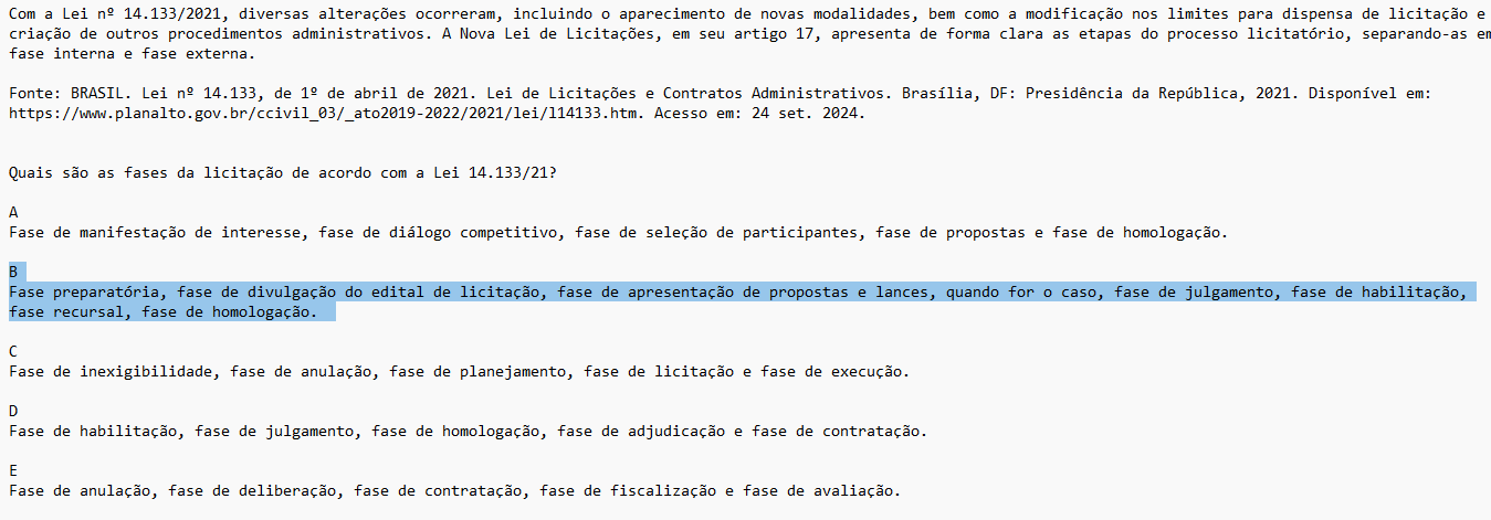Com a Lei n° 14.133/2021, diversas alterações ocorreram, incluindo o aparecimento de novas modalidades, bem como a modificação nos limites para dispensa de licitação e criação de outros procedimentos administrativos. A Nova Lei de Licitações, em seu artigo 17, apresenta de forma clara as etapas do processo licitatório, separando-as en fase interna e fase externa. Fonte: BRASIL. Lei n° 14.133, de 1° de abril de 2021. Lei de Licitações e Contratos Administrativos. Brasília, DF: Presidência da República, 2021. Disponível em: em: 24 set. 2024. Quais são as fases da licitação de acordo com a Lei 14.133/21? A Fase de manifestação de interesse, fase de diálogo competitivo, fase de seleção de participantes, fase de propostas e fase de homologação. B Fase preparatória, fase de divulgação do edital de licitação, fase de apresentação de propostas e lances, quando for o caso, fase de julgamento, fase de habilitação, fase recursal, fase de homologação. Fase de inexigibilidade, fase de anulação, fase de planejamento, fase de licitação e fase de execução. D Fase de habilitação, fase de julgamento, fase de homologação, fase de adjudicação e fase de contratação. E Fase de anulação, fase de deliberação, fase de contratação, fase de fiscalização e fase de avaliação.