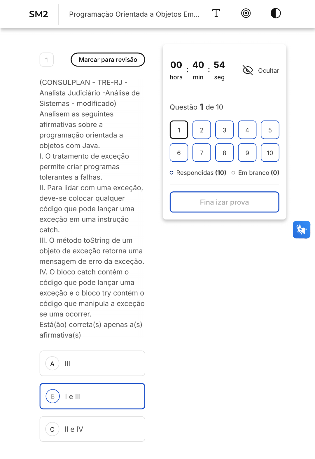 SM2 Programação Orientada a Objetos Em... T 1 Marcar para revisão 00 : 40 : 54 Ocultar hora min seg (CONSULPLAN - TRE-RJ - Analista Judiciário -Análise de Sistemas - modificado) Questão 1 de 10 Analisem as seguintes afirmativas sobre a 1 2 3 4 5 programação orientada a objetos com Java. 6 7 8 9 10 I. O tratamento de exceção permite criar programas Respondidas (10) Em branco (0) tolerantes a falhas. II. Para lidar com uma exceção, deve-se colocar qualquer Finalizar prova código que pode lançar uma exceção em uma instrução catch. III. O método toString de um objeto de exceção retorna uma mensagem de erro da exceção. IV. O bloco catch contém o código que pode lançar uma exceção e o bloco try contém o código que manipula a exceção se uma ocorrer. Está(ão) correta(s) apenas a(s) afirmativa(s) A III B e III C e IVD I, III e IV E 2 Marcar para revisão (CESPE/CEBRASPE - TRE-MA - Técnico Judiciário - Programação de Sistemas) Um objeto de exceção possui, na linguagem Java, o método: A ). B Getchvar(). C D E getMessage(). 3 Marcar para revisão (INSTITUTO AOCP -IBGE - Analista Censitário -Análise de Sistemas -Desenvolvimento de Aplicações Web Mobile -2019) Ao se implementar programas de computador em Java, hápossibilidade de ocorrerem erros imprevistos durante sua execução. Esses erros são conhecidos como Sabendo disso, considere que Márcio está fazendo uma operação em um banco de dados, porém essa operação dispara uma exceção de que o campo que ele está manipulando para inserir nesse banco está vazio, ou seja, acontece um NullPointerException. problema, nesse caso, é a conexão com o banco de dados ficar aberta, o que não pode acontecer. Assim, assinale a alternativa que apresenta o bloco/código no qual deve ser inserida essa operação de fechamento da conexão com o banco de dados. A if B else C try D catch E finally4 Marcar para revisão (UNIRIO - Técnico de Tecnologia da Informação -2019) Em Java, a palavra-chave throws é usada para: Causar uma exceção A e fornecer seus argumentos. Especificar os B métodos que tratarão uma dada exceção. Causar a exceção que C está sendo tratada. Especificar um código a ser executado, após D qualquer tratamento de exceção no bloco. Especificar os tipos de exceções que um E dado método pode causar. 5 Marcar para revisão (CESPE - INMETRO - Pesquisador - Ciência da Computação - 2010) Em relação ao uso de threads nalinguagem Java, assinale a opção correta: O método yield é utilizado para forçar A um thread a entrar no modo de suspensão. O método join é utilizado para garantir que determinado B thread não seja executado até que outro tenha entrado no estado inativo. Uma classe pode definir tanto métodos C quanto variáveis sincronizadas. Métodos static não D podem ser synchronized. Todo thread recebe uma prioridade padrão que é igual ao menor nível de E prioridade possível. Para configurar essa prioridade, pode ser utilizado o método setPriority.6 Marcar para revisão (CESGRANRIO - BNDES - Profissional Básico - Análise de Sistemas - 2011) Os usuários de um sistema Web, desenvolvido em Java, reclamam de erros nos dados consultados. A equipe técnica, ao analisar a situação, concluiu que determinado método M está sendo invocado, simultaneamente, por diferentes threads. Considerando que não há manipulação de locks no restante do sistema, o que pode ser feito para que M seja executado, em dado momento, somente por uma thread? Ajustar o firewall de A borda para permitir uma conexão por IP. Implementar connection pooling no B acesso ao banco de dados. Utilizar a keyword C lockable no bloco de M.Declarar o método M D como synchronized. Reescrever M em E Assembly, necessariamente. 7 Marcar para revisão (UFF - COSEAC - Analista de Tecnologia da Informação - 2015) Na linguagem Java, uma thread executável pode entrar em um determinado estado por um intervalo de tempo específico, retornando ao estado executável quando for notificada por outra thread ou quando esse intervalo expirar. Essa situação caracteriza o seguinte estado: A Cancelado B Bloqueado C Espera sincronizada D Novo E Terminado8 Marcar para revisão Com o surgimento do DAO foi possível padronizar a forma com que as operações sobre o banco de dados são implementadas, o que levou à definição de ferramentas como o JPA, onde a obtenção de uma coleção de entidades, a partir da consulta através de sintaxe JPQL, ocorre com base no método: A getResultList B createEntityManager C getEntityManager D createResultList E createNamedQuery 9 Marcar para revisão Entre as ferramentas de produtividade do NetBeans, temos uma que permite gerar classes de controle JPA, de forma automatizada, a partir das entidades, concentrando todos os métodos necessáriospara encapsular as operações DML. No caso da remoção de um registro, qual seria o método oferecido pela classe de controle? A destroy B merge C create D edit E persist 10 Marcar para revisão padrão DAO surgiu para resolver um problema recorrente em sistemas cadastrais, onde comandos SQL dispersos, em meio ao código do aplicativo, diminuem o reuso e aumentam a dificuldade de manutenção. Esse padrão tem como objetivo concentrar os comandos SQL em classes específicas, onde o método alterar, por exemplo, receberia uma entidade como parâmetro e invocaria um comando do tipo:A CREATE B INSERT C DELETE D SELECT E UPDATE
