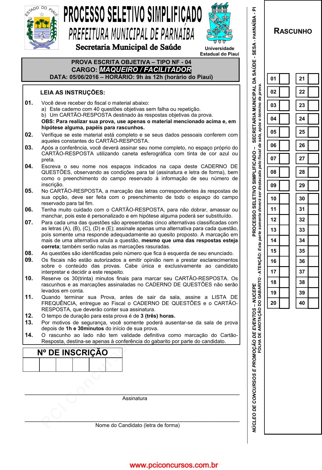 pcimarkpci MDAwMDowMDAwOjAwMDA6MDAwMDowMDAwOmZmZmY6OTU0ZTpiOWI2:U3VuLCAyMiBKdW4gMjAyNSAxNDozMTozNSAtMDMwMA== www.pciconcursos.com.br PROVA ESCRITA OBJETIVA – TIPO NF - 04 CARGO: MAQUEIRO / FACILITADOR DATA: 05/06/2016 – HORÁRIO: 9h às 12h (horário do P iauí) LEIA AS INSTRUÇÕES: 01. Você deve receber do fiscal o material abaixo: a) Este caderno com 40 questões objetivas sem falha ou repetição. b) Um CARTÃO-RESPOSTA destinado às respostas objetivas da prova. OBS: Para realizar sua prova, use apenas o material menci onado acima e, em hipótese alguma, papéis para rascunhos. 02. Verifique se este material está completo e se seus dados pessoais conferem com aqueles constantes do CARTÃO-RESPOSTA. 03. Após a conferência, você deverá assinar seu nome completo, no espaço próprio do CARTÃO-RESPOSTA utilizando caneta esferográfica com tinta de cor azul ou preta. 04. Escreva o seu nome nos espaços indicados na capa deste CADERNO DE QUESTÕES, observando as condições para tal (assinatura e letra de forma), bem como o preenchimento do campo reservado à informação de seu número de inscrição. 05. No CARTÃO-RESPOSTA, a marcação das letras correspondentes às respostas de sua opção, deve ser feita com o preenchimento de todo o espaço do campo reservado para tal fim. 06. Tenha muito cuidado com o CARTÃO-RESPOSTA, para não dobrar, amassar ou manchar, pois este é personalizado e em hipótese alguma poderá ser substituído. 07. Para cada uma das questões são apresentadas cinco alternativas classificadas com as letras (A), (B), (C), (D) e (E); assinale apenas uma alternativa para cada questão, pois somente uma responde adequadamente ao quesito proposto. A marcação em mais de uma alternativa anula a questão, mesmo que uma das respostas esteja correta ; também serão nulas as marcações rasuradas. 08. As questões são identificadas pelo número que fica à esquerda de seu enunciado. 09. Os fiscais não estão autorizados a emitir opinião nem a prestar esclarecimentos sobre o conteúdo das provas. Cabe única e exclusivamente ao candidato interpretar e decidir a este respeito. 10. Reserve os 30(trinta) minutos finais para marcar seu CARTÃO-RESPOSTA. Os rascunhos e as marcações assinaladas no CADERNO DE QUESTÕES não serão levados em conta. 11. Quando terminar sua Prova, antes de sair da sala, assine a LISTA DE FREQUÊNCIA, entregue ao Fiscal o CADERNO DE QUESTÕES e o CARTÃO- RESPOSTA, que deverão conter sua assinatura. 12. O tempo de duração para esta prova é de 3 (três) horas. 13. Por motivos de segurança, você somente poderá ausentar-se da sala de prova depois de 1h e 30minutos do início de sua prova. 14. O rascunho ao lado não tem validade definitiva como marcação do Cartão- Resposta, destina-se apenas à conferência do gabarito por parte do candidato. Nº DE INSCRIÇÃO ____________________________________________________________ Assinatura ____________________________________________________________ Nome do Candidato (letra de forma) Universidade Estadual do Piauí RASCUNHO 01 21 02 22 03 23 04 24 05 25 06 26 07 27 08 28 09 29 10 30 11 31 12 32 13 33 14 34 15 35 16 36 17 37 18 38 19 39 20 40 N Ú C LE O D E C O N C U R S O S E P R O M O Ç Ã O D E E V E N T O S – N U C E P E P R O C E S S O S E LE T IV O S IM P LI F IC A D O – S E C R E T A R IA M U N IC IP A L D A S A Ú D E - S E S A - P A R N A ÍB A - P I F O LH A D E A N O T A Ç Ã O D O G A B A R IT O - A T E N Ç Ã O : E st a pa rt e so m en te d ev er á se r de st ac ad a pe lo fi sc al d a sa la , a pó s o té rm in o da p ro va . www.pciconcursos.com.br pcimarkpci MDAwMDowMDAwOjAwMDA6MDAwMDowMDAwOmZmZmY6OTU0ZTpiOWI2:U3VuLCAyMiBKdW4gMjAyNSAxNDozMTozNSAtMDMwMA== www.pciconcursos.com.br PROCESSO SELETIVO SIMPLIFICADO – SECRETARIA MUNICIP AL DA SAÚDE - SESA - PARNAÍBA /PI – CARGO: MAQUEIRO/ FACILITADOR 2 N º D E I N S C R I Ç Ã O www.pciconcursos.com.br pcimarkpci MDAwMDowMDAwOjAwMDA6MDAwMDowMDAwOmZmZmY6OTU0ZTpiOWI2:U3VuLCAyMiBKdW4gMjAyNSAxNDozMTozNSAtMDMwMA== www.pciconcursos.com.br PROCESSO SELETIVO SIMPLIFICADO – SECRETARIA MUNICIP AL DA SAÚDE - SESA - PARNAÍBA /PI – CARGO: MAQUEIRO/ FACILITADOR 3 LÍNGUA PORTUGUESA Leia o texto que segue para responder às questões d e 01 a 07. Estilo de vida saudável abre espaço para mercado de produtos naturais A cada ano, a procura por produtos naturais faz com que o consumidor tenha mais opções de escolha. Uma alimentação saudável traz benefícios para a vida. Além das vitaminas das frutas, verduras e produtos naturais, já foi comprovado que a alimentação saudável é essencial no combate a doenças como hipertensão, diabetes e dos problemas cardiovasculares. Pensando nisso, as pessoas estão cada vez mais em busca de produtos para serem acrescentados às refeições diárias, como uma maneira de prevenção de doenças e busca de qualidade de vida. [...] (Jornal O Dia – O Dia Domingo – Diversidade. Editora: Biá Boakari e Virgiane Passos. Por Aldenora Cavalcante. Teresina, 21 de fevereiro de 2016.) QUESTÃO 01 _______________________________________________________________________ O título do texto Estilo de vida saudável abre espaço para mercado de produtos naturais chama a atenção para a) um novo ramo de negócio que surge e se expande em função de novos hábitos de vida. b) um antigo e esquecido mercado de consumo. c) uma forma de vida por muitos rejeitada. d) um negócio que se expande em função dos recursos financeiros da população. e) uma forma de viver por muitos desejada. QUESTÃO 02 _______________________________________________________________________ O texto ressalta a relação entre alimentação e a) hábitos naturais. b) produtos a serem evitados para consumo. c) saúde dos idosos. d) tanto ao combate às doenças quanto a sua prevenção. e) crenças populares sobre doenças. QUESTÃO 03 _______________________________________________________________________ O subtí