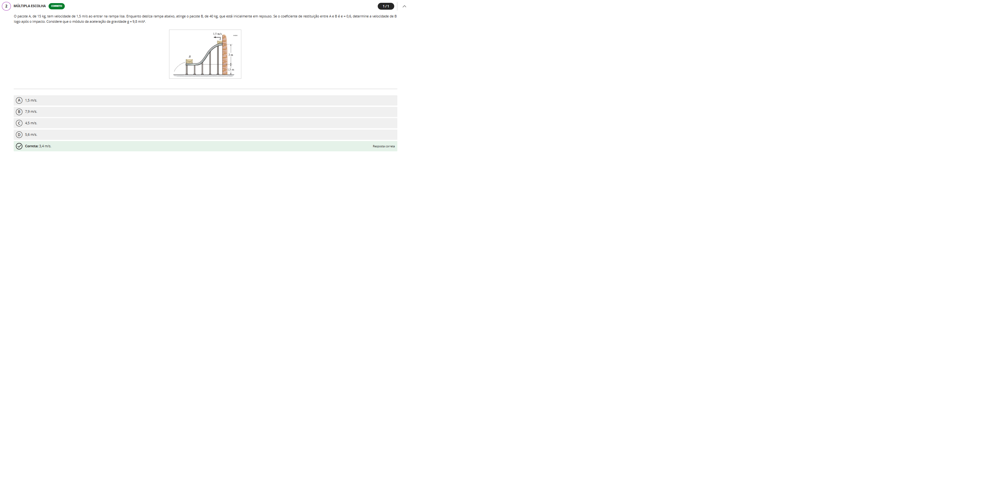 2 ESCOLHA CORRETO 1/1 pacote A, de 15 kg, tem velocidade de 1,5 m/s ao entrar na rampa lisa. Enquanto desliza rampa abaixo, atinge 0 pacote B, de 40 que está inicialmente em repouso. Se 0 coeficiente de restituição entre Ae B = 0,6, determine a velocidade de B logo após 0 impacto. Considere que 0 módulo da aceleração da gravidade g = 9,8 1.5 m/s ... 3 1.5 A 1,5 m/s. B 7,9 m/s. C 4,5 m/s. D 5,6 m/s. Correta: 3,4 m/s. Resposta correta