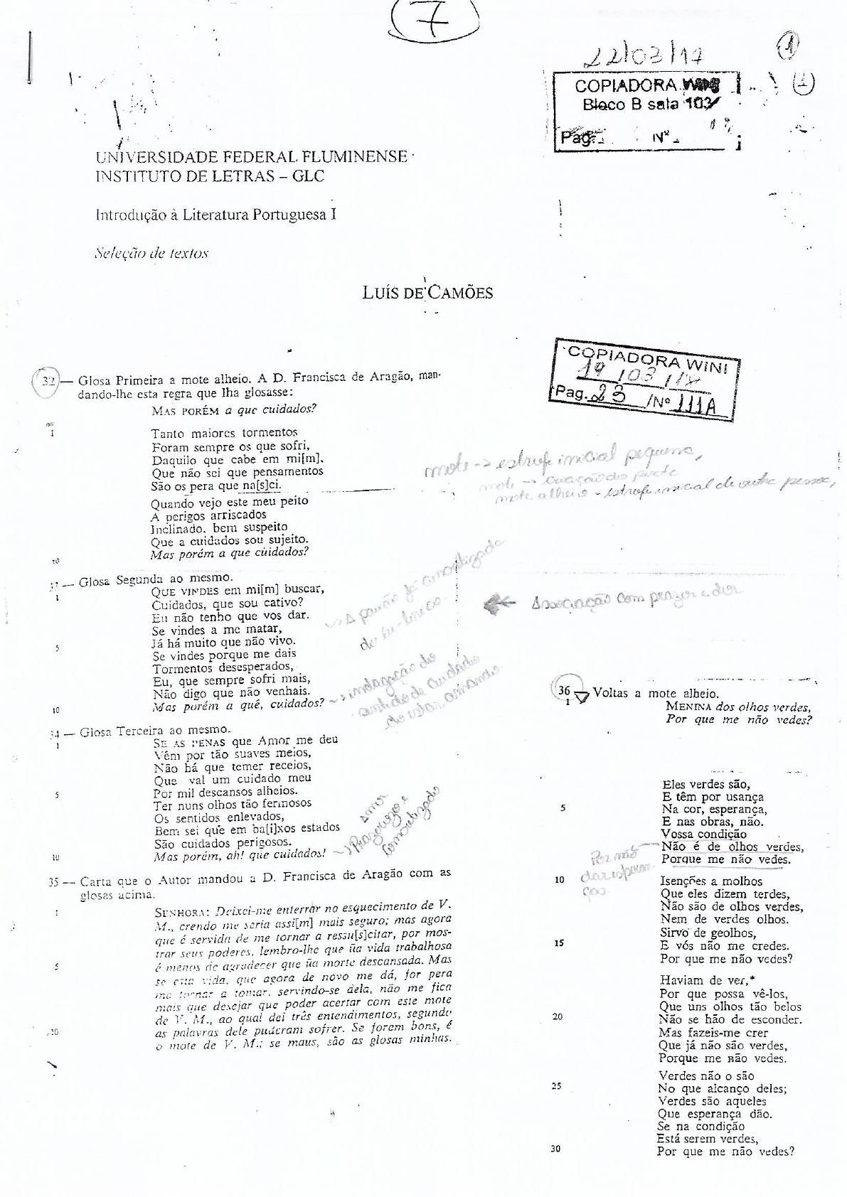 7 22/03/17 1 COPIADORA Blaco sala 103 UNIVERSIDADE FEDERAL FLUMINENSE INSTITUTO DE LETRAS GLC Introdução à Literatura Portuguesa I Seleção de textos LUÍS DE CAMÕES COPIADORA WINI 32 Glosa Primeira a mote alheio. A D. Francisca de Aragão, man- dando-lhe esta regra que lha glosasse: Pag. 23 MAS PORÉM a que cuidados? 111A Tanto maiores tormentos Foram sempre os que sofri, Daquilo que cabe em mi[m]. Que não sei que pensamentos São pera que na[s]ci. de Quando vejo este meu peito A perigos arriscados Inclinado. bem suspeito Que a cuidados sou sujeito. Mas porém a que Glosa Segunda ao mesmo. QUE VINDES em mi[m] buscar, Cuidados, que sou cativo? não tenho que vos dar. prazer der Se vindes a me matar, Já há muito que não vivo. 5 do Se vindes porque me dais Tormentos desesperados, Eu, que sempre sofri mais, Não digo que não venhais. 36 Voltas a mote Mas porém a qué, cuidados? 1 10 do MENINA dos olhos verdes, Por que me não vedes? Glosa Terceira ao mesmo. SE AS PENAS que Amor me deu Vêm por tão suaves meios, Não há que temer receios, Que val um cuidado meu Eles verdes são, 5 Por mil descansos alheios. Ter nuns olhos tão fermosos E têm por usança 5 Na cor, esperança, Os sentidos enlevados, E nas obras, não. Bem sei que em ba[i]xos estados Vossa condição São cuidados perigosos. 10 Não é de olhos verdes, Mas porém, ah! que cuidados! Porque me não vedes. 35 Carta que Autor mandou a D. Francisca de Aragão com as 10 Isenções a molhos glosas acima. Que eles dizem terdes, SENHORA: Deixci-me enterrar no esquecimento de V. Não são de olhos verdes, M., crendo me seria assi[m] mais seguro; mas agora Nem de verdes olhos. que servida de me a ressu[s]citar, por mos- Sirvo de geolhos, trar seus poderes. lembro-lhe que vida trabalhosa 15 E vós não me credes. é menos agradecer que morte descansada. Mas Por que me não vedes? vida. que agora de novo me dá, for pera Haviam de ver,* ma tomar. servindo-se dela, não me fica Por que possa vê-los, mais que desciar que poder acertar com este mote Que uns olhos tão belos de V. M., ao qual dei três entendimentos, segundo 20 Não se hão de esconder. 10 as palavras dele puderam sofrer. Se forem bons, Mas fazeis-me crer mote de V. M.; se maus, são as glosas minhas. Que já não são verdes, Porque me não vedes. Verdes não o são 25 No que alcanço deles; Verdes são aqueles Que esperança dão. Se na condição Está serem verdes, 30 Por que me não vedes?71 Redondilhas de rios que vão Não movereis a espessura, Por Babilônia, me achei, Nem podereis já trazer Onde sentado chorei Atrás vós a fonte pura, As lembranças de Sião Pois não pudestes mover 5 E quanto nela passei. Desconcertos da ventura. Ali, o rio corrente Ficareis oferecida De meus olhos foi manado; À Fama, que sempre vela, E, tudo bem comparado, Frauta de mi[m] tão querida; Babilônia ao mal presente, Porque, mudando-se a vida, 10 Sião ao tempo passado. 15 Se mudam gostos dela. Ali, lembranças contentes Acha a tenra mocidade Na alma se representaram; Prazeres acomodados, E minhas cousas ausentes E logo a maior idade Se fizeram tão presentes Já sente por pouquidade Como se nunca passaram. 90 15 Aqueles gostos passados. Ali, de[s]pois de acordado, Um gosto que hoje se alcança, Co rosto banhado em água, Amanhã já o não vejo: Deste sonho imaginado, Assi[m] nos traz a mudança Vi que todo o bem passado De esperança em esperança Não é gosto, mas é mágoa. 95 20 E de desejo em desejo. E vi que todos danos Mas em vida tão escassa Se causavam das mudanças Que esperança será forte? E as mudanças dos anos; Fraqueza da humana sorte, Onde vi quantos enganos Que quanto da vida passa 25 Faz o tempo às esperanças. 100 Está recitando a morte!* Ali vi o maior bem Mas deixar nesta espessura Quão pouco espaço que dura; O canto da mocidade! O mal quão depressa vem, Não cuide a gente futura E quão triste estado tem Que será obra da idade 30 Quem se fia da ventura. 105 O que é força da ventura. Vi aquilo que mais val, Que idade, tempo, o espanto Que então se entende melhor, De ver quão ligeiro passe, Quando mais perdido for; Nunca em mi[m] puderam tanto Vi [a]o bem suceder mal Que, posto que deixe canto, 35 E, [a]o mal, muito pior. 110 A causa dele deixasse. E vi com muito trabalho Comprar arrependimento. Mas em tristezas e nojos, Vi nenhum contentamento, Em gosto e contentamento, E vejo-me a mi[m], que espalho Por sol, por neve, por vento, 40 Tristes palavras ao vento. Terné presente a los ojos 115 Por quien muero tan contento. Bem são rios estas águas Com que banho este papel; Órgãos e frauta deixava, Bem parece ser cruel Despojo meu tão querido, Variedade de mágoas No salgueiro que ali estava, 45 E confusão de Babel. Que pera troféu ficava 120 De quem me tinha vencido. Como homem que, por exemplo Dos transes em que se achou, Mas lembranças da afeição De[s]pois que a guerra deixou, Que ali cativo me tinha, Pelas paredes do templo Me perguntaram então: 50 Suas armas pendurou; Que era da música minha 125 Que eu cantava em Sião? Assi[m], de[s]pois que assentei Que tudo o tempo gastava, Que foi daquele cantar Da tristeza que tomei, Das gentes tão celebrado? Nos salgueiros pendurei Por que o deixava de usar? 55 Os órgãos com que cantava. Pois sempre ajuda a passar 130 Qualquer trabalho passado. Aquele instrumento ledo Canta o caminhante ledo Deixei da vida passada, No caminho trabalhoso, Dizendo: Música amada, Por entre o espesso arvoredo; Deixo-vos neste arvoredo, E de noite o temeroso, 60 memória consagrada. 135 Cantando, refreia medo. Frauta minha que, tangendo, Canta preso docemente, Os montes faz[í]eis vir Os duros grilhões tocando; Pera onde estáveis, correndo, Canta segador contente, E as águas, que iam de[s]cendo, 65 E o trabalhador, cantando, Tornavam logo a subir, 140 O trabalho menos sente. Jamais vos não ouvirão Os tigres, que se amansavam; Eu, que estas cousas senti Na alma, de mágoas tão cheia, E as ovelhas